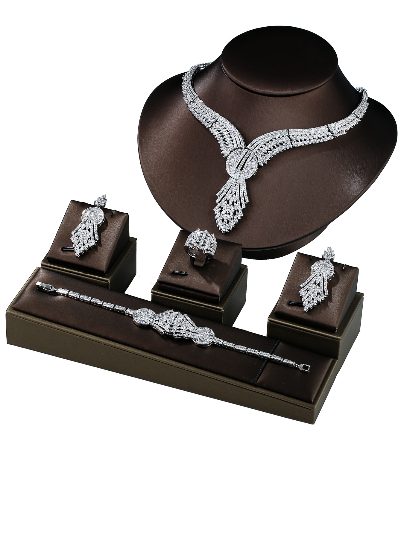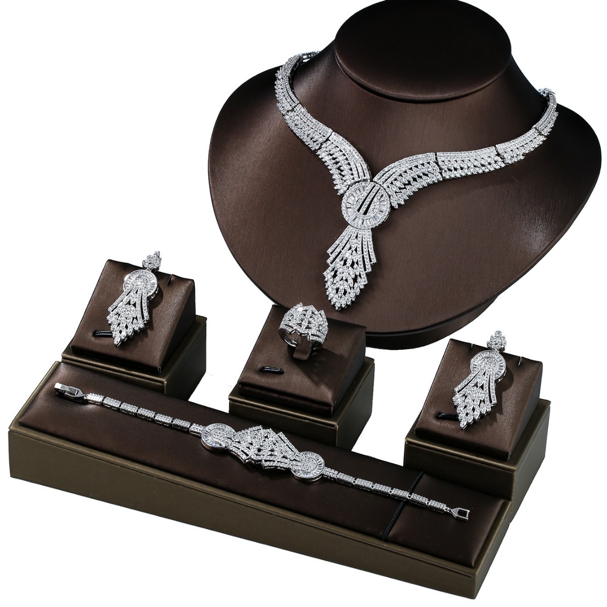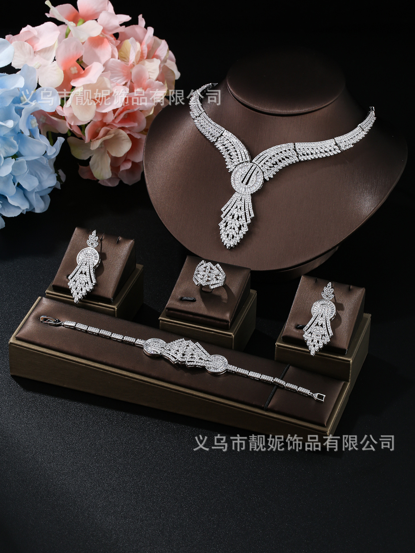 新款四件装新娘套装铜微镶锆石婚礼配饰项链耳环手链戒指