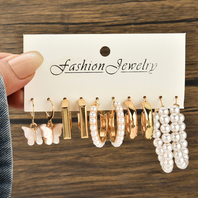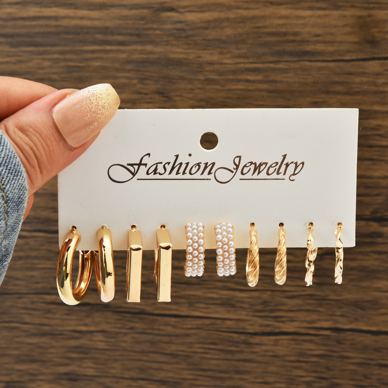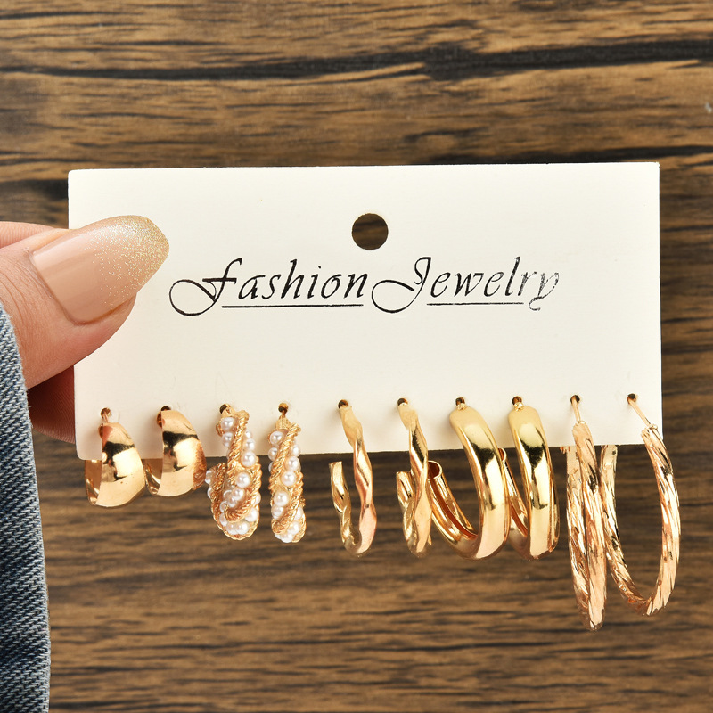 跨境热销复古金色几何女士耳环套装时尚珍珠耳圈耳饰批发Earrings
