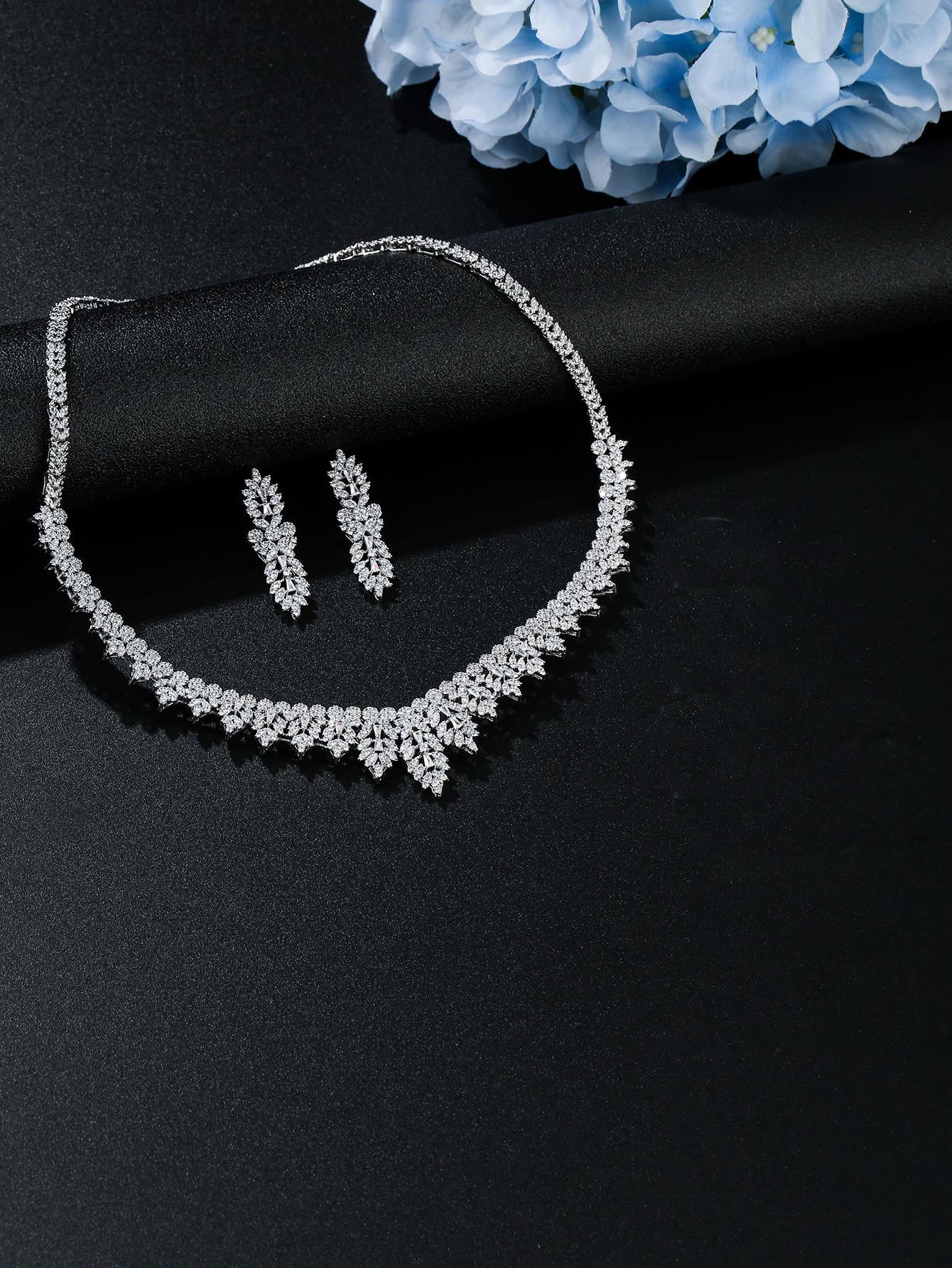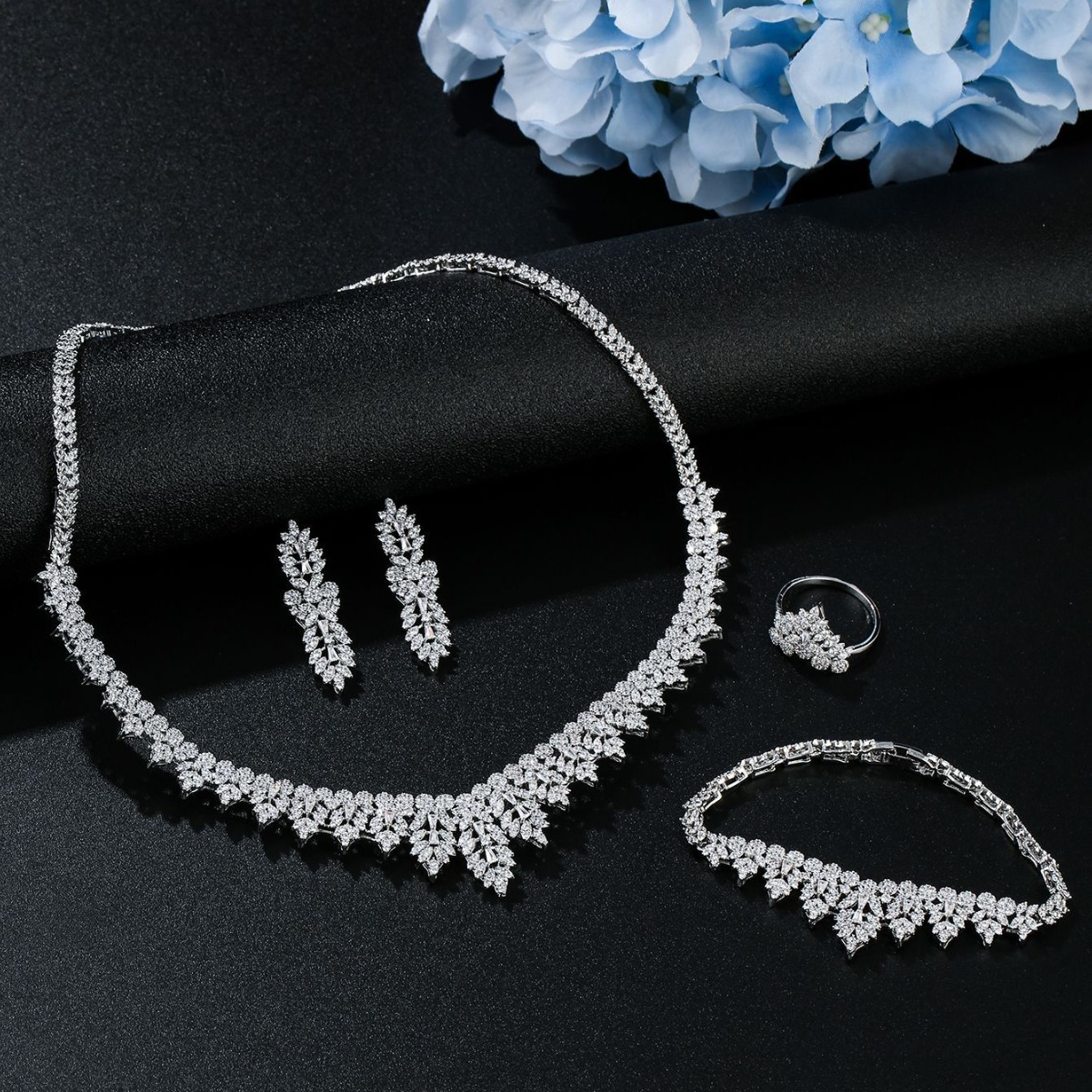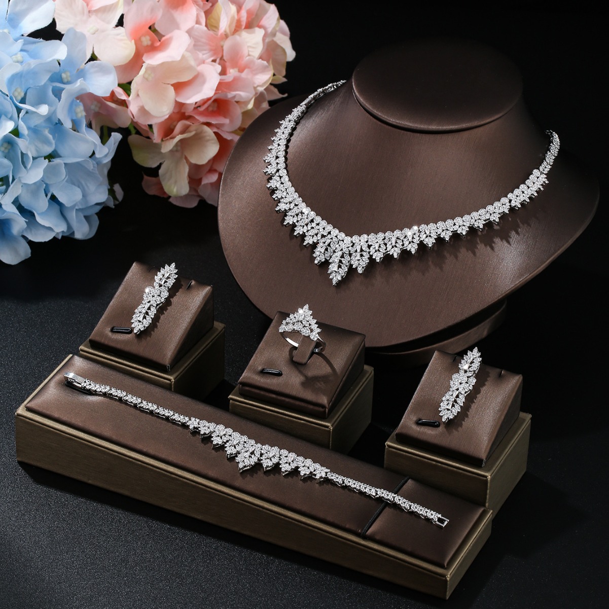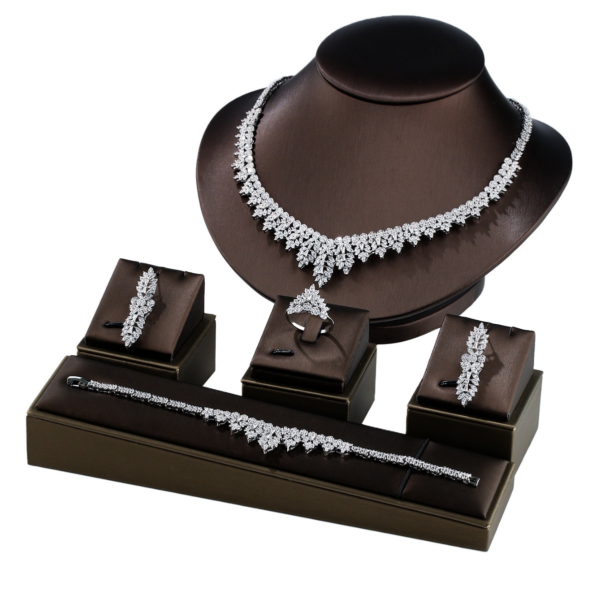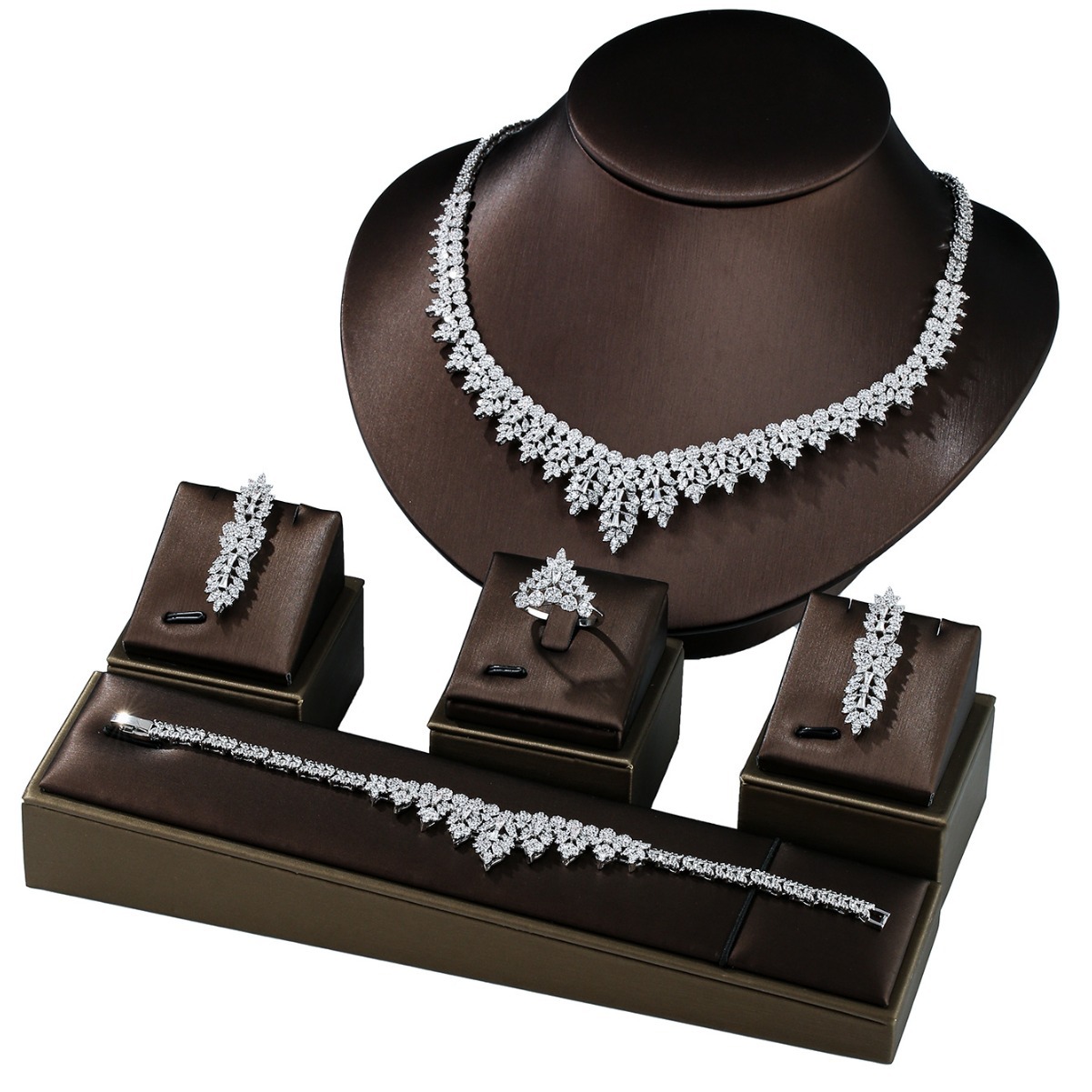 欧美四件装新娘套装铜微镶锆石婚礼配饰项链耳环手链戒指