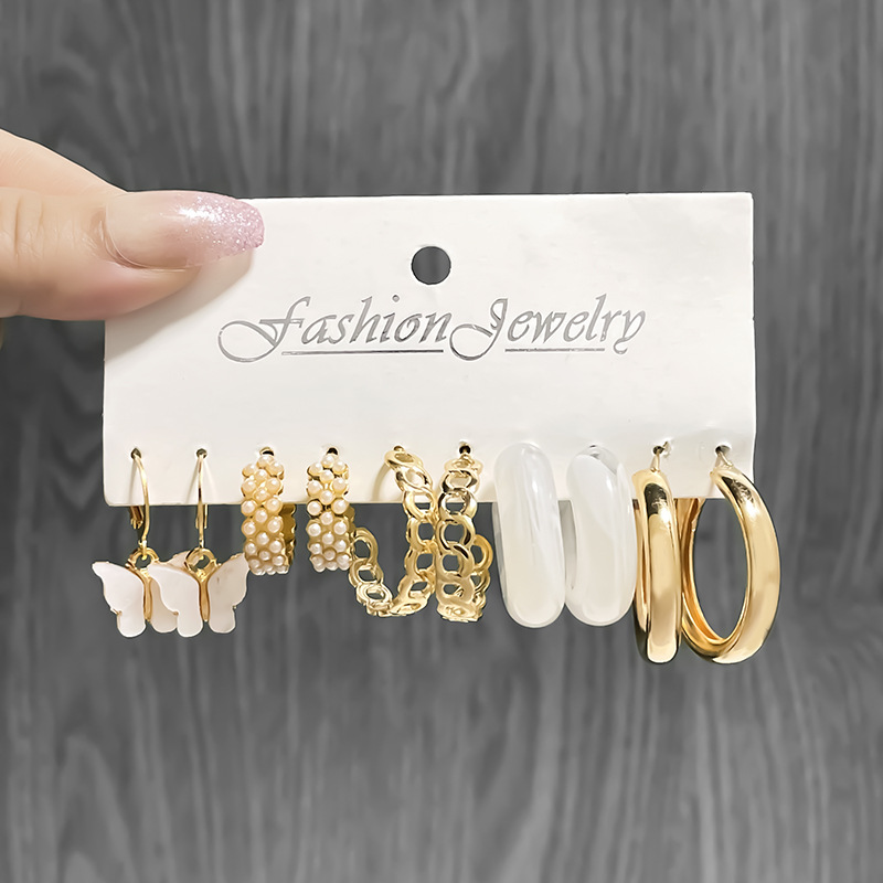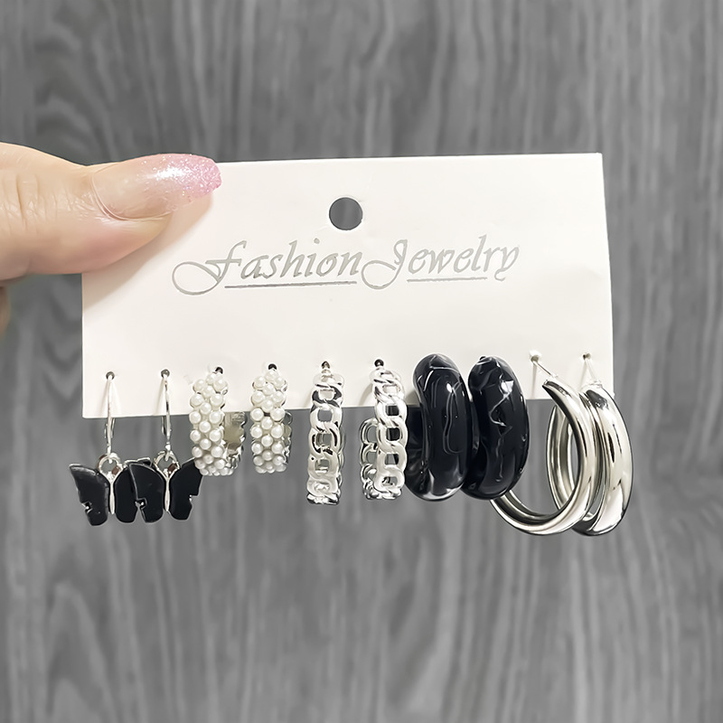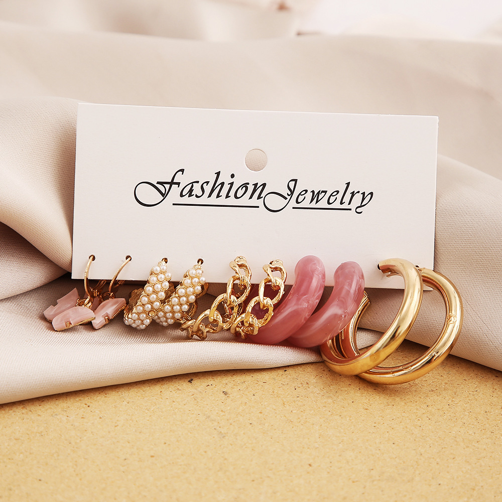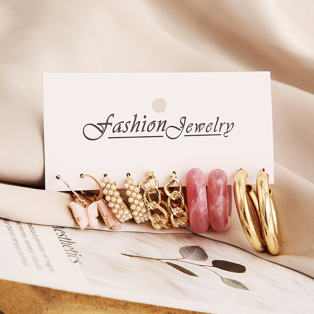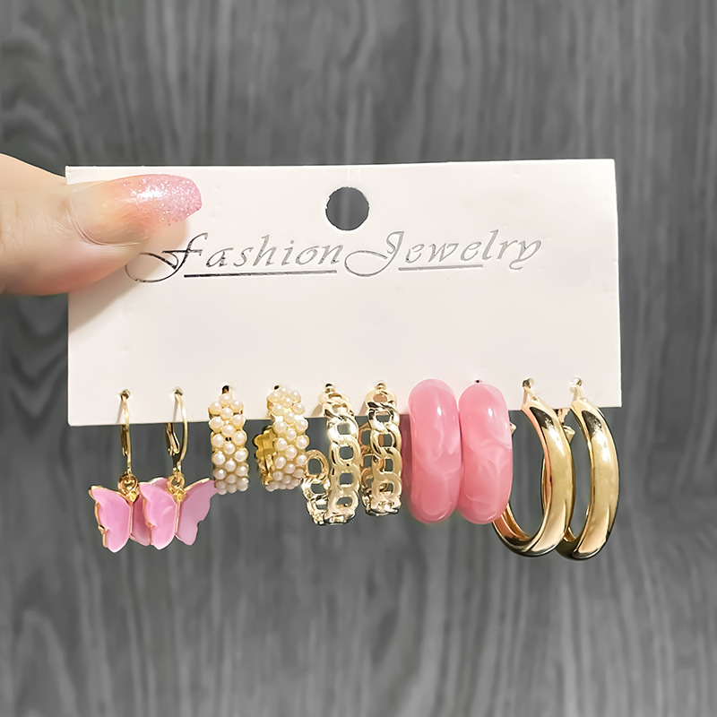 欧美跨境热销嵌珍珠蝴蝶套装5对装创意简约粉色百搭C型链条耳环