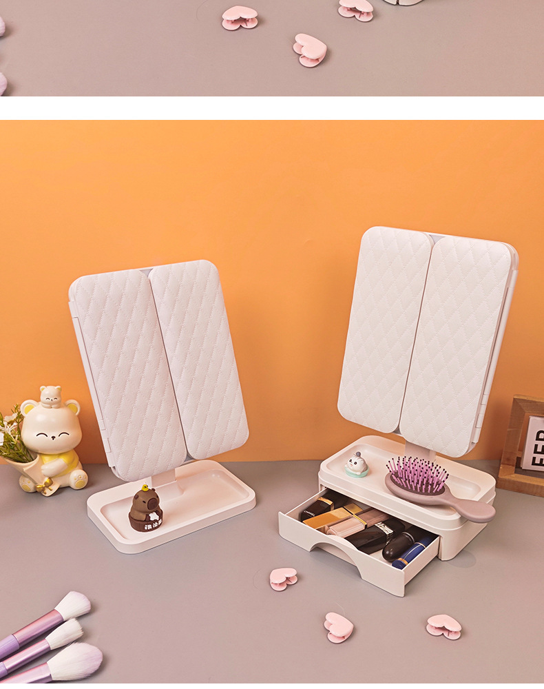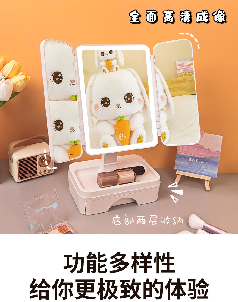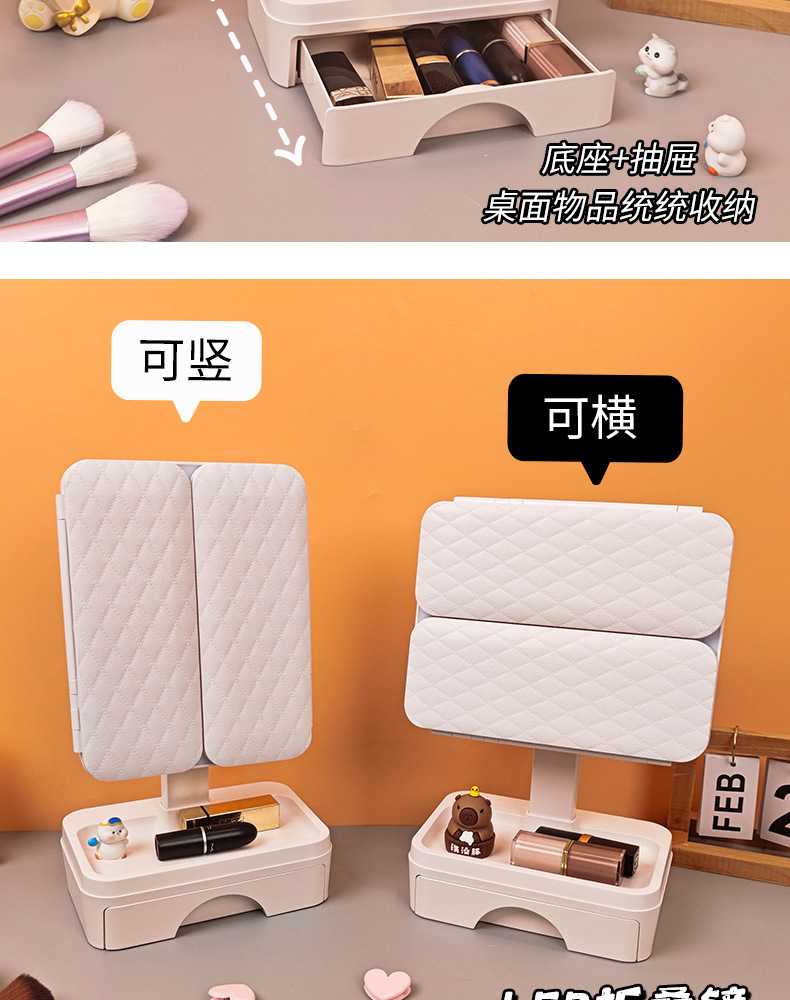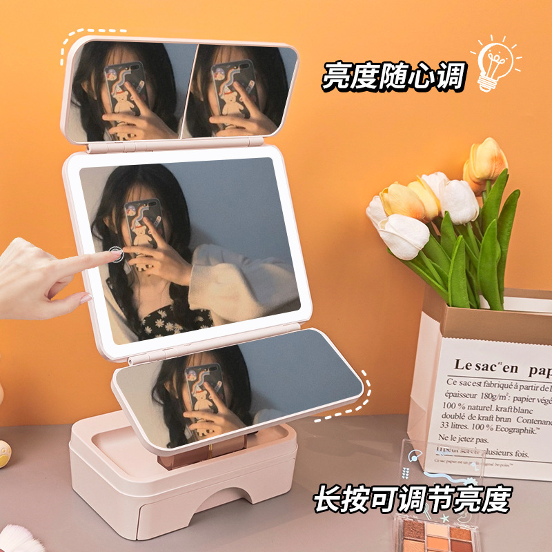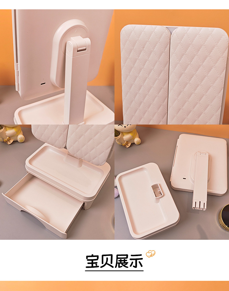 跨境台式桌面三折led化妆镜带灯补光折叠贝壳镜充电款情人节礼品