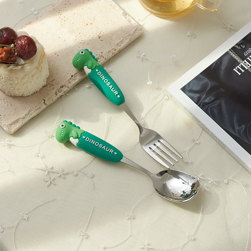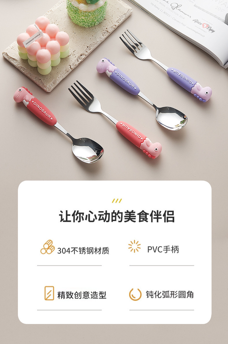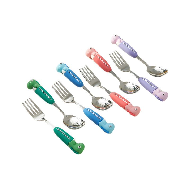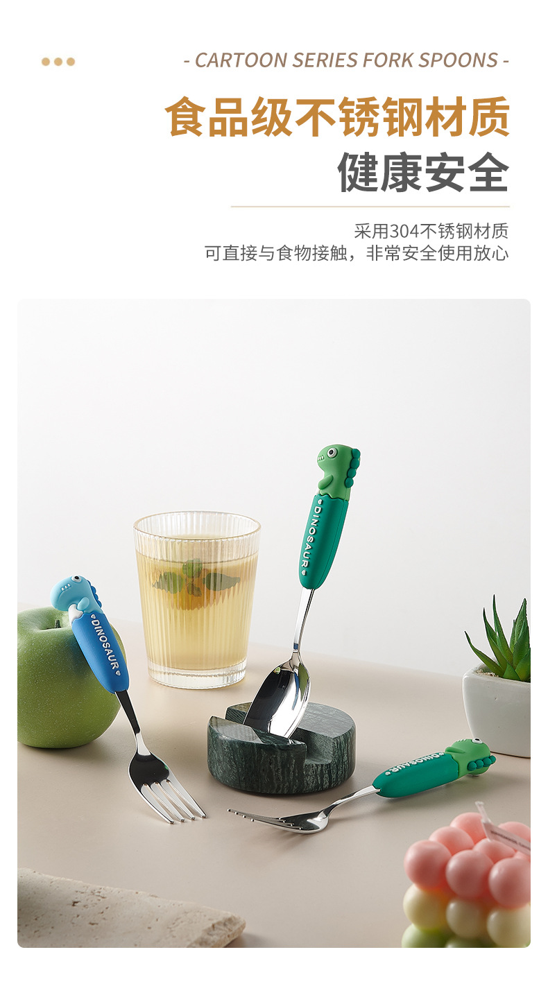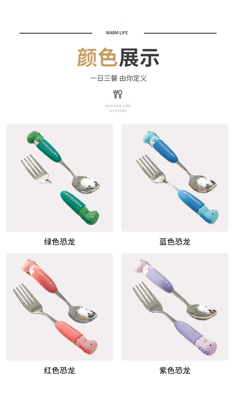卡通系列小恐龙不锈钢餐具防烫手柄叉勺多色可选儿童西餐餐具批发