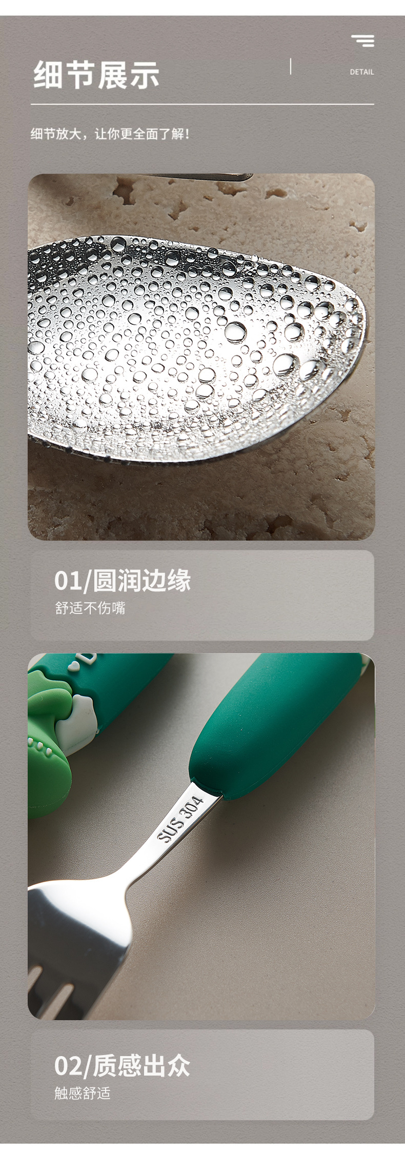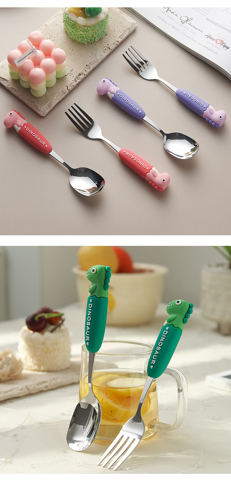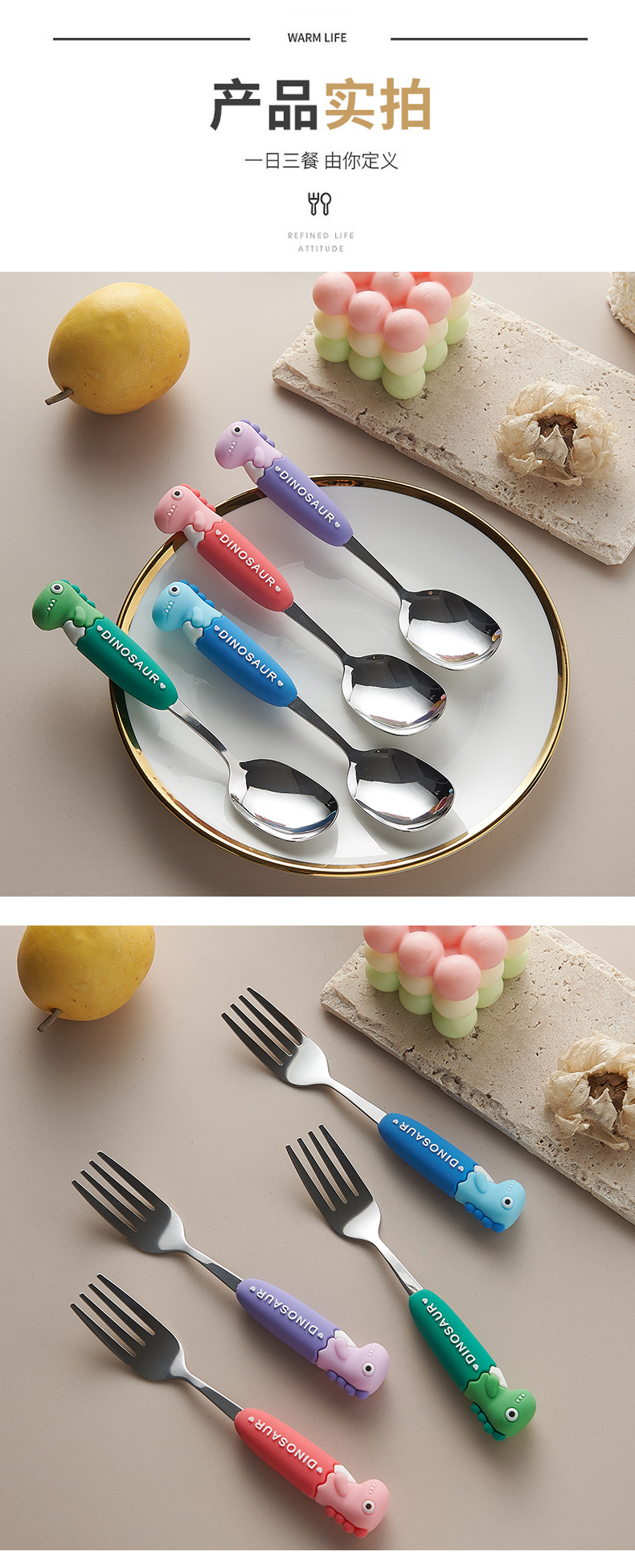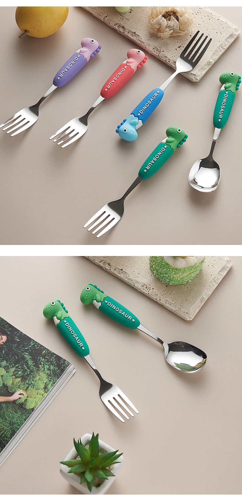 卡通系列小恐龙不锈钢餐具防烫手柄叉勺多色可选儿童西餐餐具批发