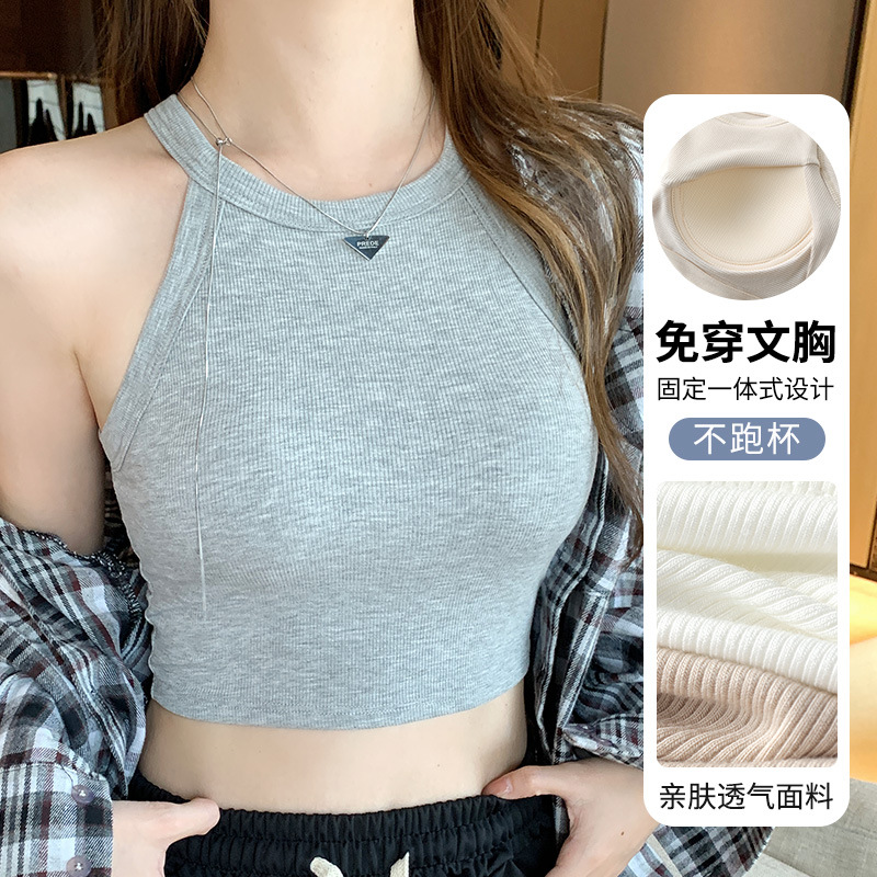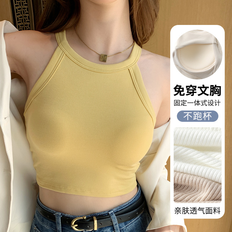挂脖带胸垫背心女夏季短款罩杯一体打底露脐百搭外穿无袖修身上衣