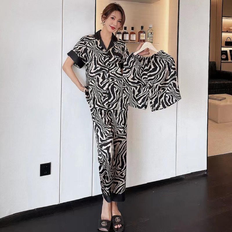 冰丝情侣睡衣套装夏季丝绸短袖短裤长裤三件套高档马纹外穿家居服
