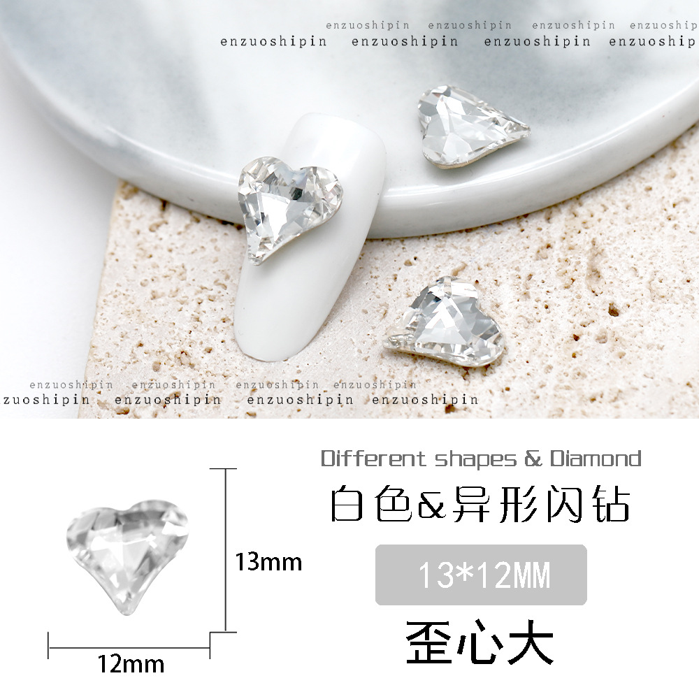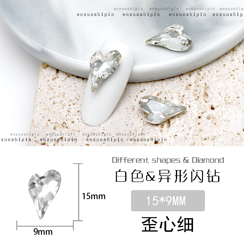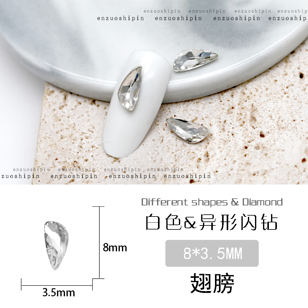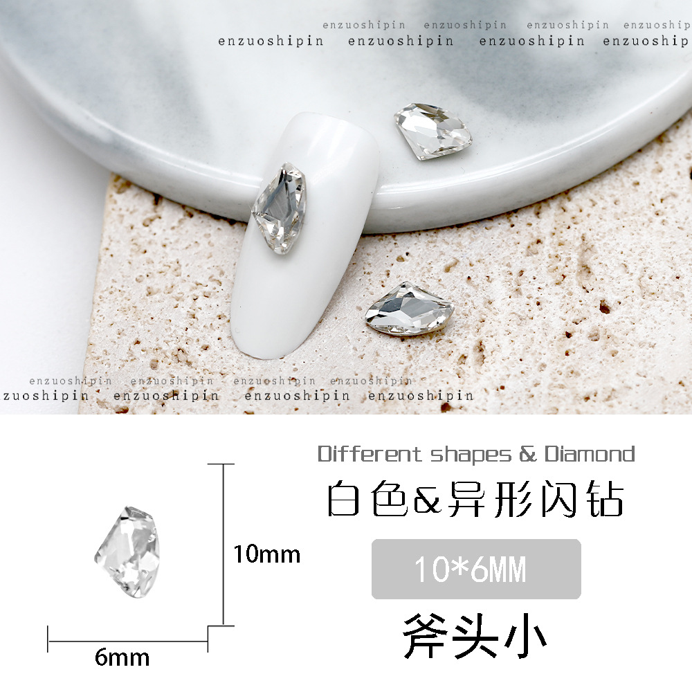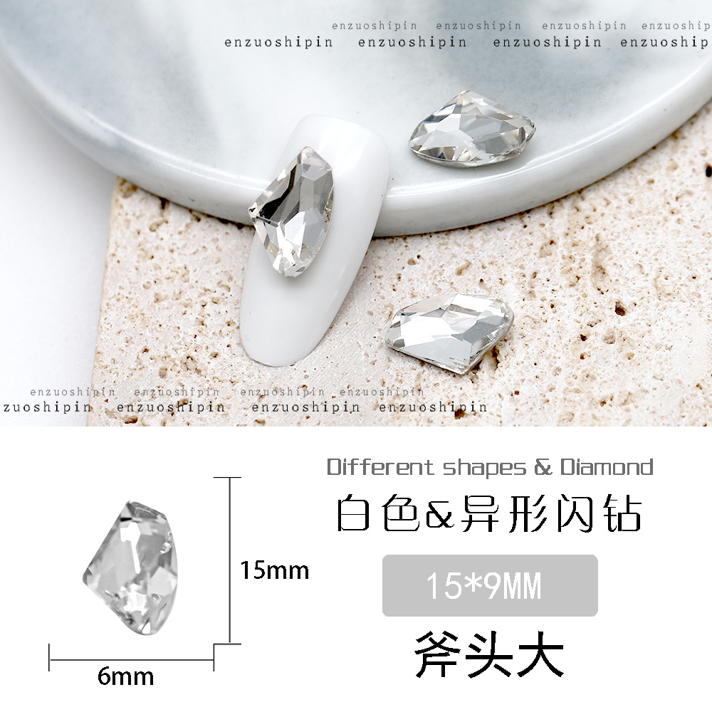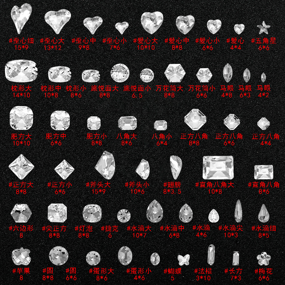批发美甲饰品透明大钻尖底超闪歪心斧头水滴肥方蝴蝶白钻指甲配饰