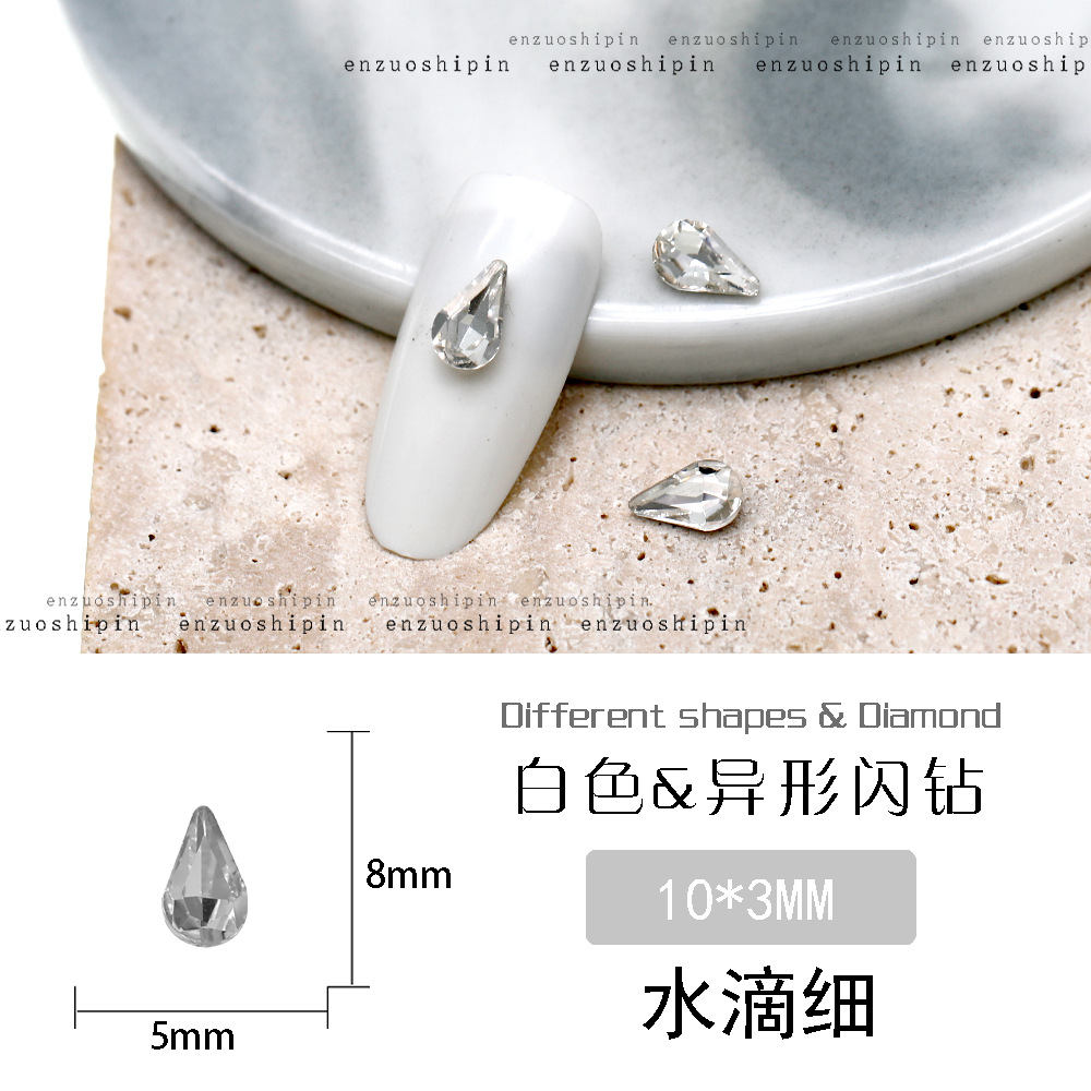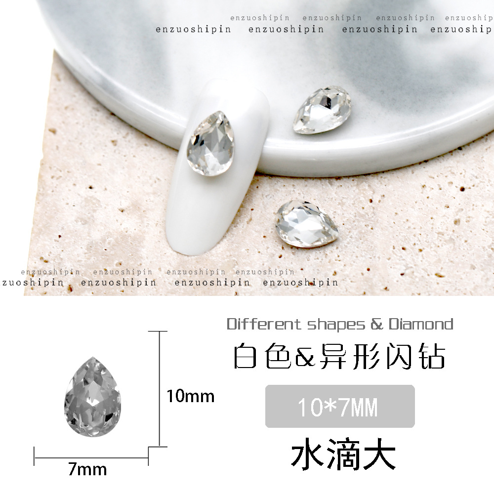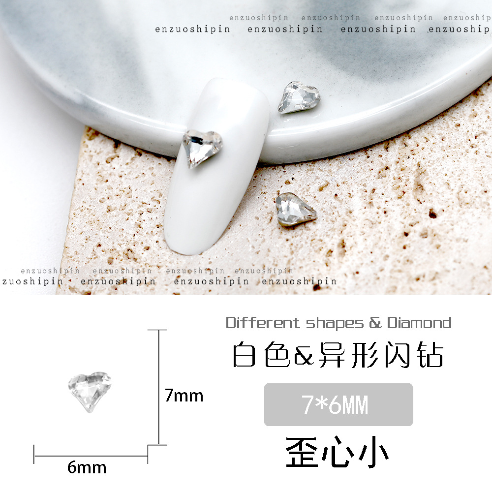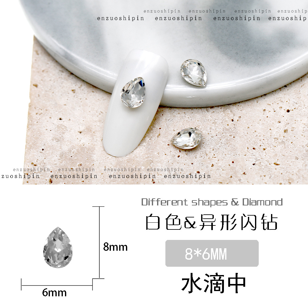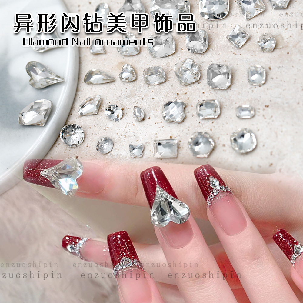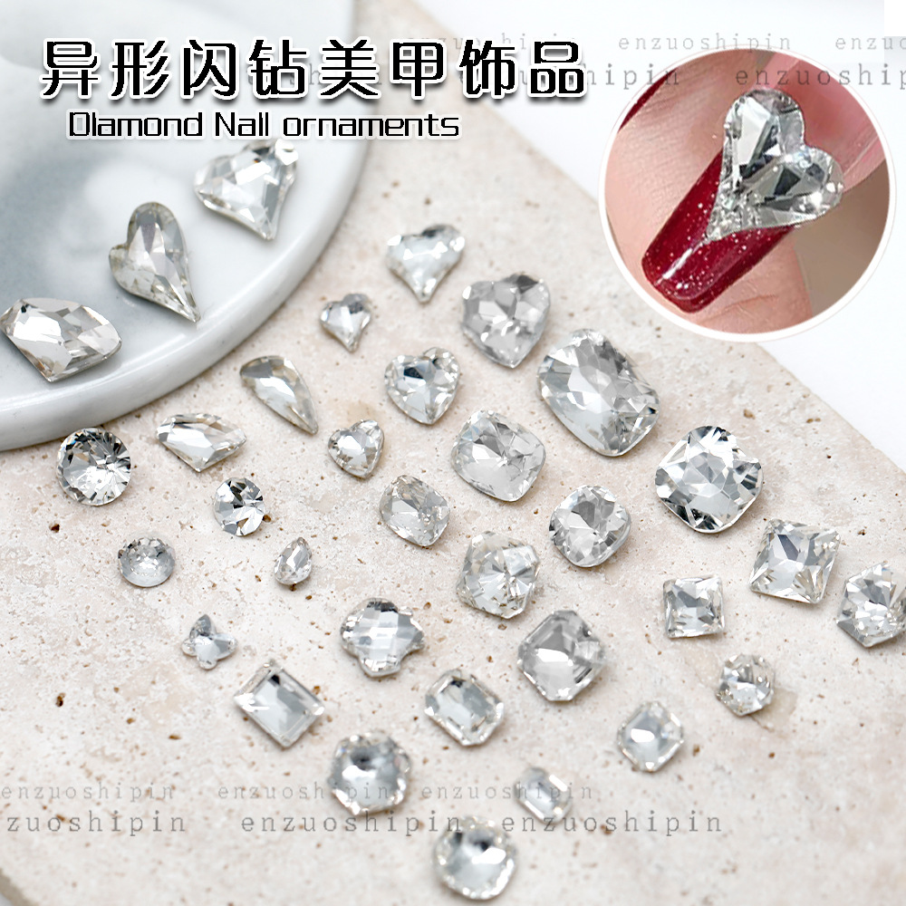 批发美甲饰品透明大钻尖底超闪歪心斧头水滴肥方蝴蝶白钻指甲配饰