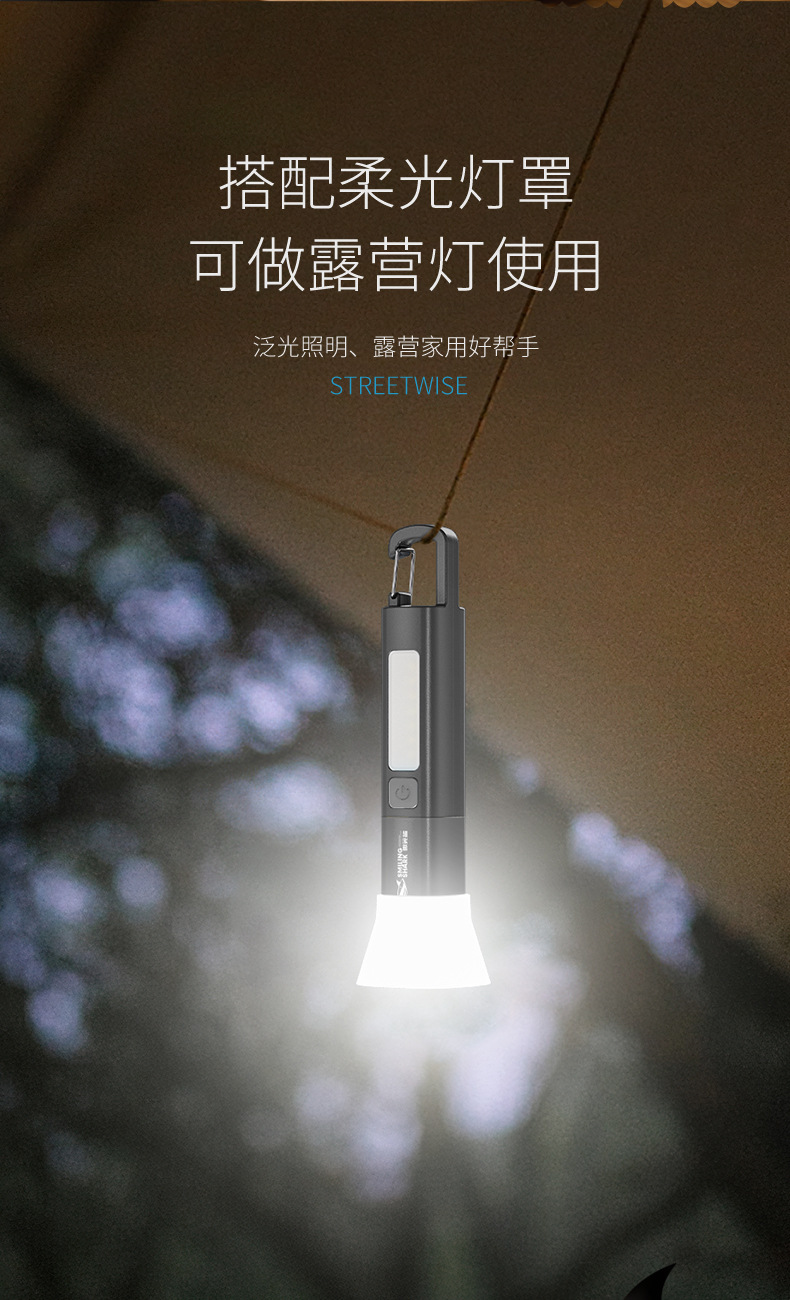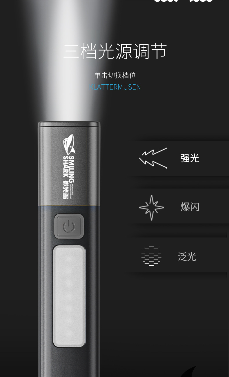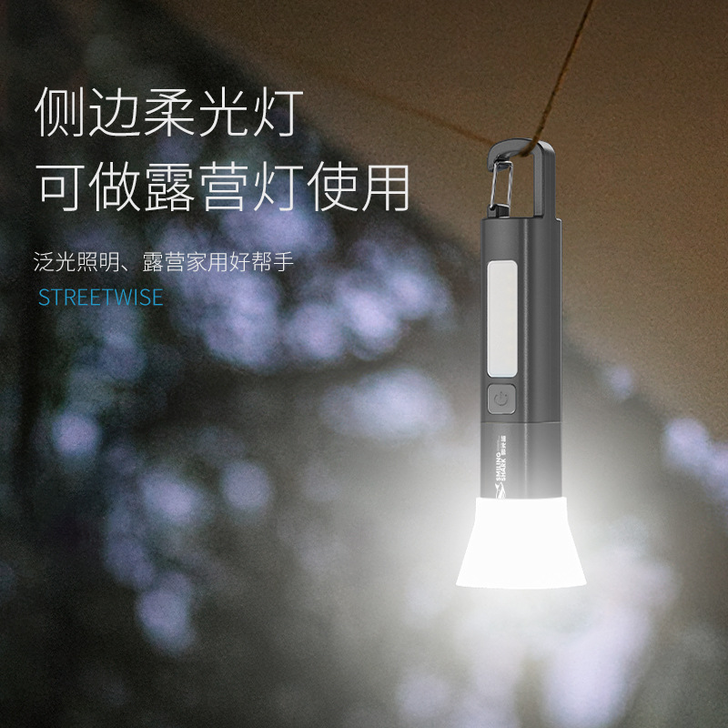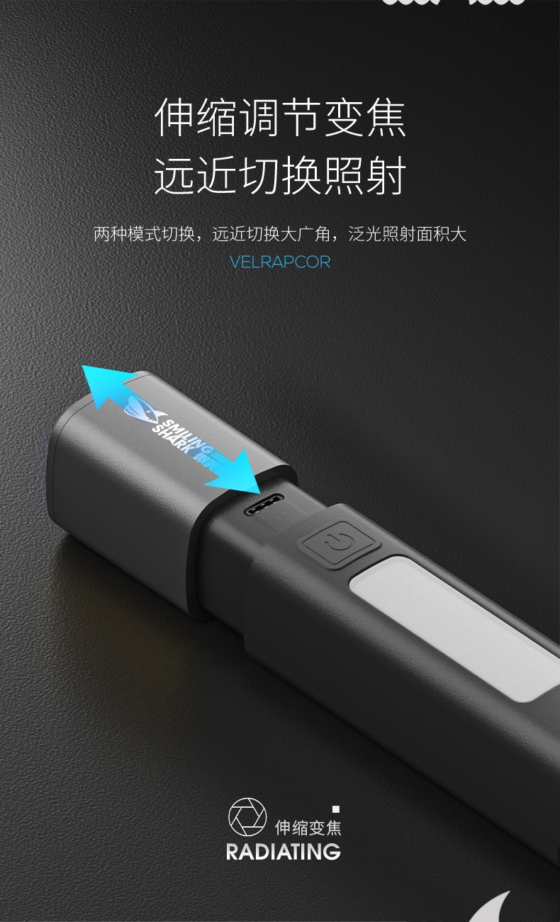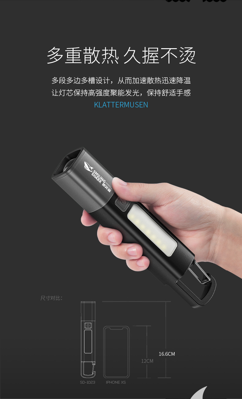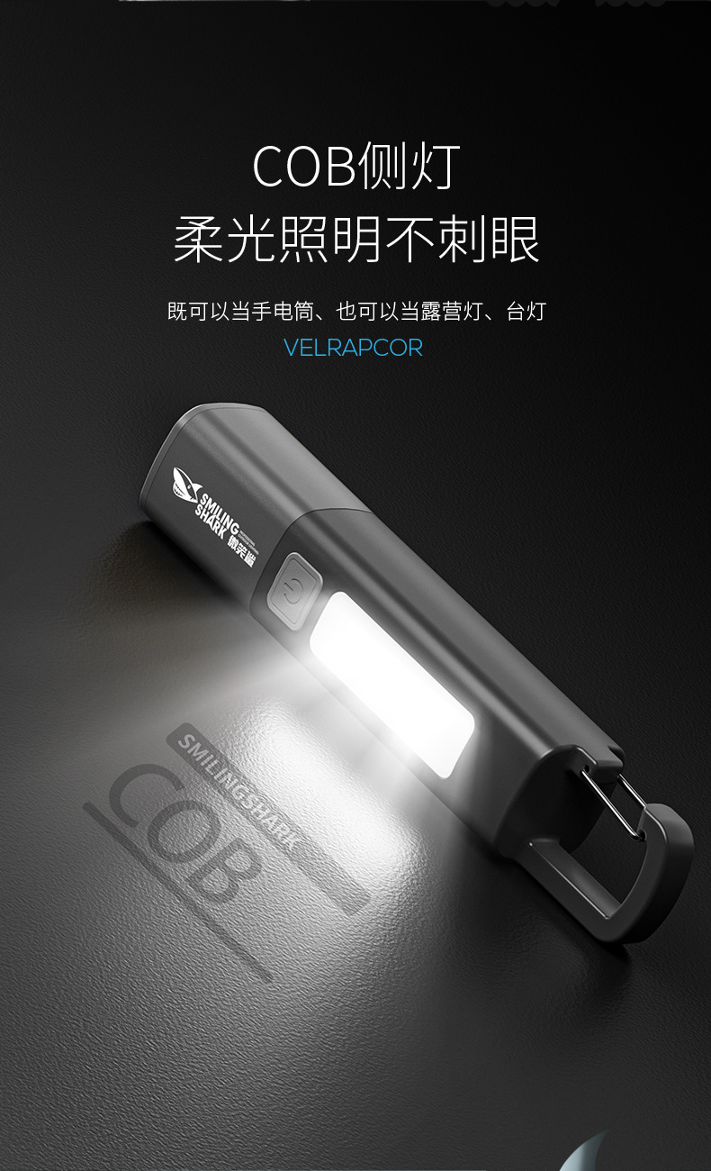 微笑鲨户外露营照明手电筒变焦远射COB泛光侧灯挂钩锁扣设计便携