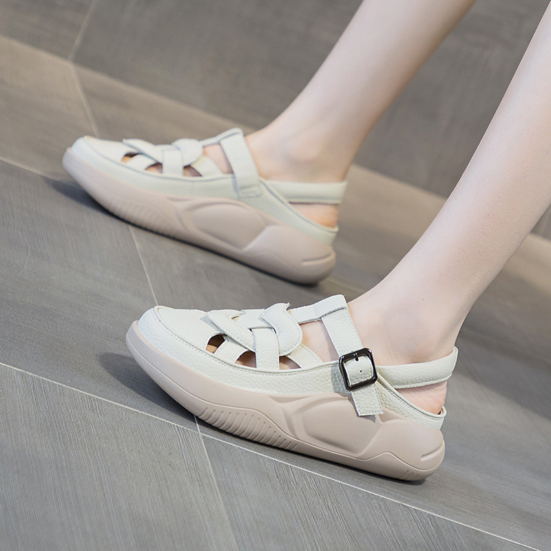凉鞋女2025新款皮面平底包头软底孕妇鞋休闲时尚外穿拼色沙滩凉鞋