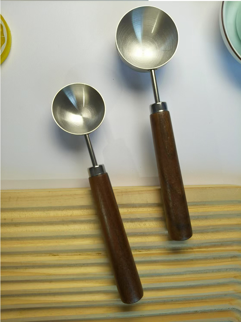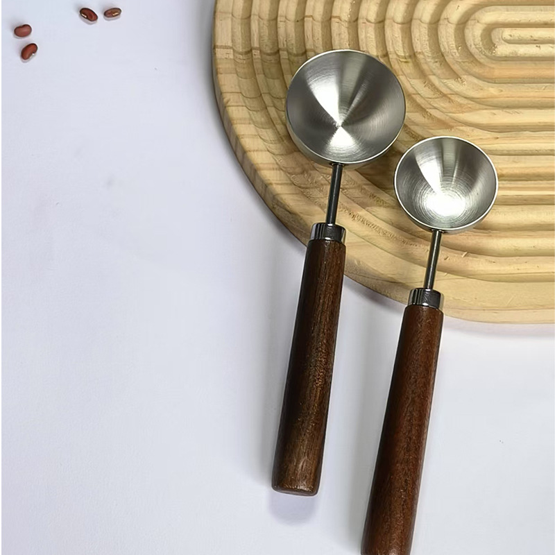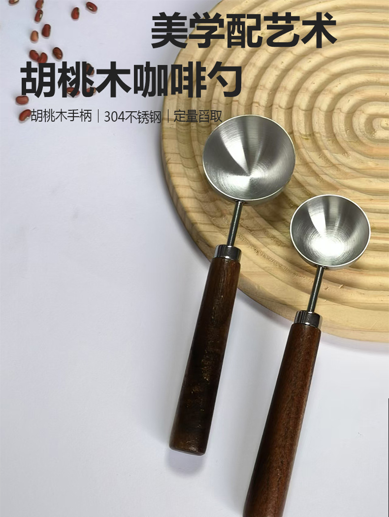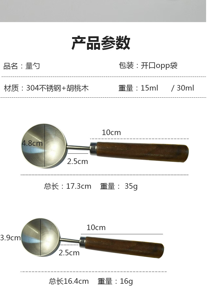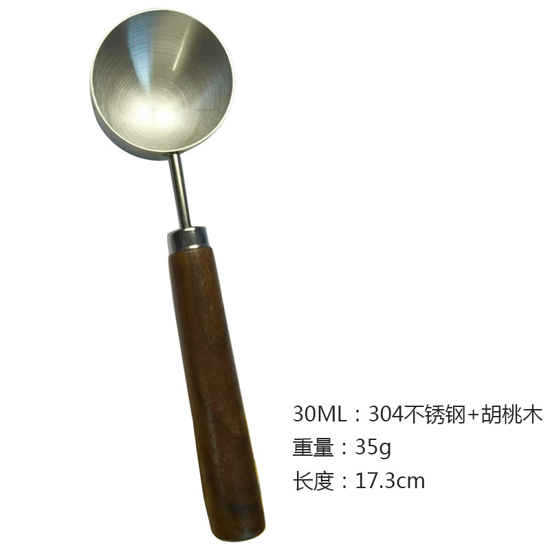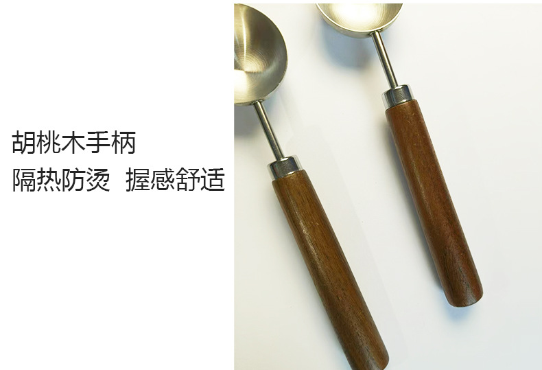 304不锈钢圆头咖啡量勺厨房烘焙工具胡桃木手柄咖啡豆奶粉量匙勺