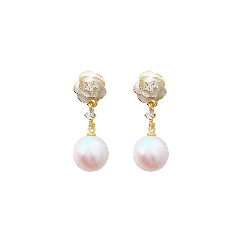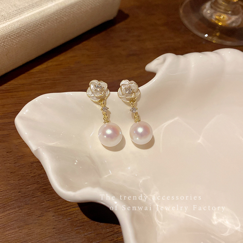 复古法式山茶花珍珠耳环女高级感温柔百搭名媛耳坠2025新款耳饰品