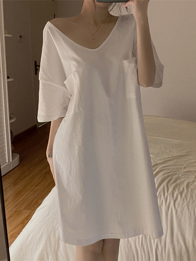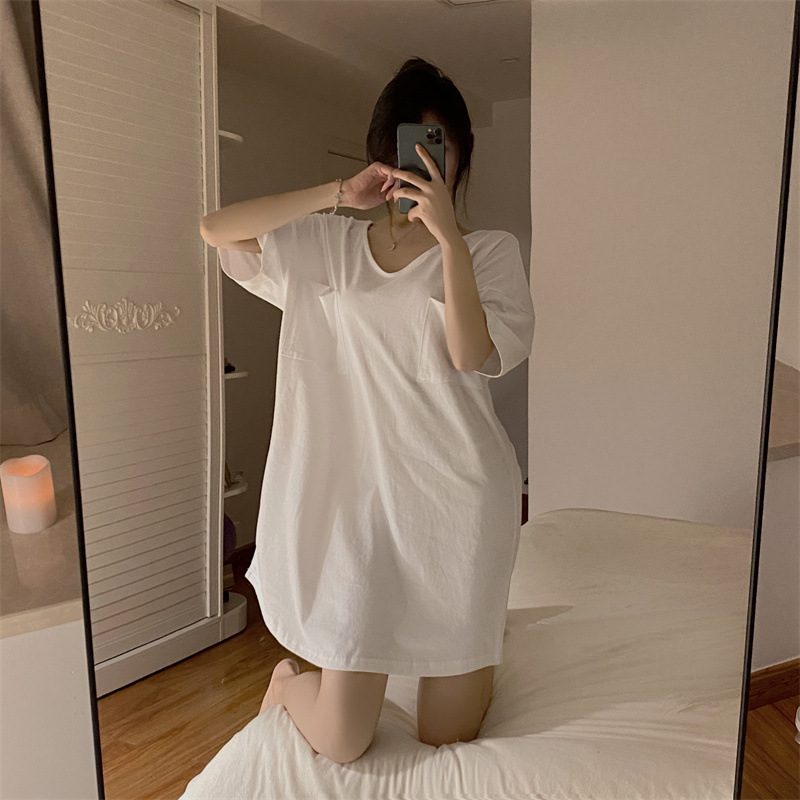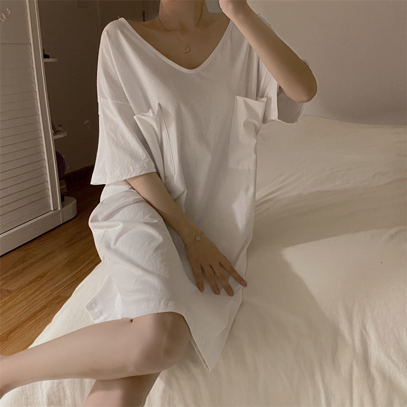 纯白T慵懒风短袖V领宽松直筒睡裙棉舒适家居服简约可外穿睡衣女