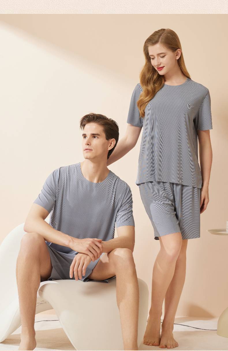 清凉情侣睡衣女士圆领短袖睡裤套装夏天短裤男薄款无痕冰丝家居服