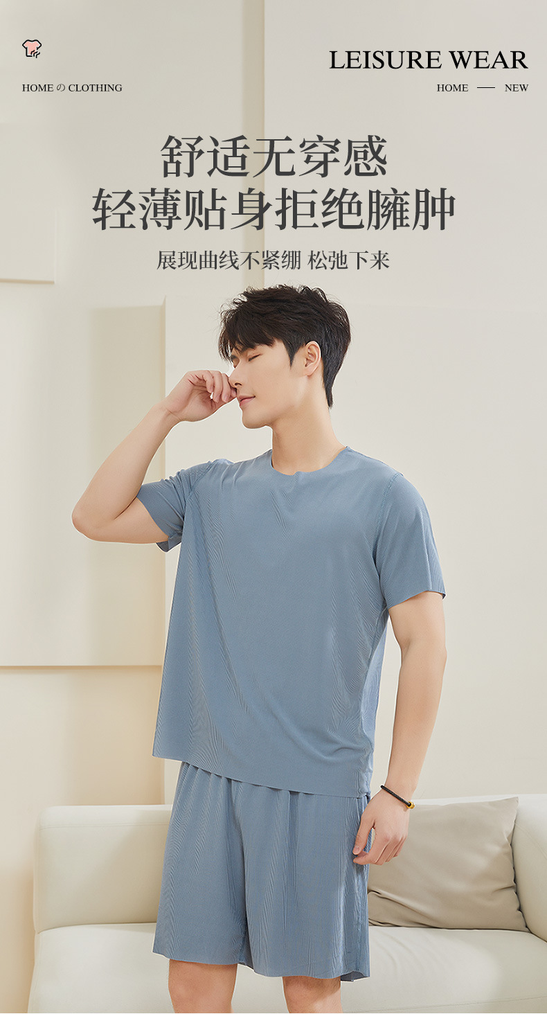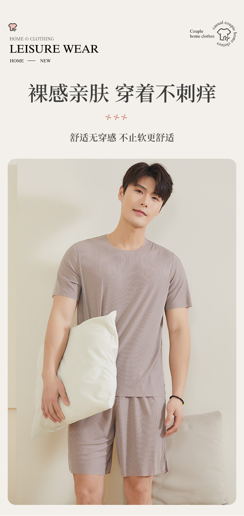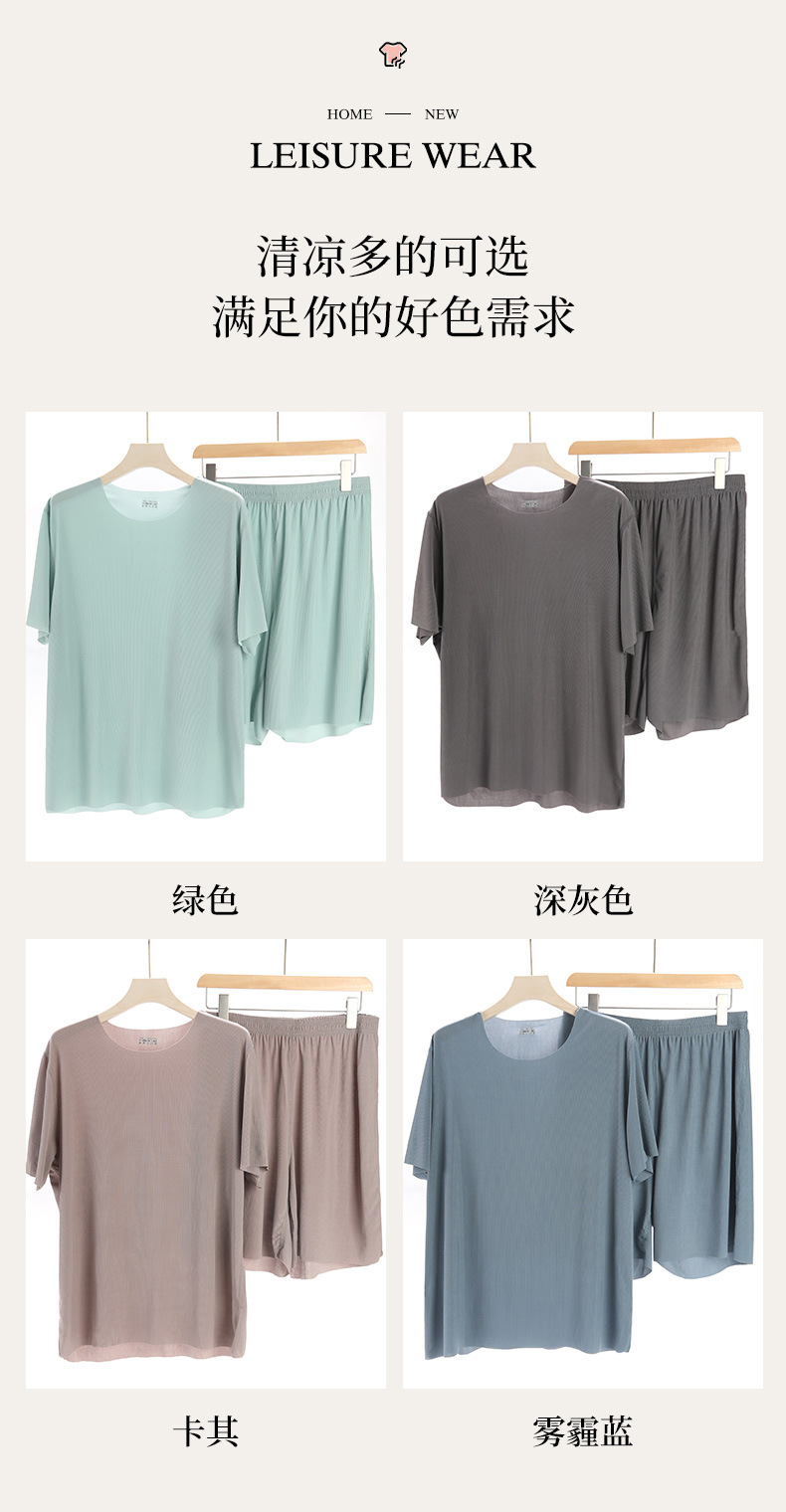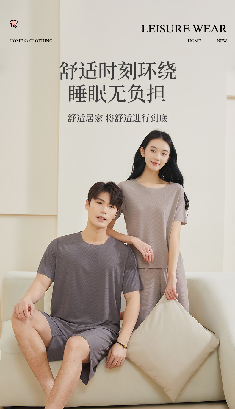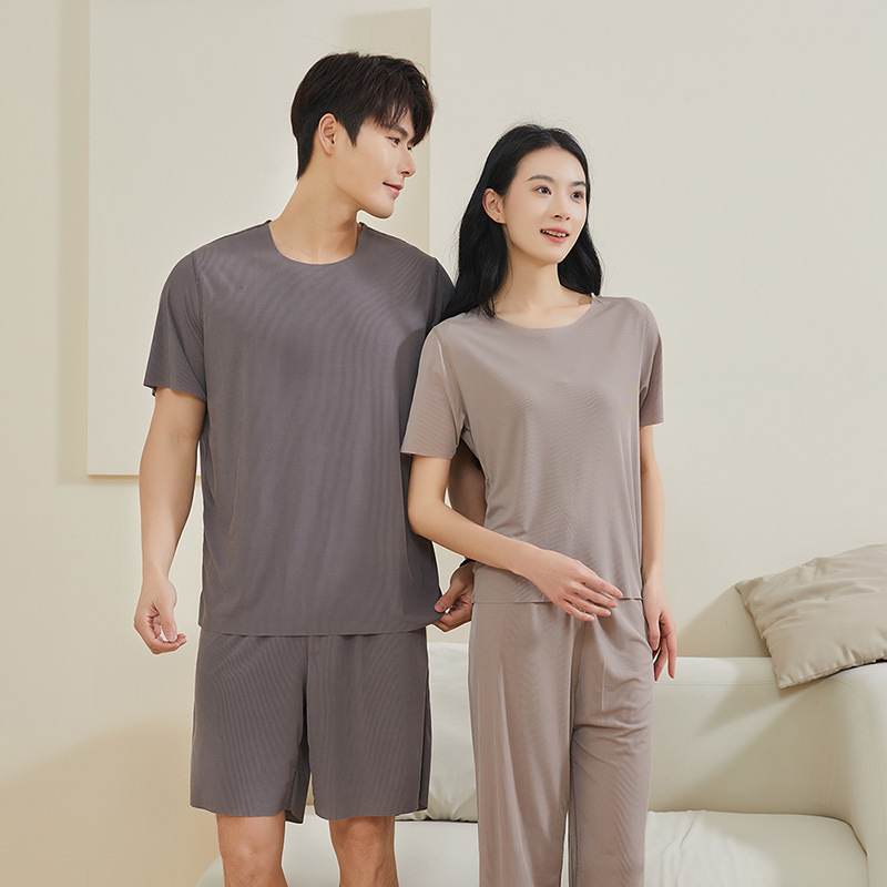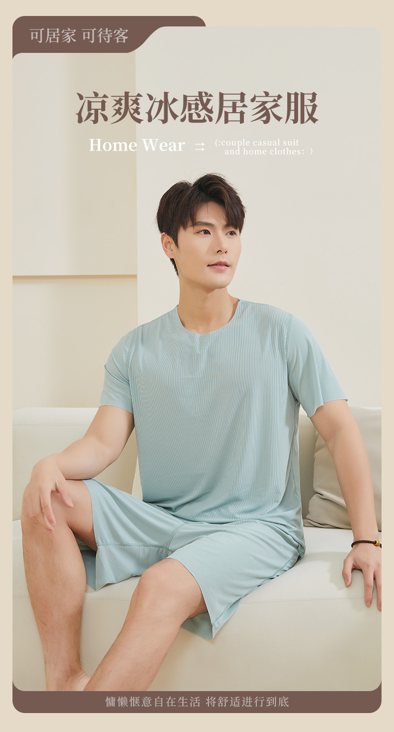 夏季冰丝家居服睡衣男士套装薄款圆领女凉感短袖可外穿