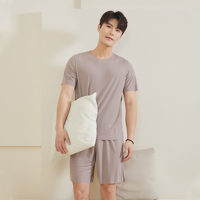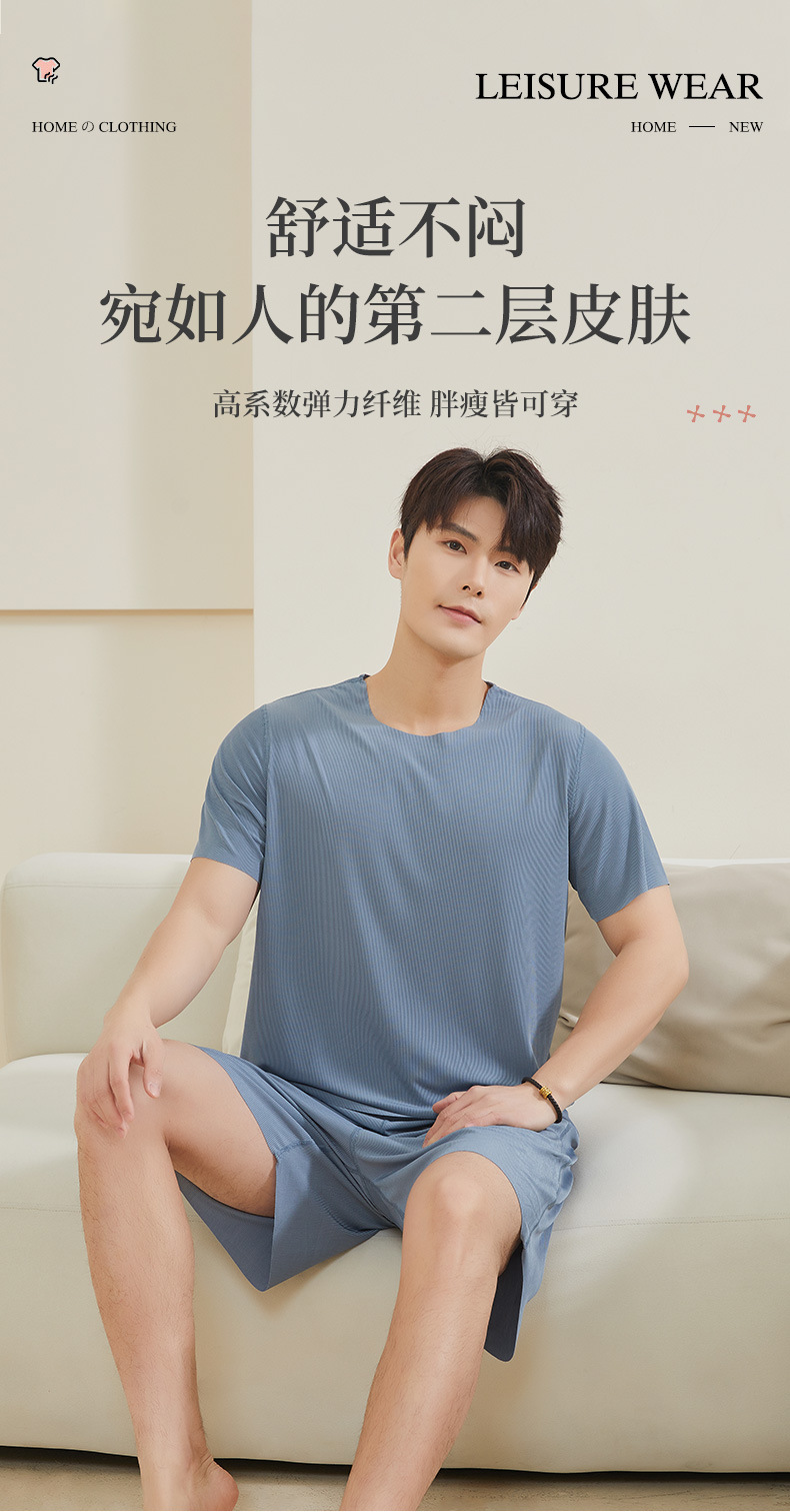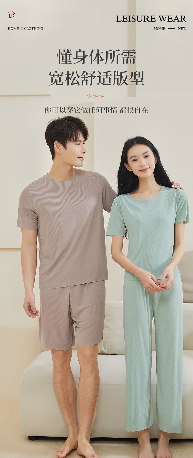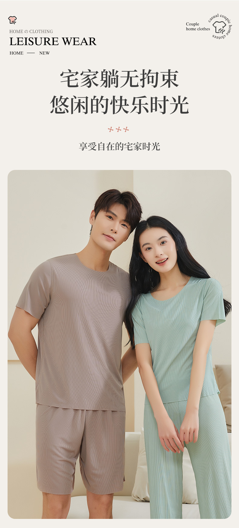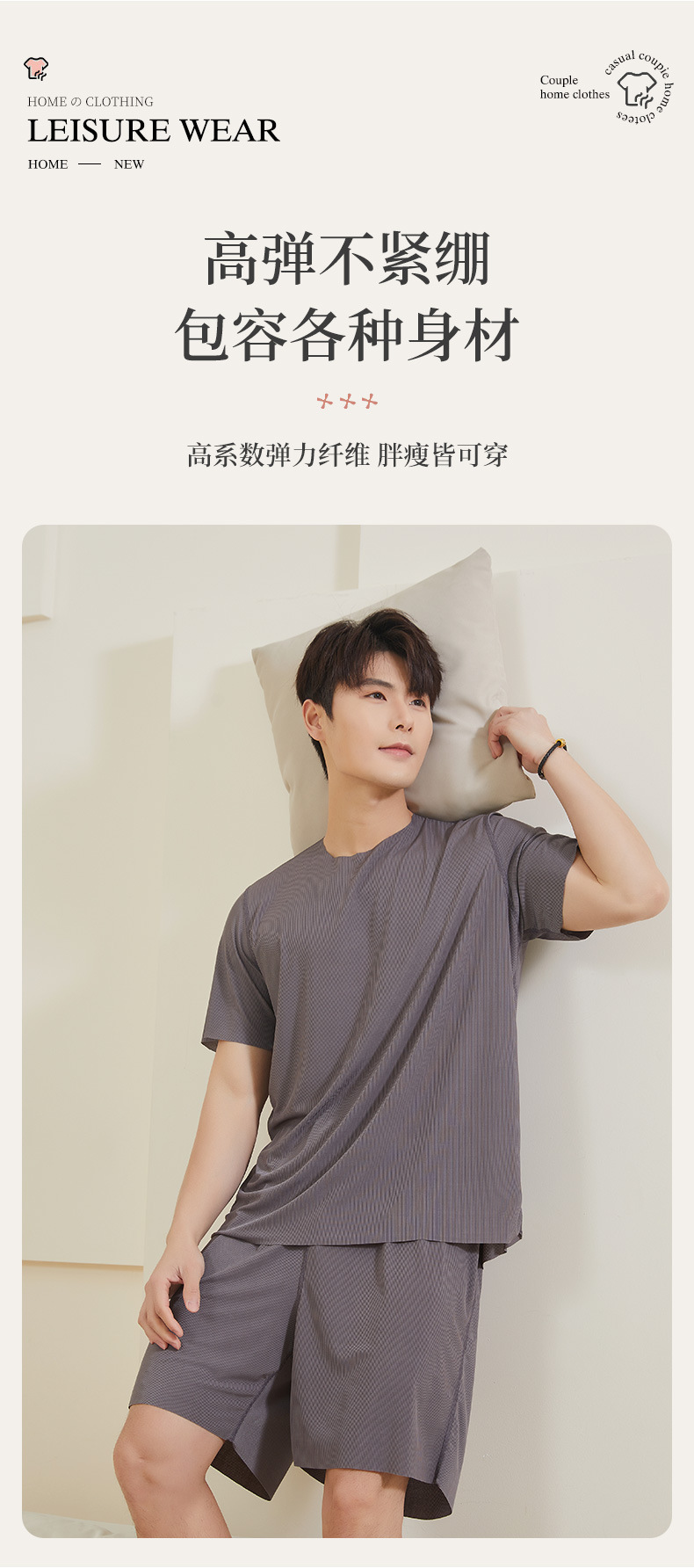 夏季冰丝家居服睡衣男士套装薄款圆领女凉感短袖可外穿