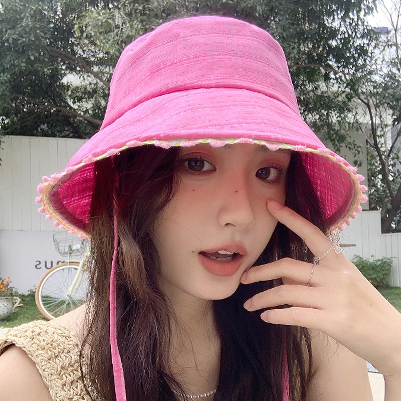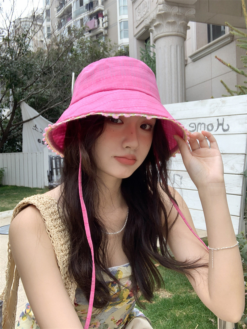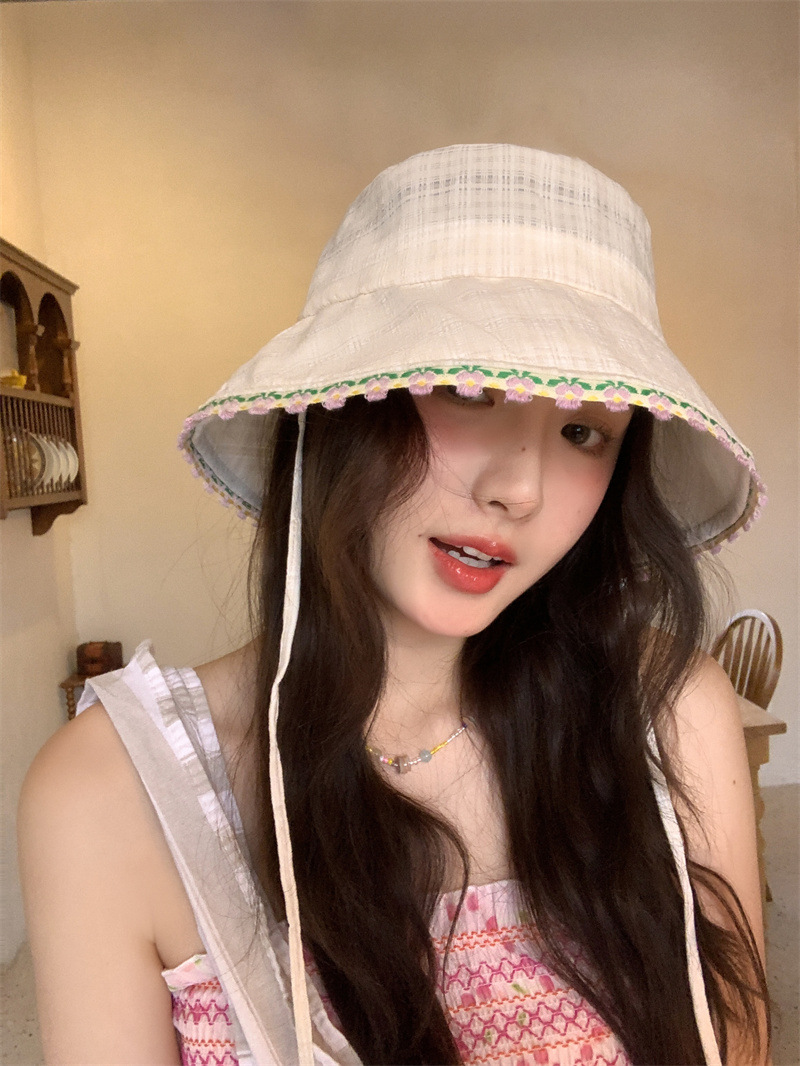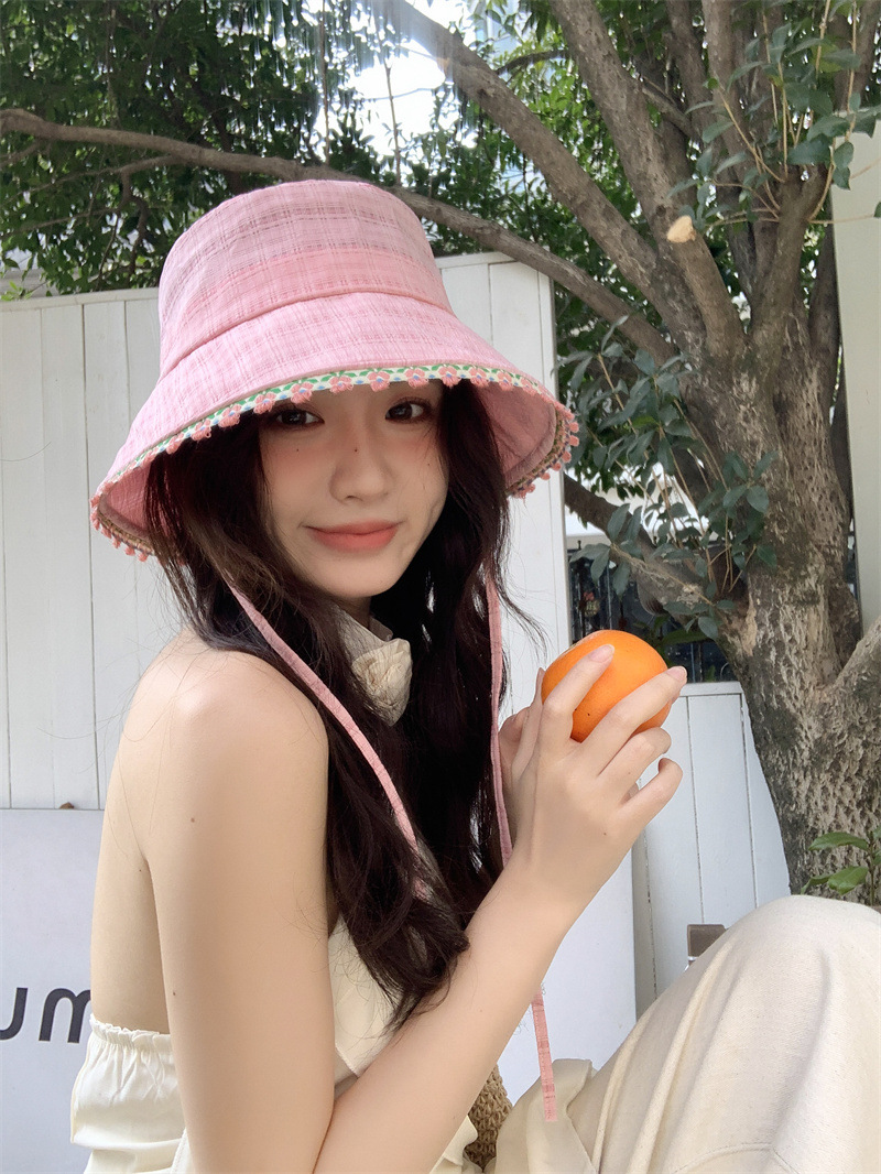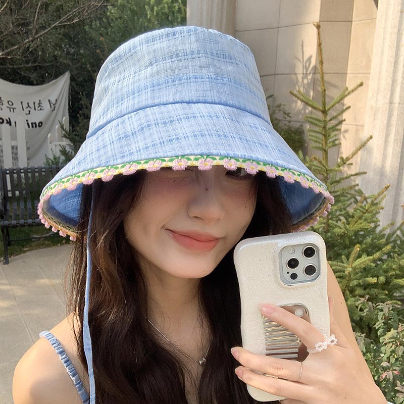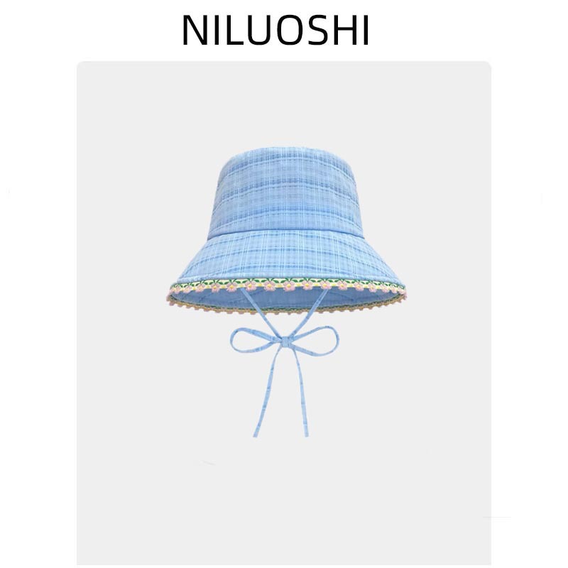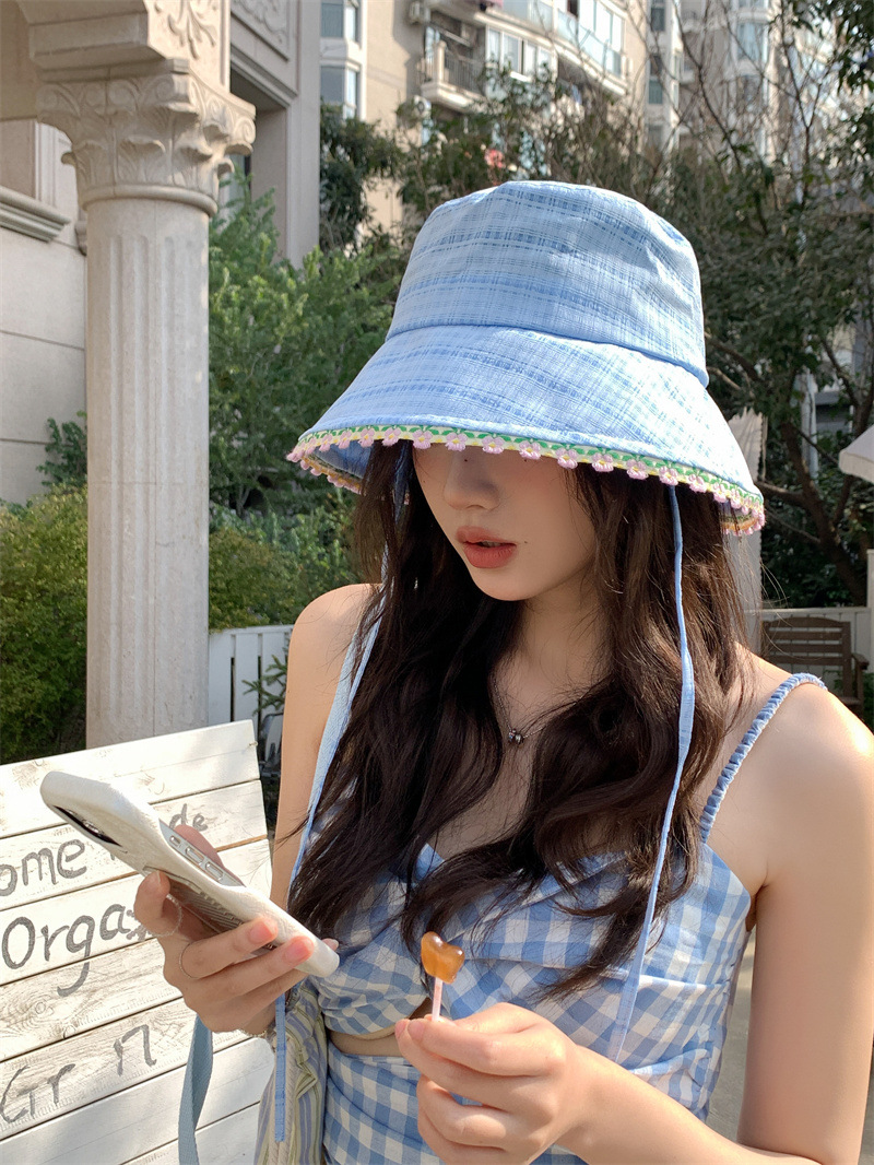 甜美可爱花边蓝色渔夫帽女春夏季遮阳防晒盆帽户外大帽檐登山帽潮