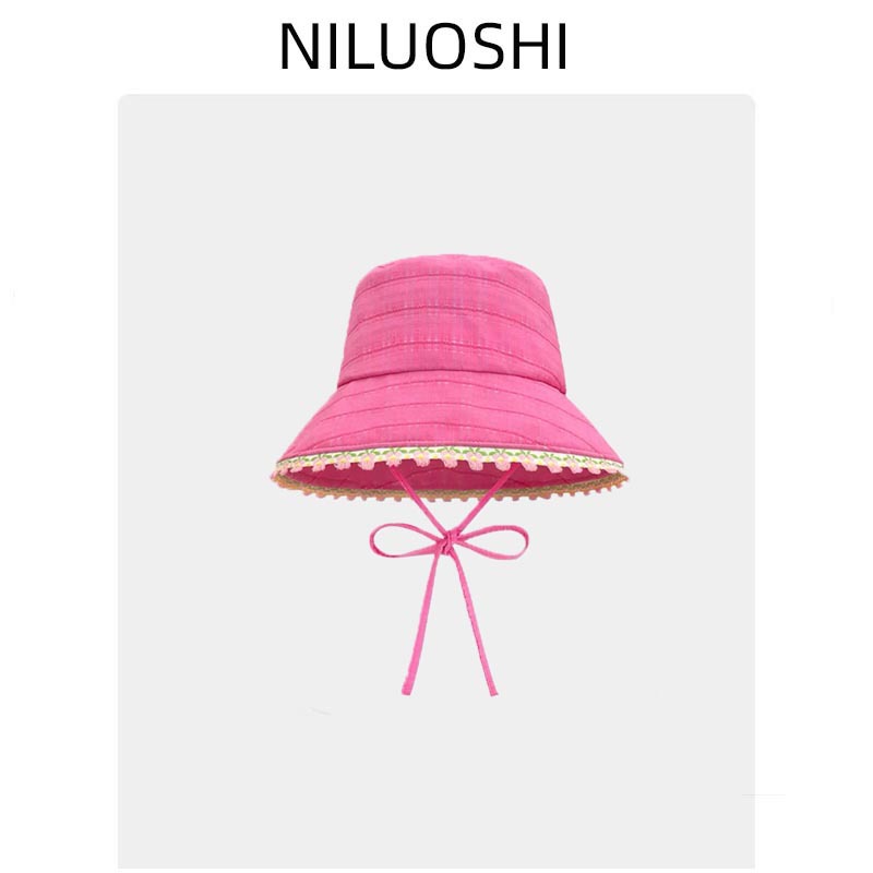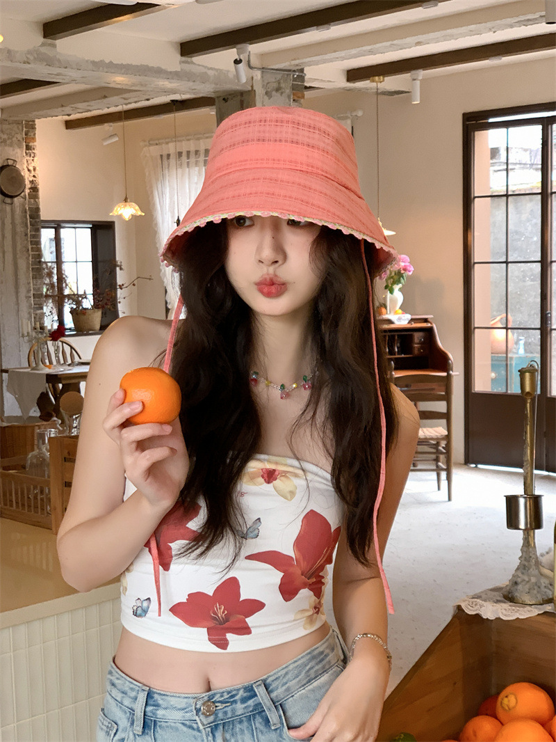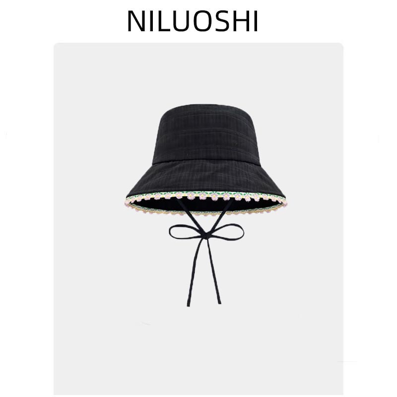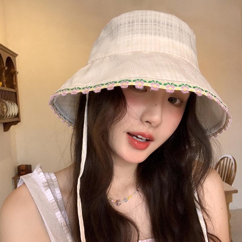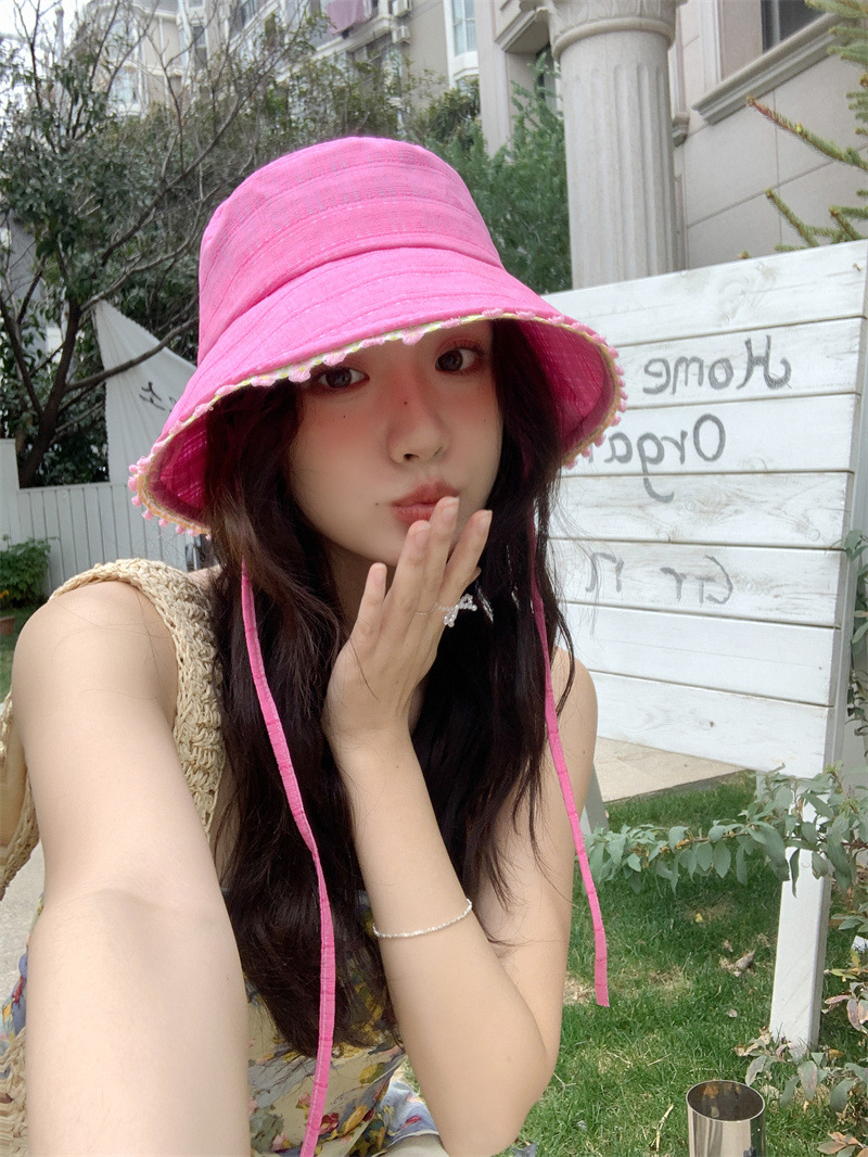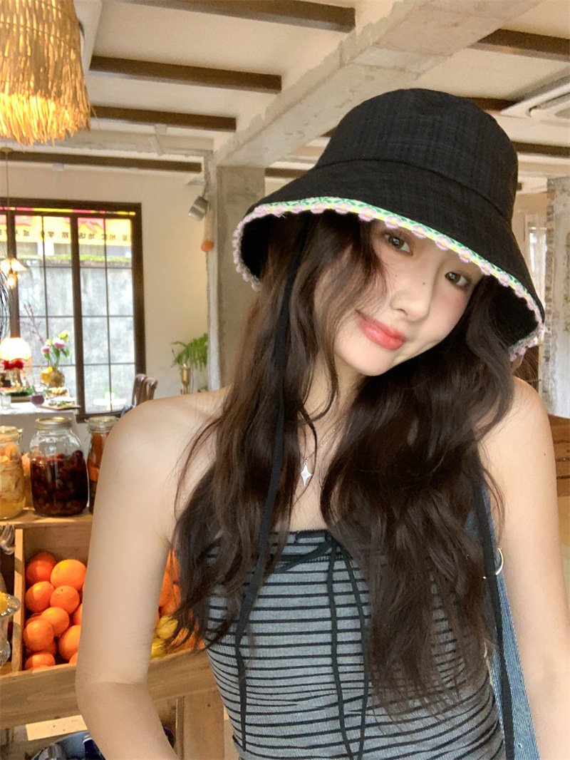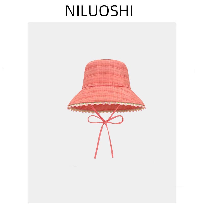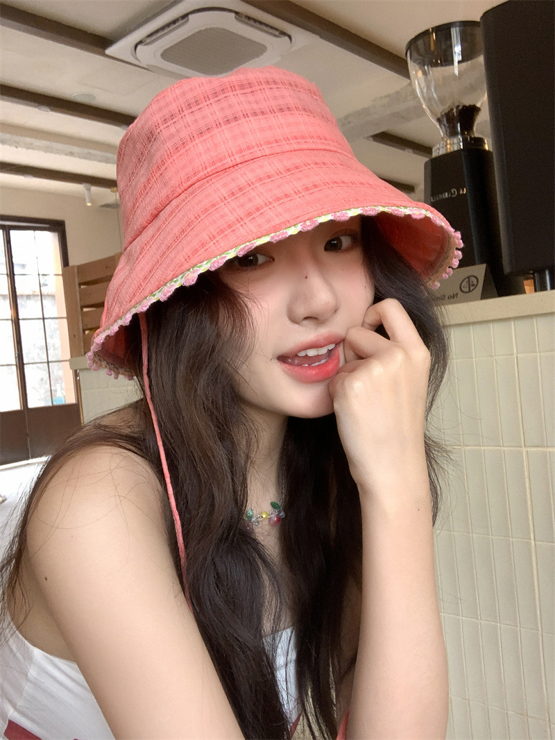 甜美可爱花边蓝色渔夫帽女春夏季遮阳防晒盆帽户外大帽檐登山帽潮