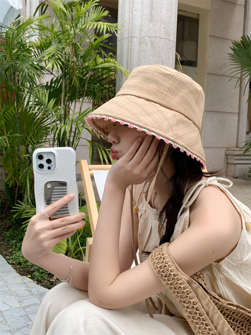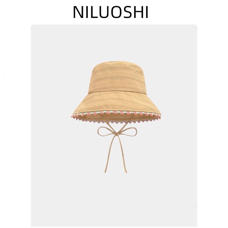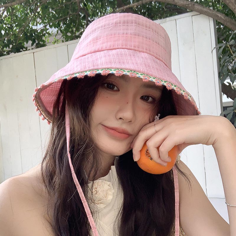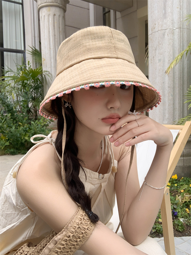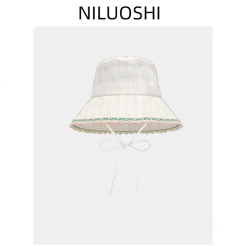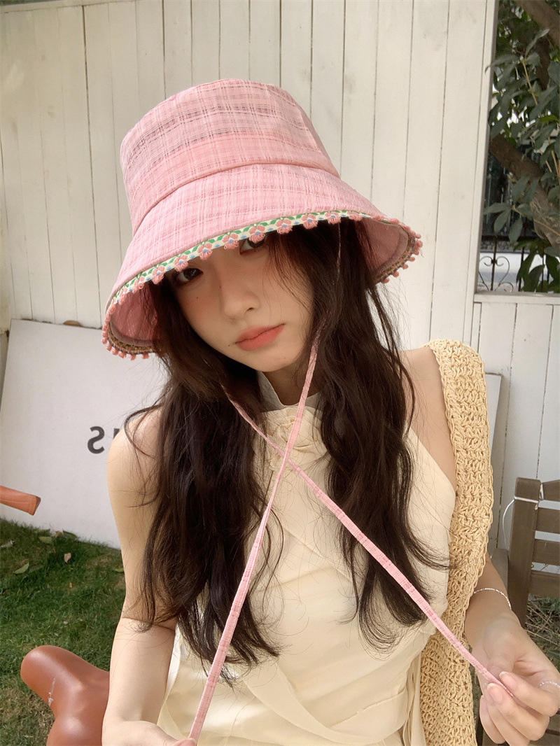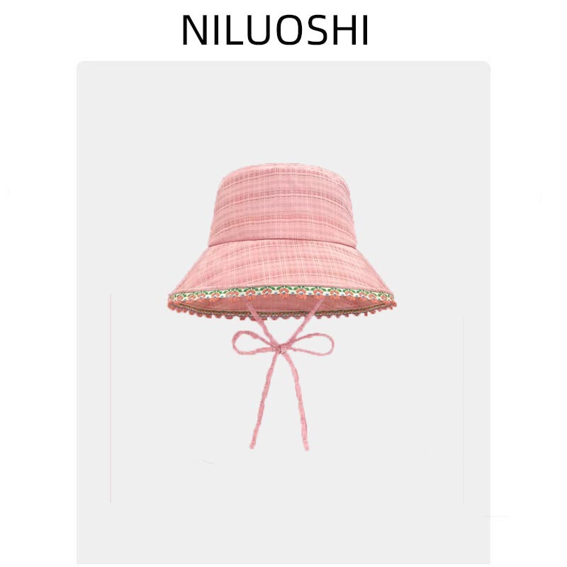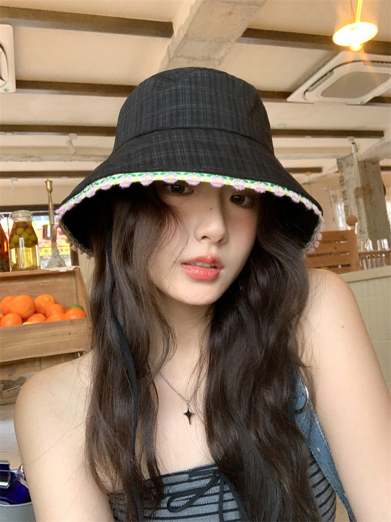 甜美可爱花边蓝色渔夫帽女春夏季遮阳防晒盆帽户外大帽檐登山帽潮