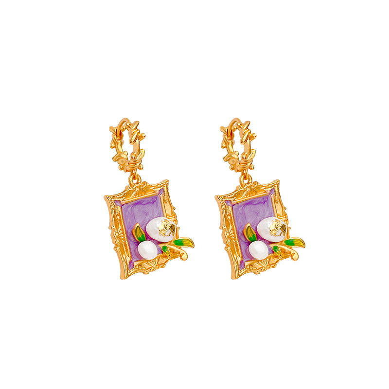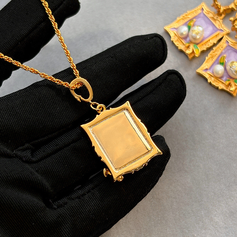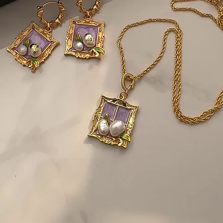 巴洛克珍珠锁骨链淡水珍珠项链女真金电镀紫色油画吊坠耳扣耳环女