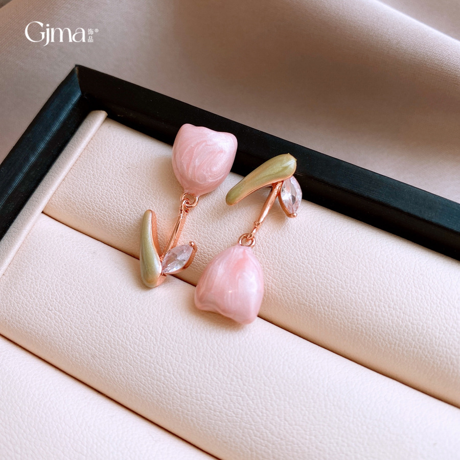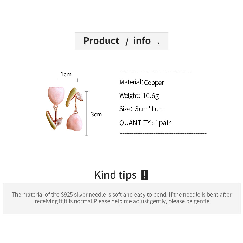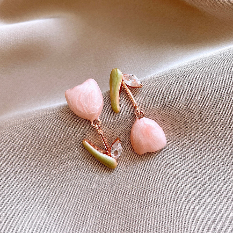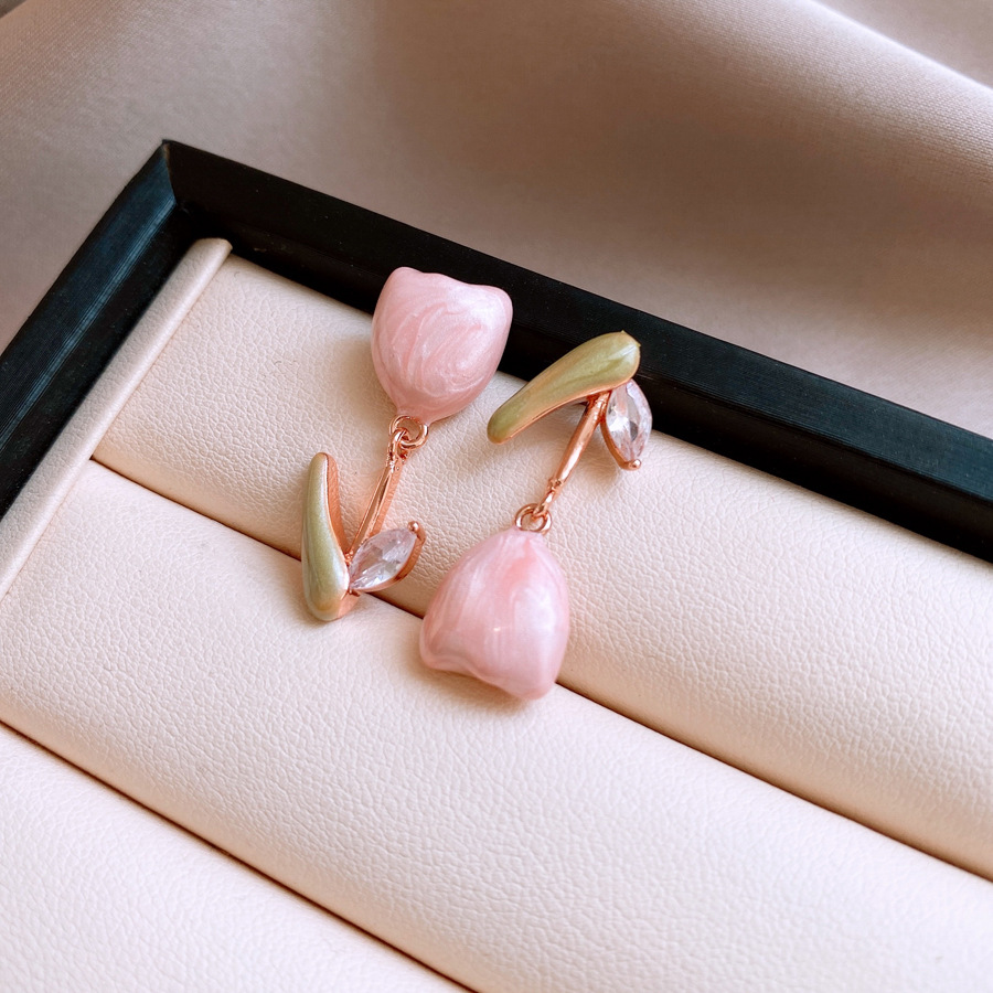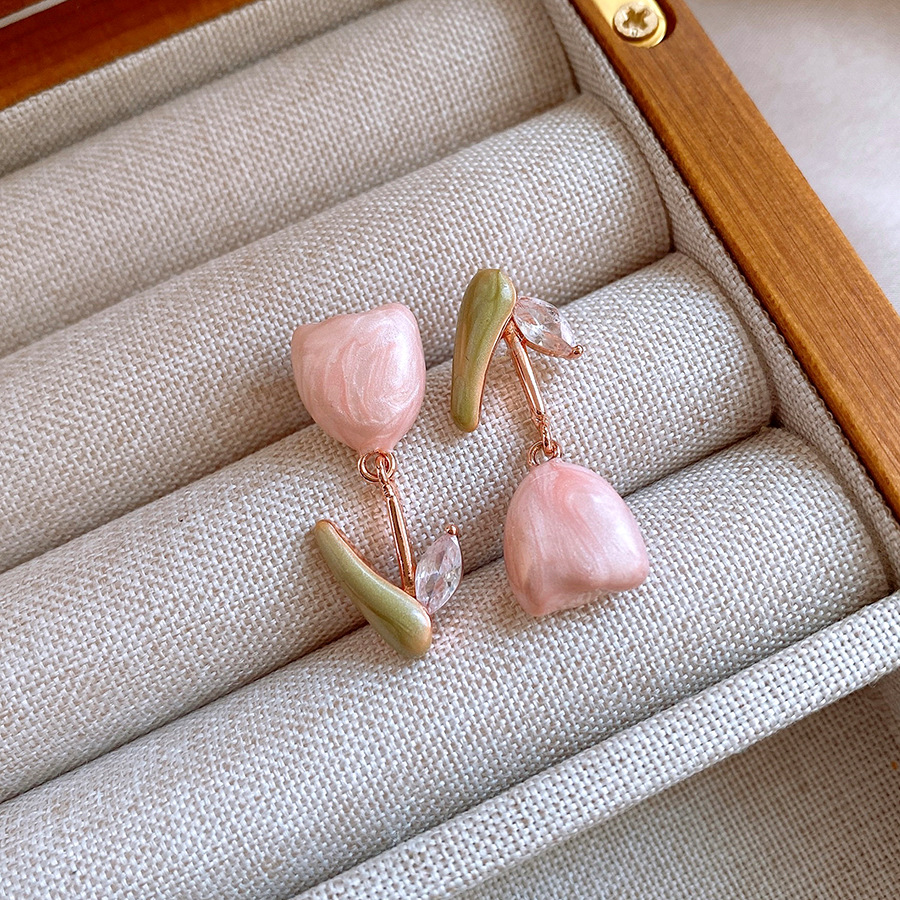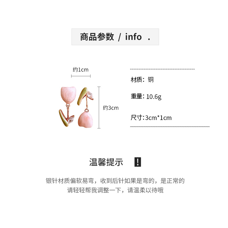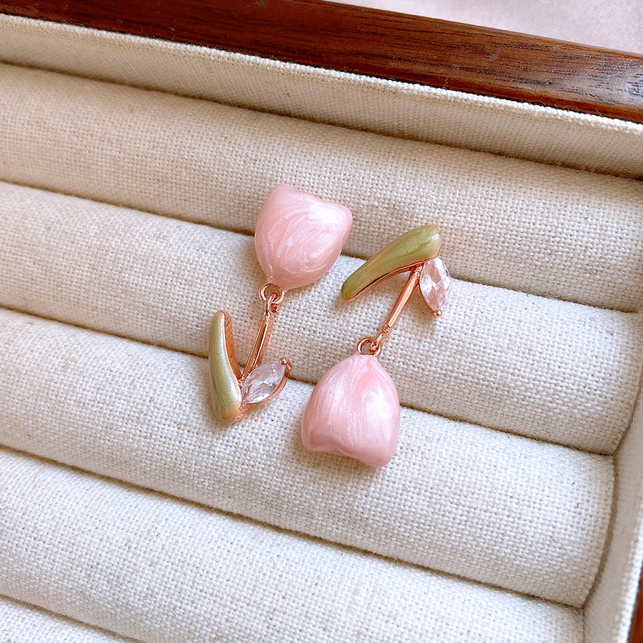 银针粉色滴油锆石郁金香耳钉法式甜美气质耳环时尚百搭高级感耳饰
