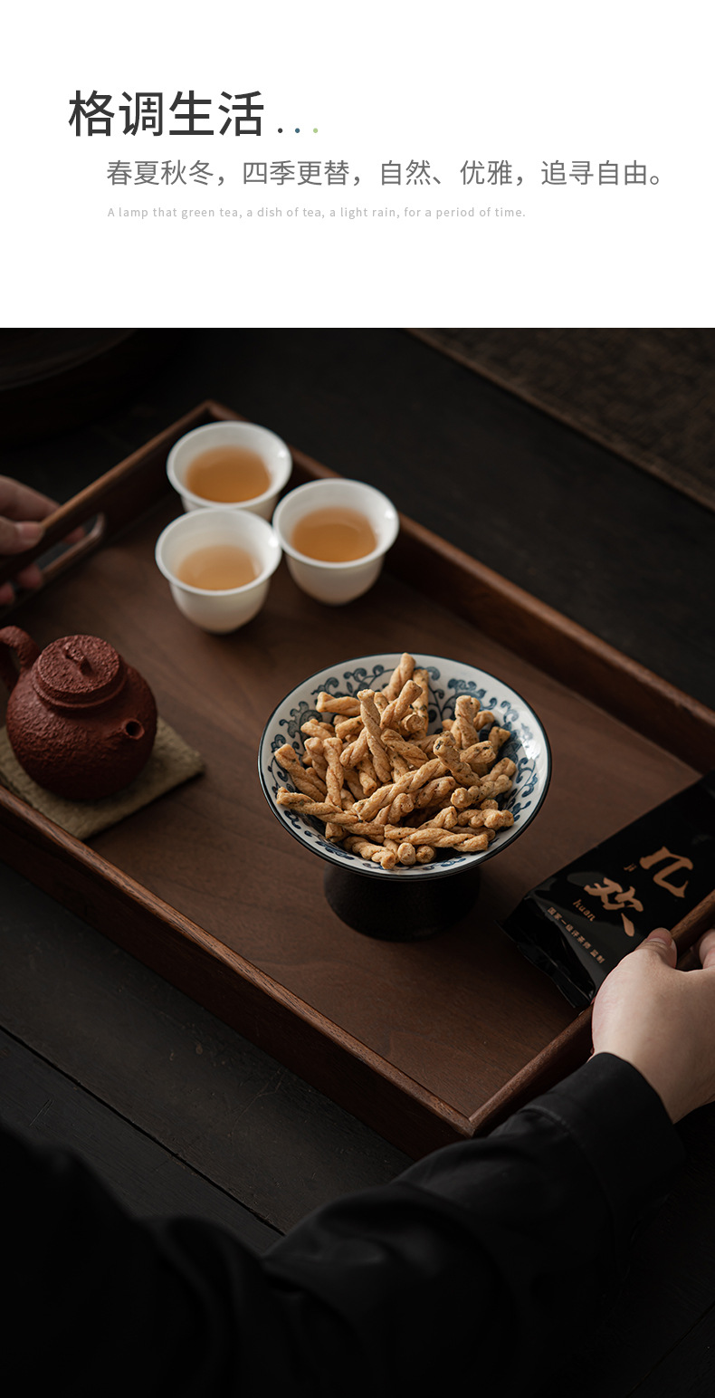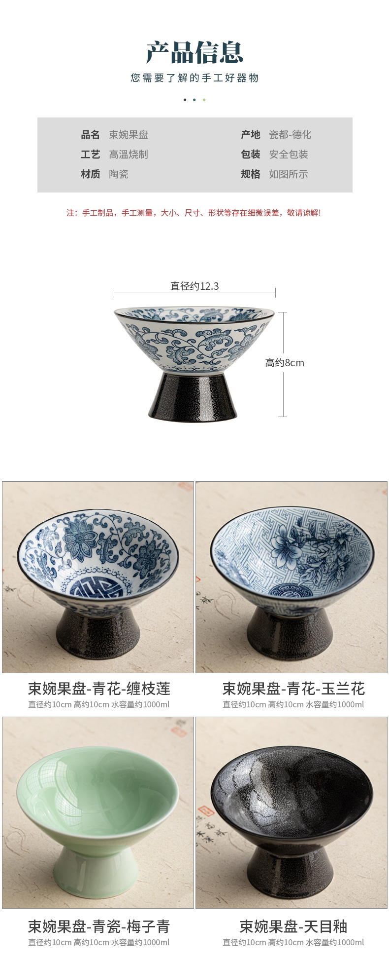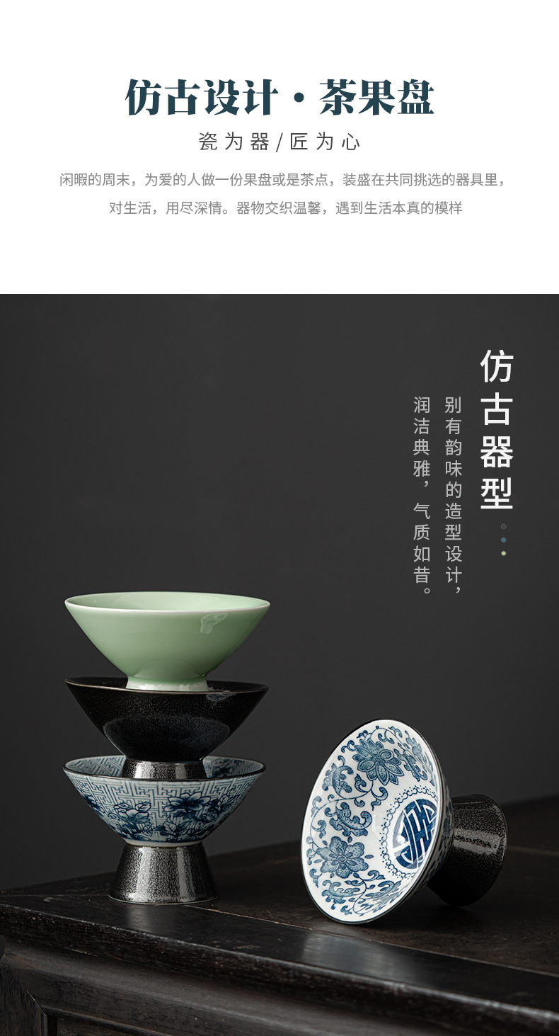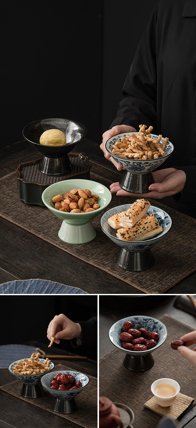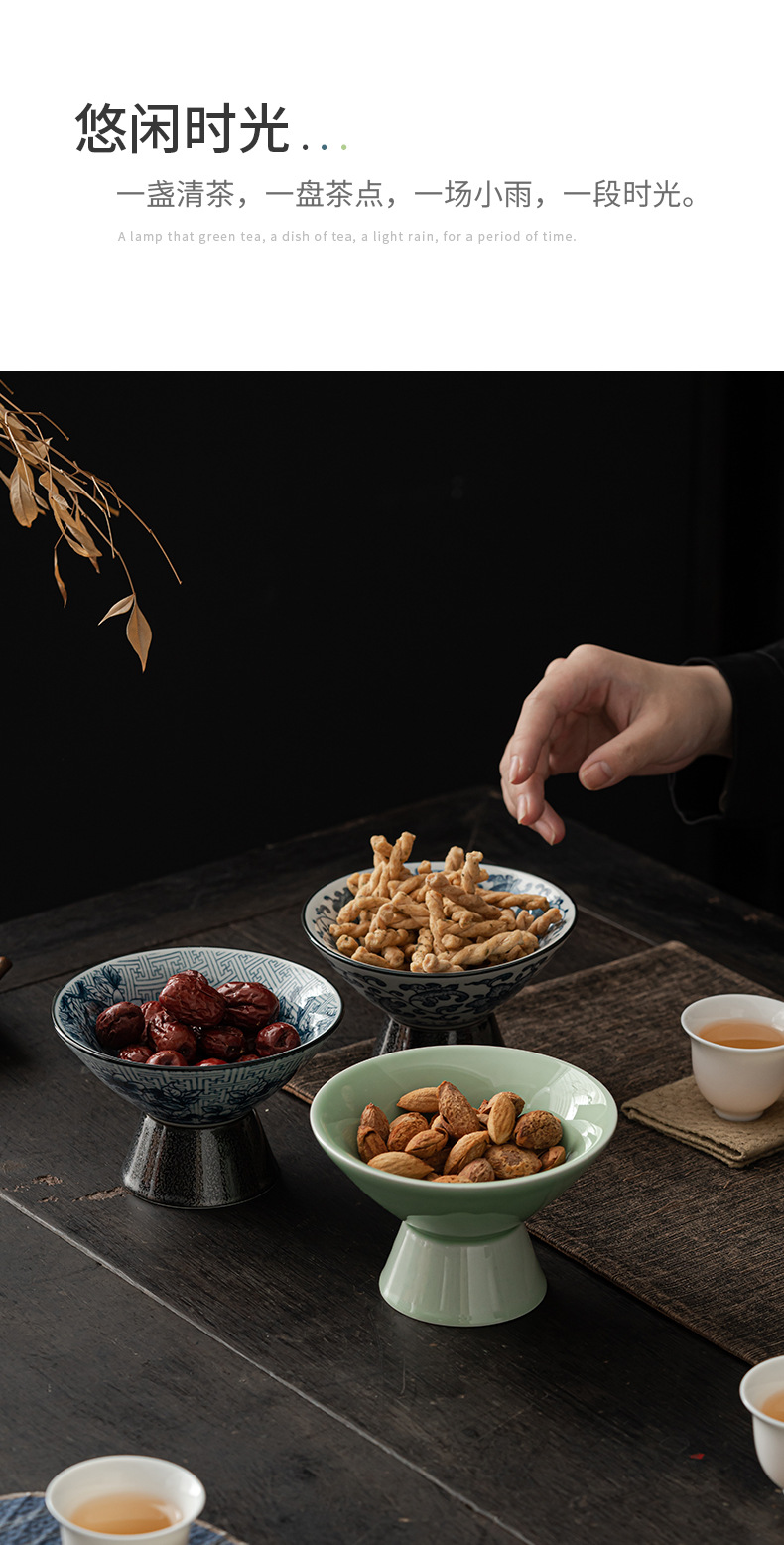 复古青花陶瓷茶点盘中式水果盘高脚家用零食盘茶几点干果心盘茶碟