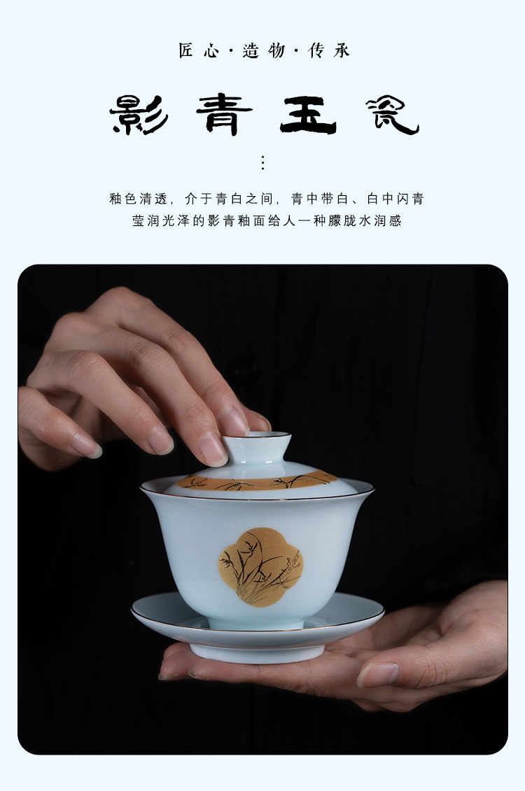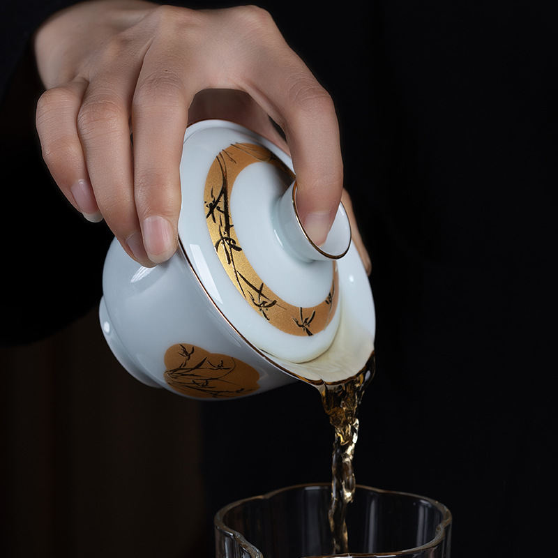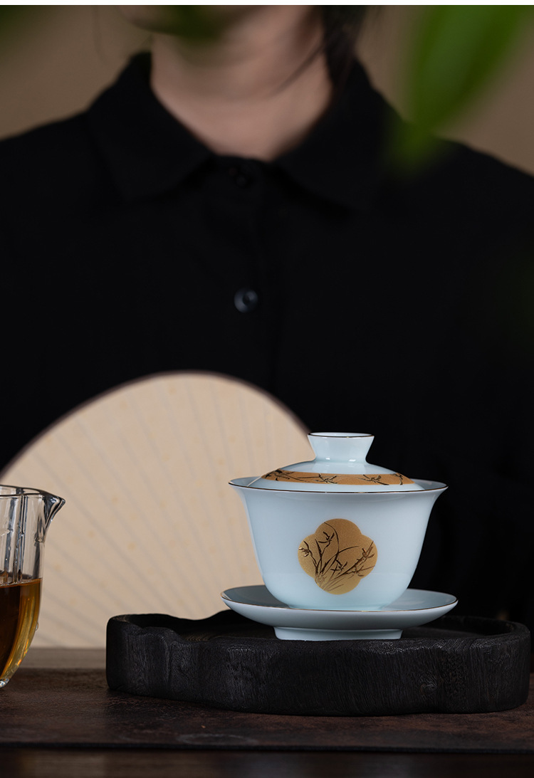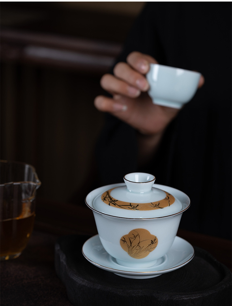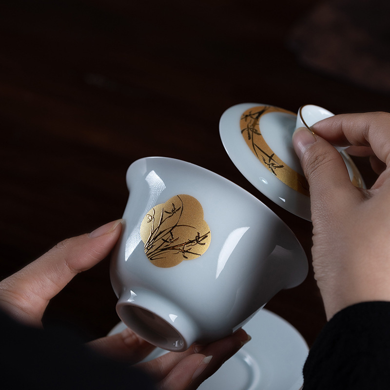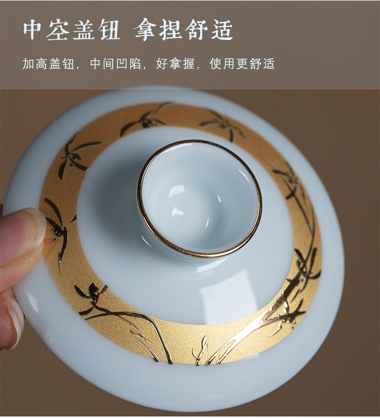 青白瓷三才带盖盖碗堆金描金泡茶杯中式敬茶碗家用大号功夫茶具