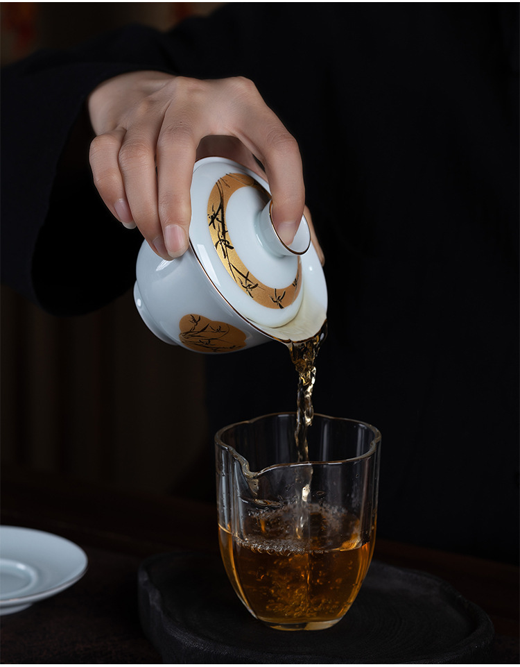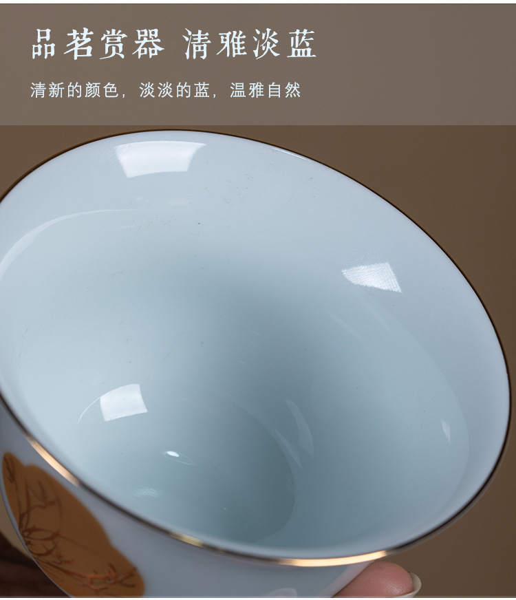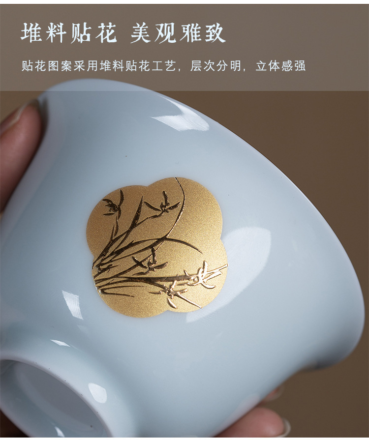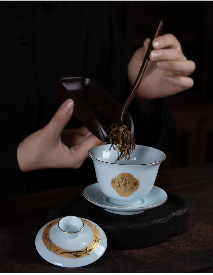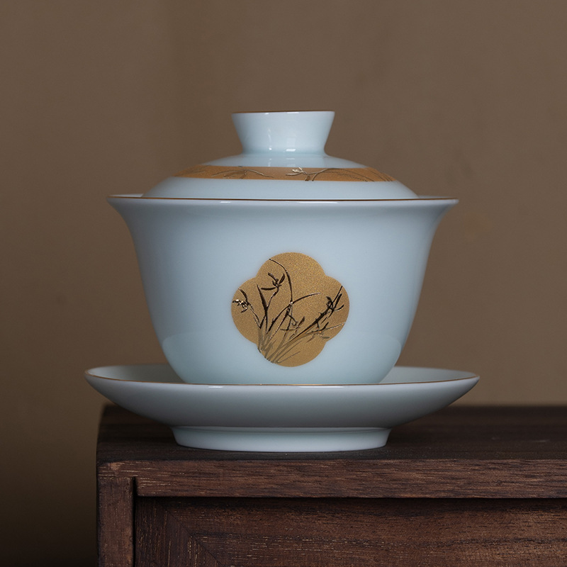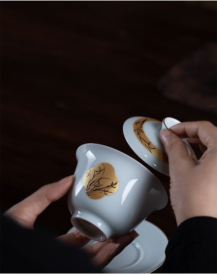 青白瓷三才带盖盖碗堆金描金泡茶杯中式敬茶碗家用大号功夫茶具