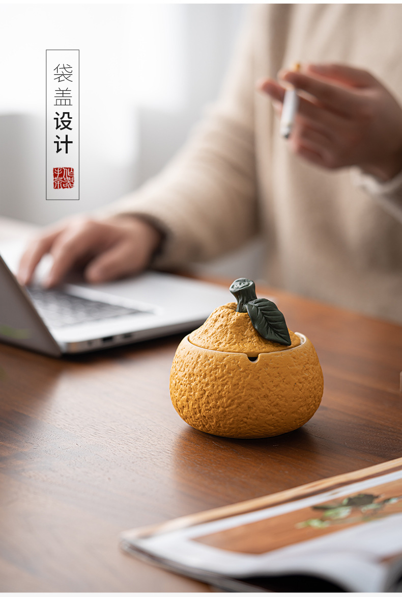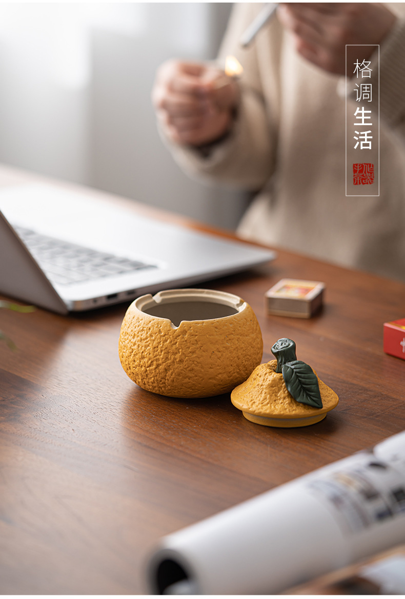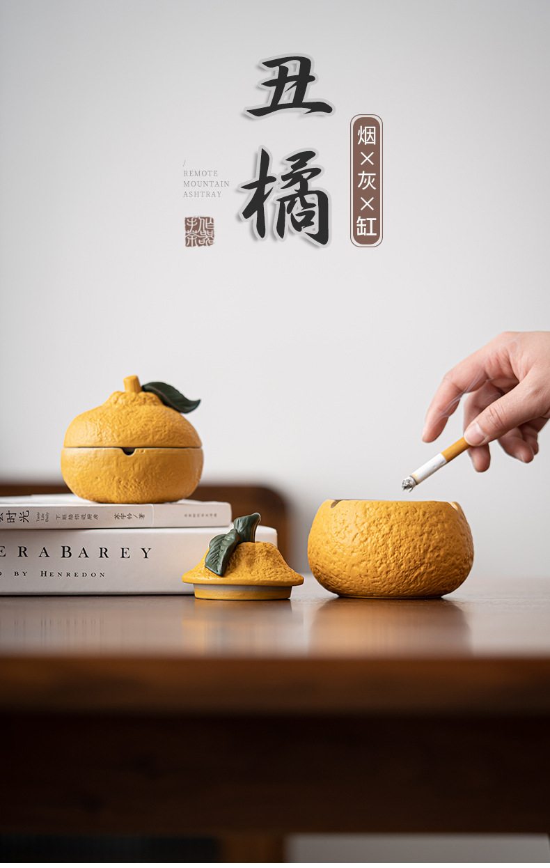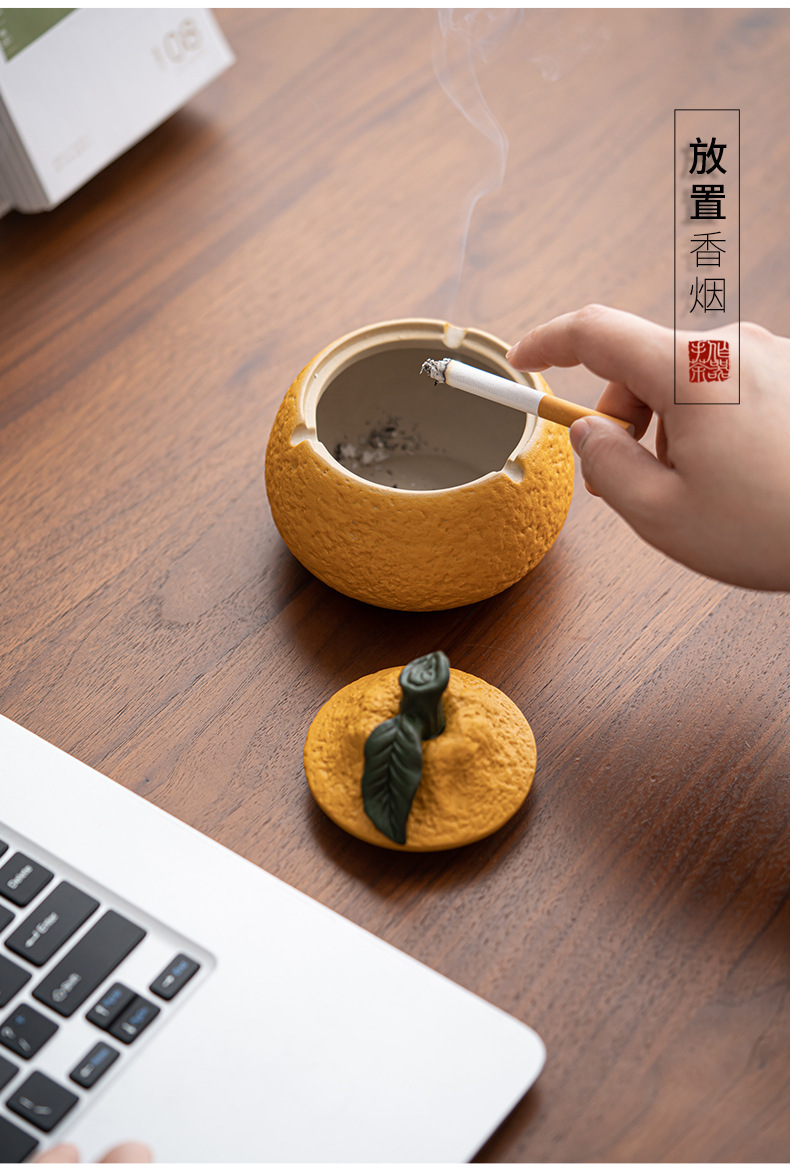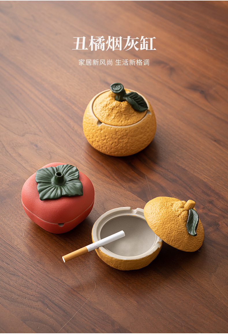 丑橘大吉大利创意陶瓷烟灰缸家用茶几带盖个性潮流装饰防风防飞灰