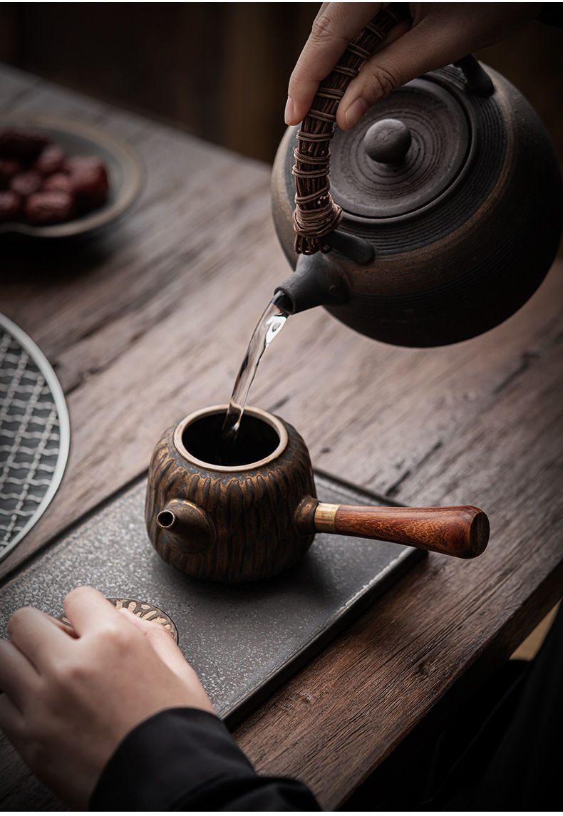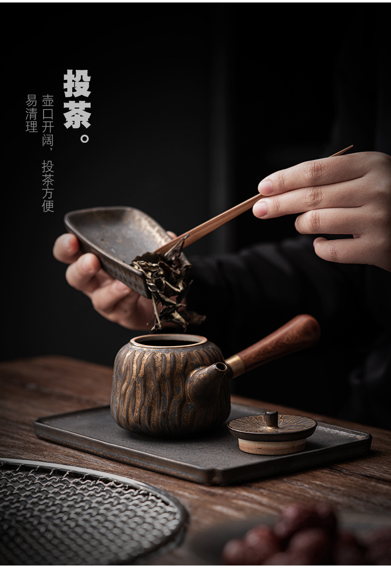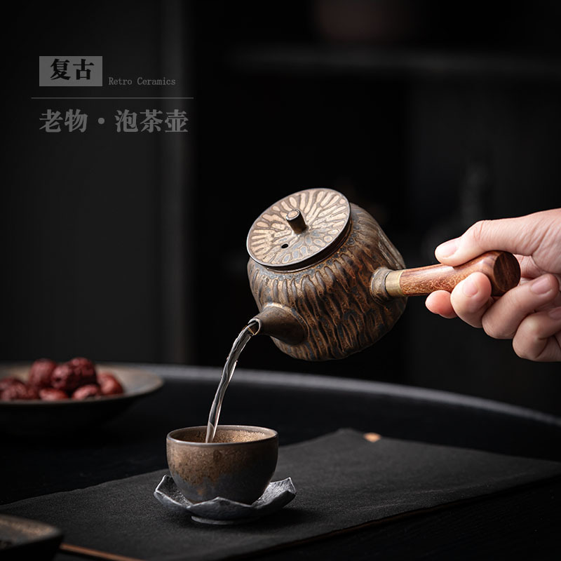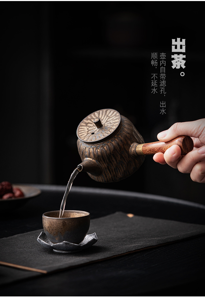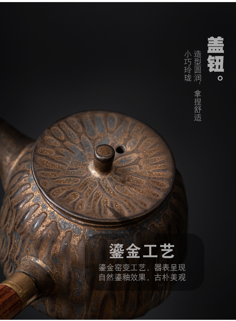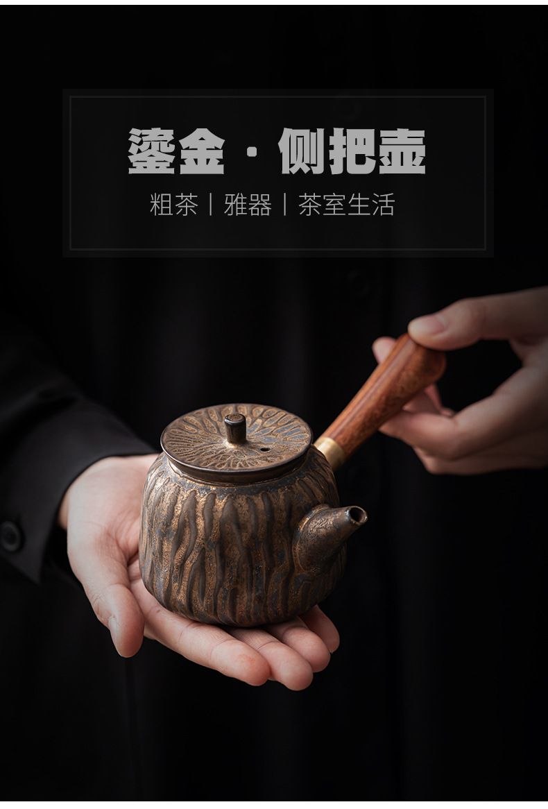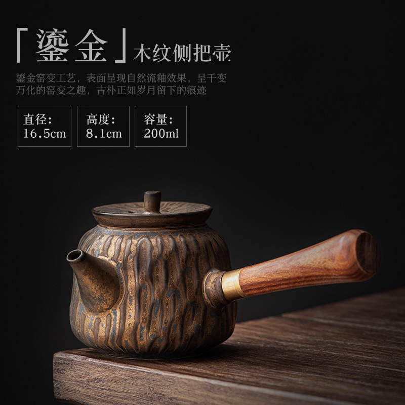 复古木柄侧把壶中式茶壶功夫茶具泡茶壶仿古鎏金做旧陶壶单壶批发