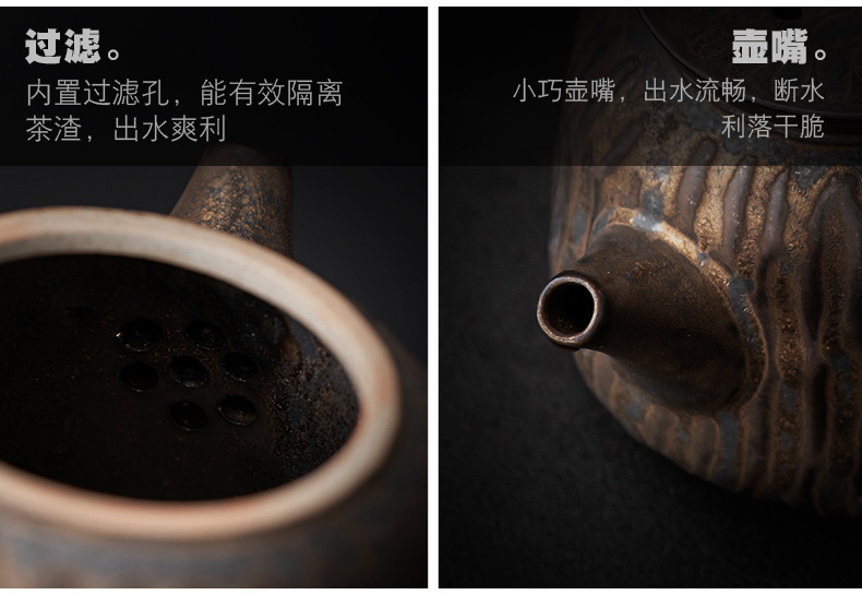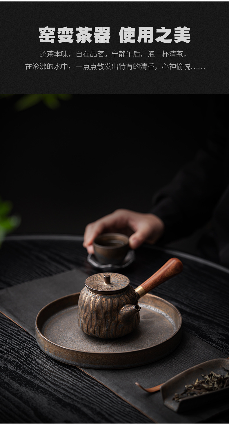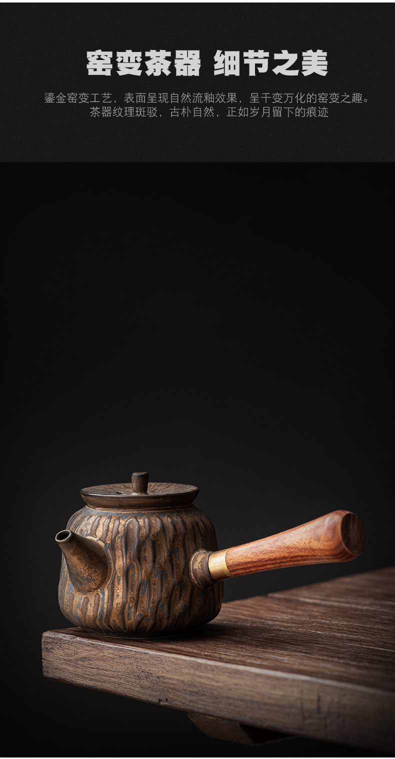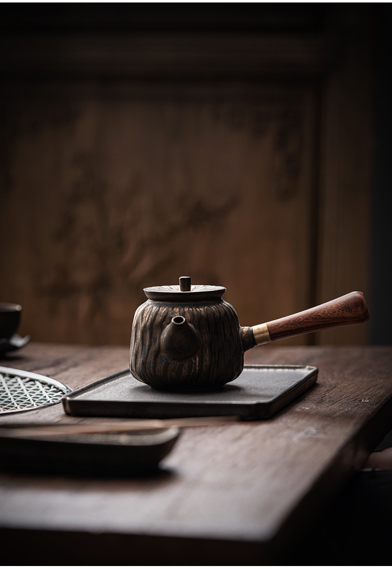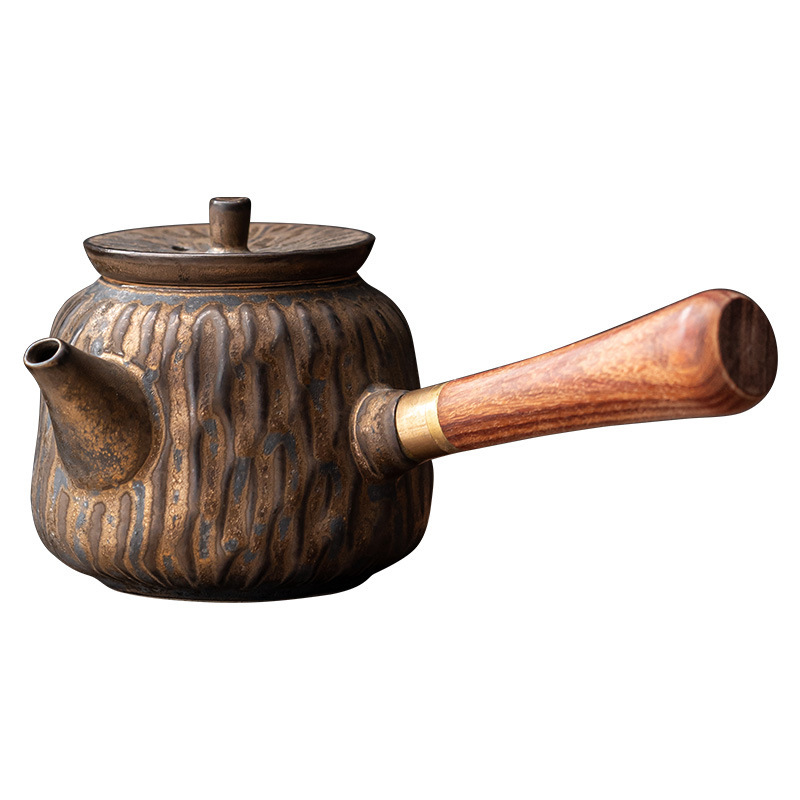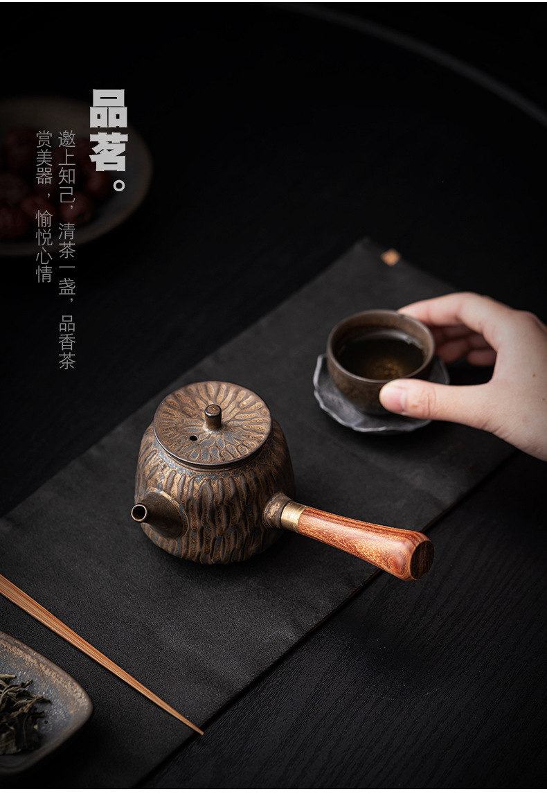 复古木柄侧把壶中式茶壶功夫茶具泡茶壶仿古鎏金做旧陶壶单壶批发