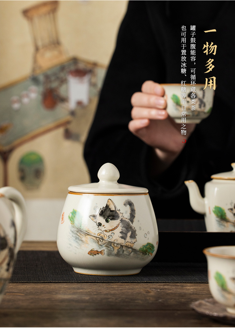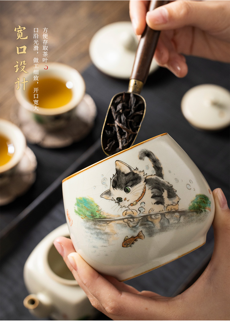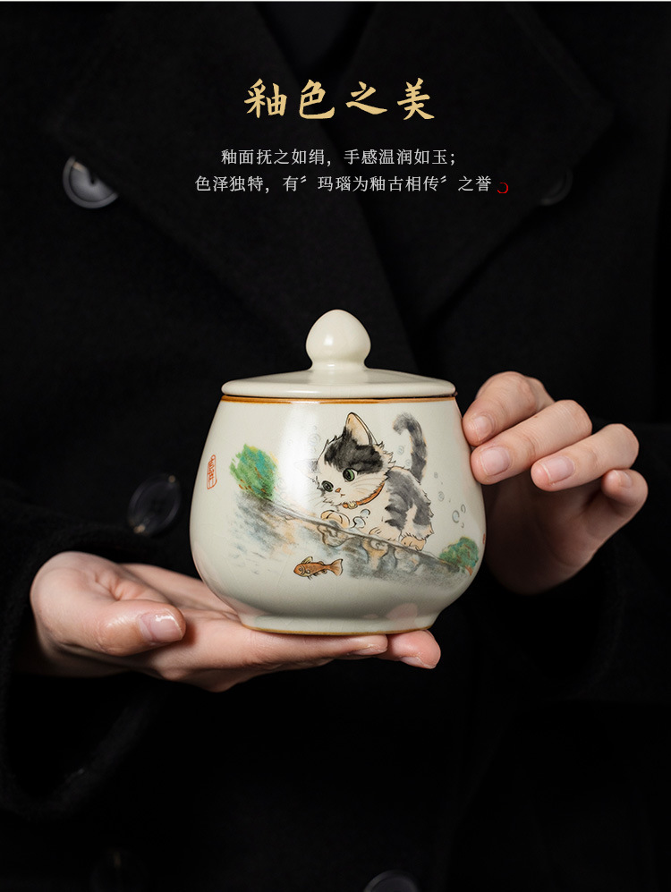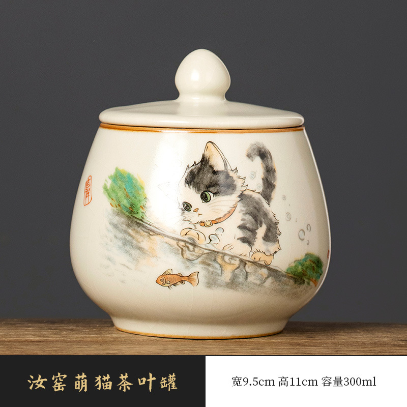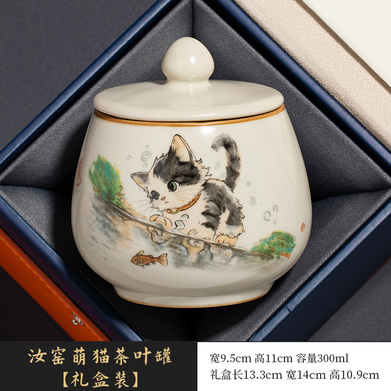 汝窑萌猫茶叶罐陶瓷储存罐茶叶精品高档包装送礼礼品密封罐防潮罐