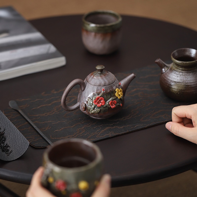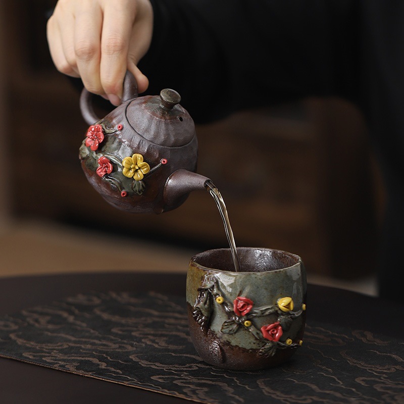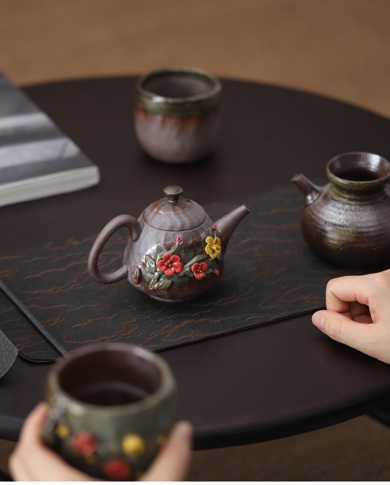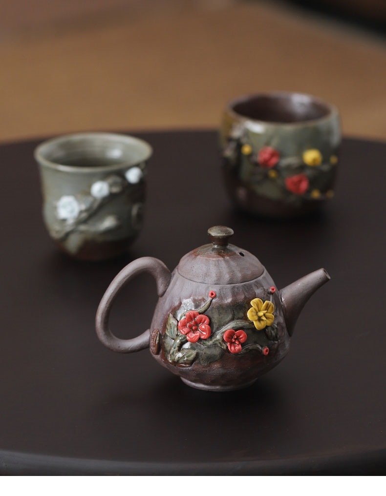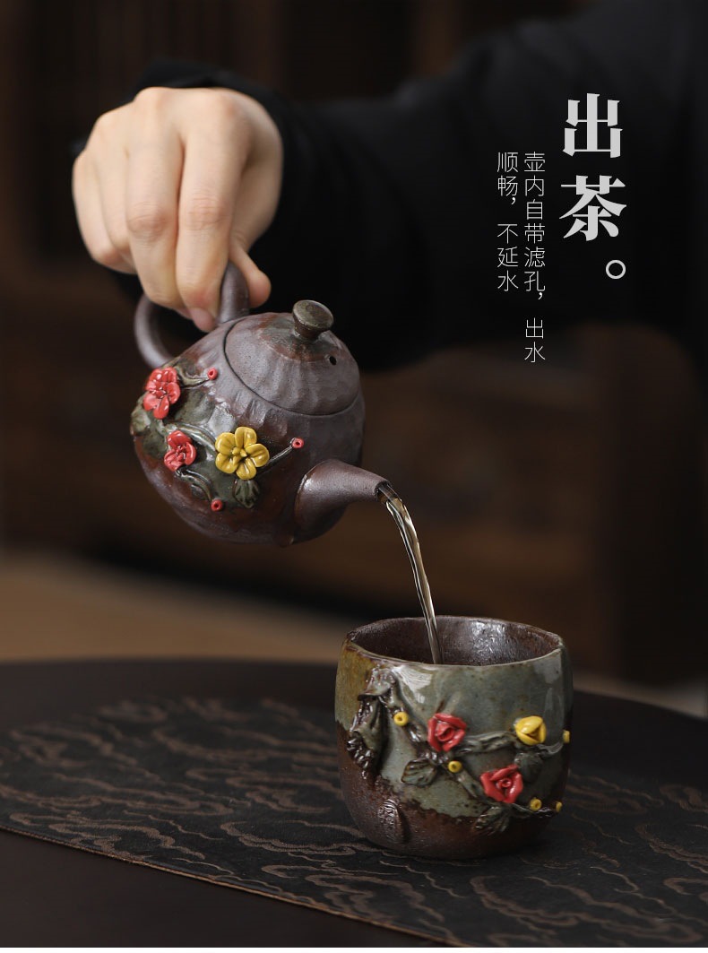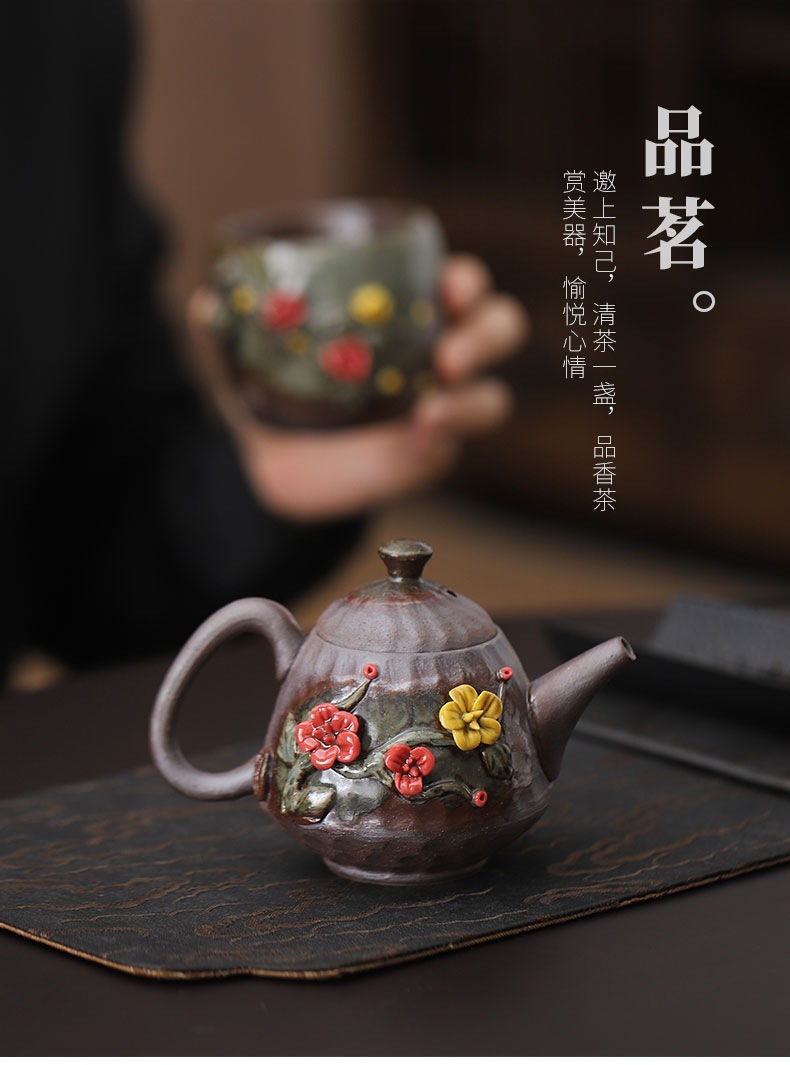 柴烧粗陶茶壶手工捏花粉彩花韵茶壶岩矿材质功夫茶道手持泡茶器