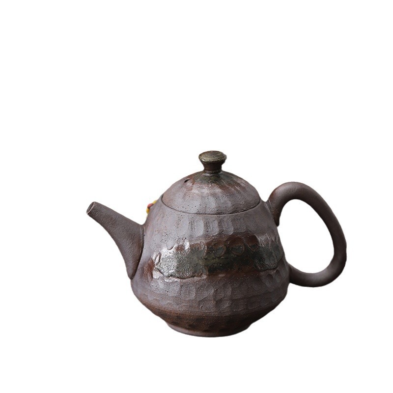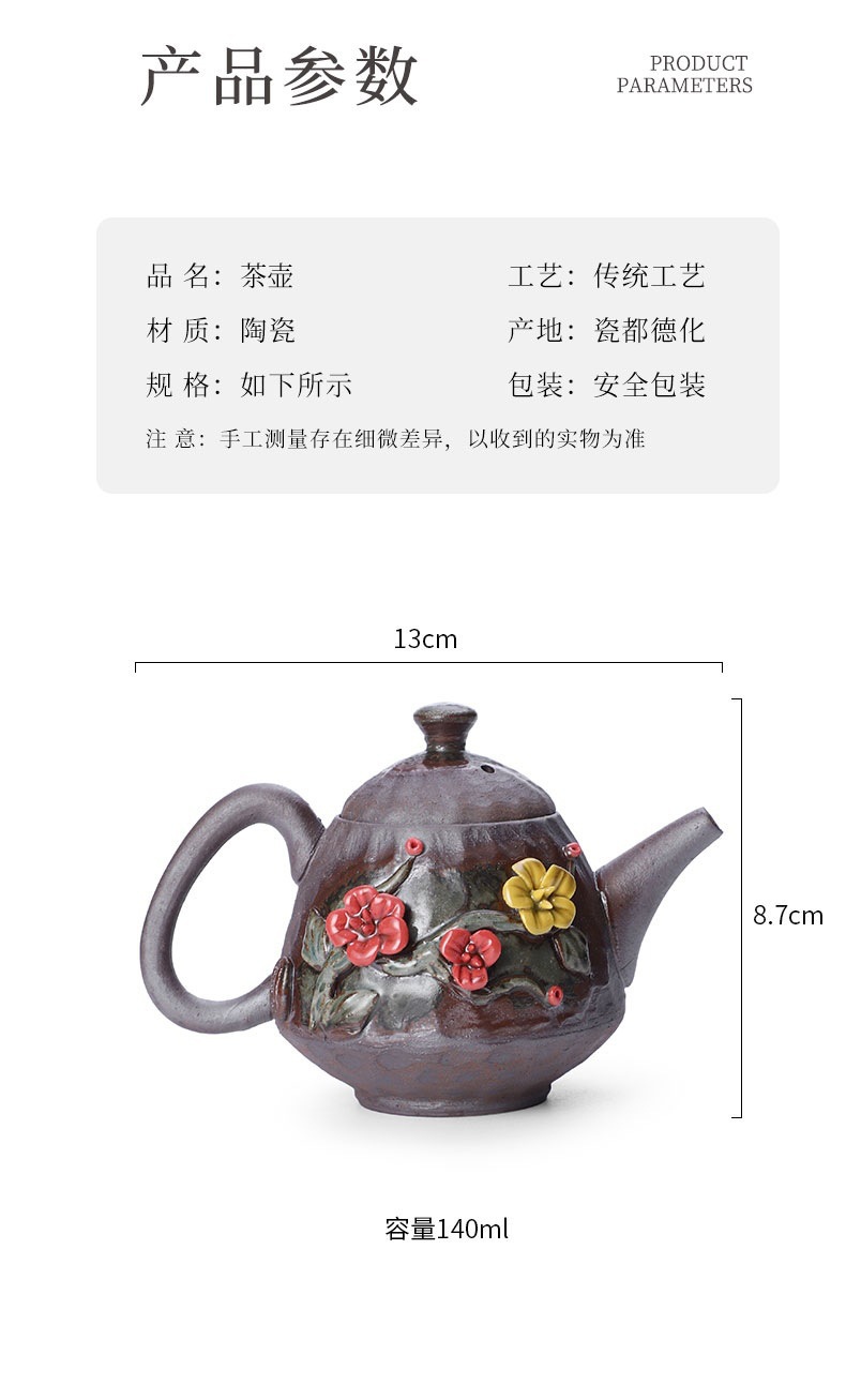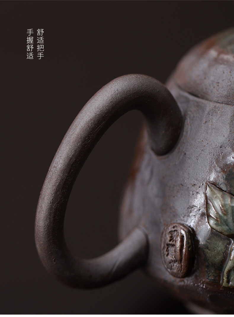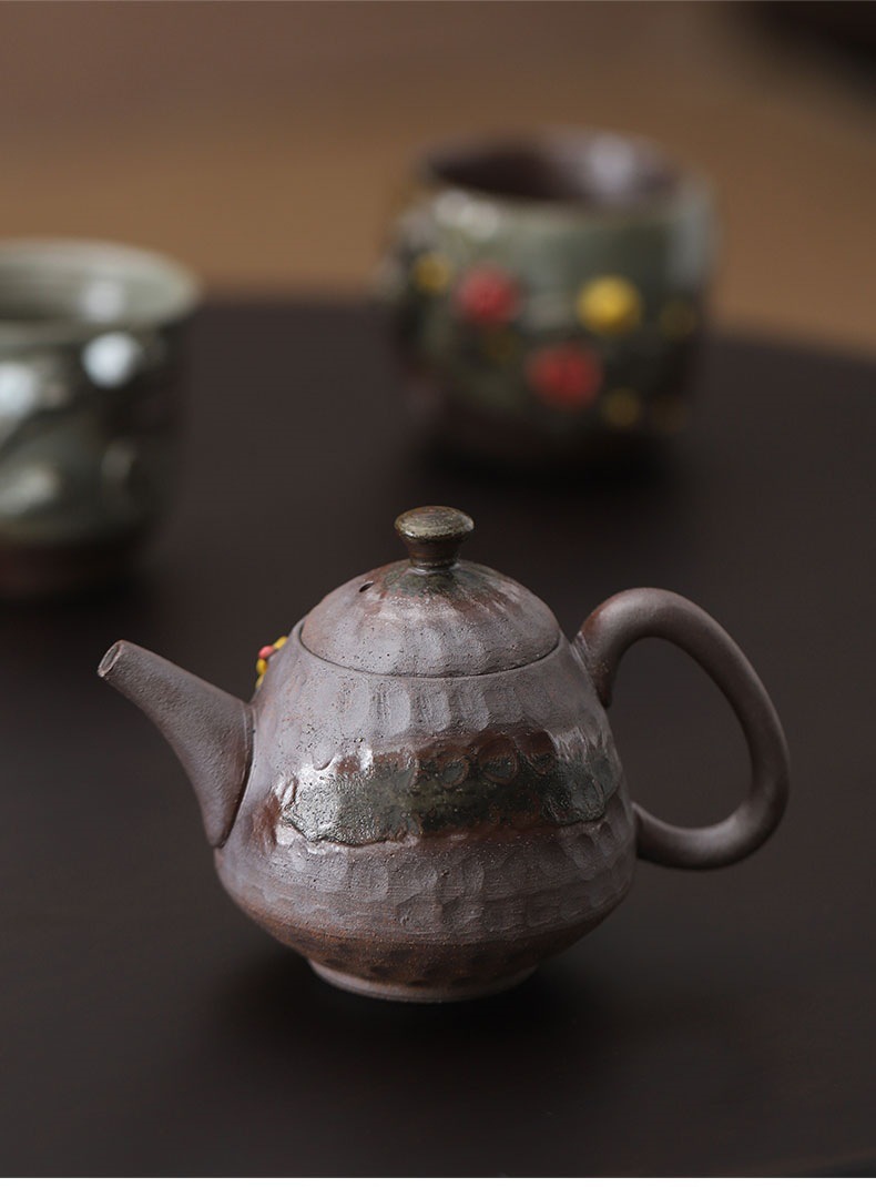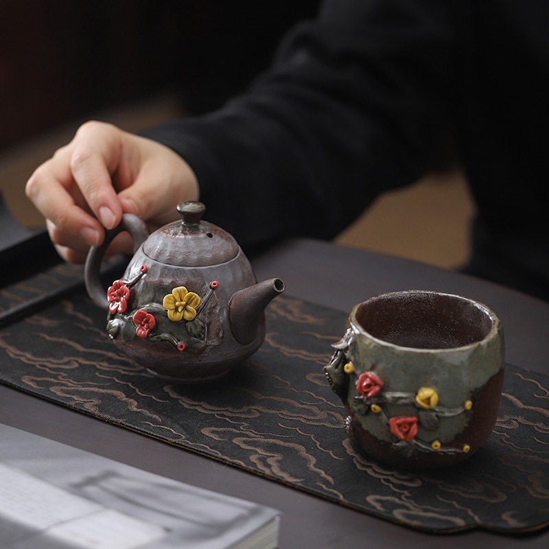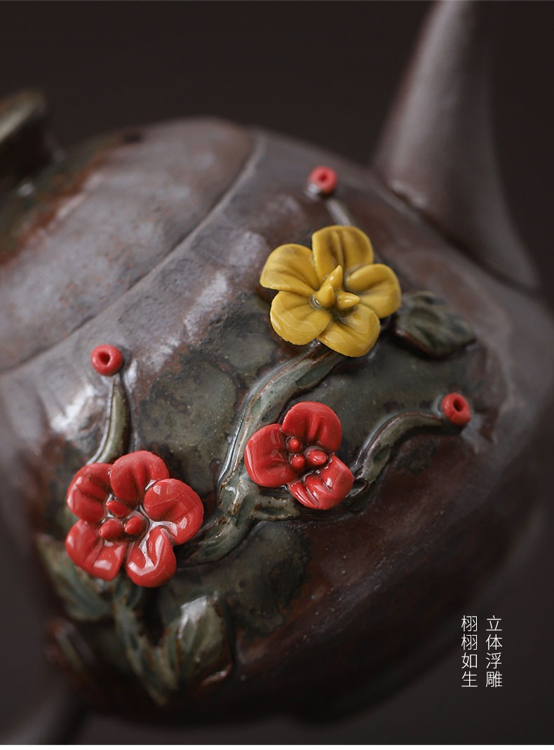 柴烧粗陶茶壶手工捏花粉彩花韵茶壶岩矿材质功夫茶道手持泡茶器