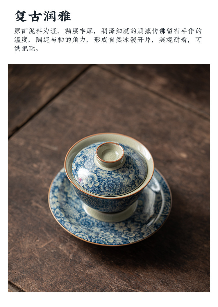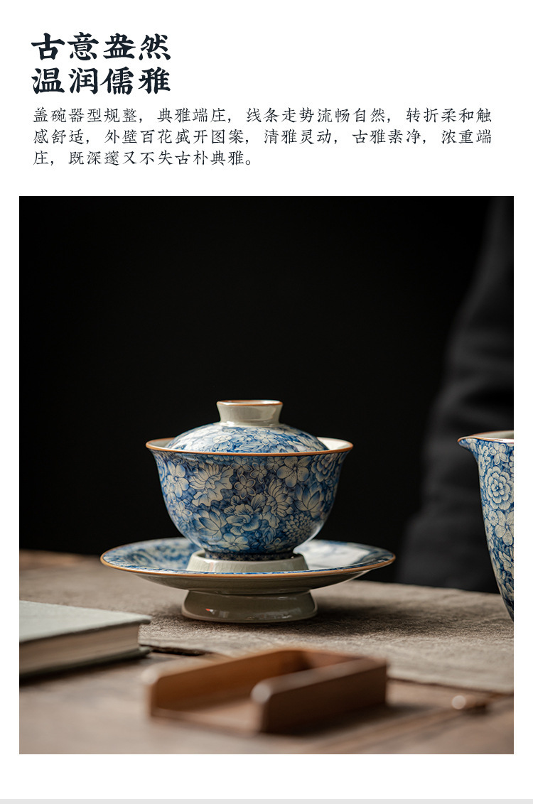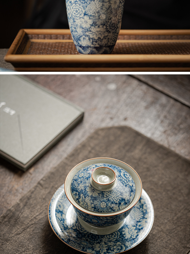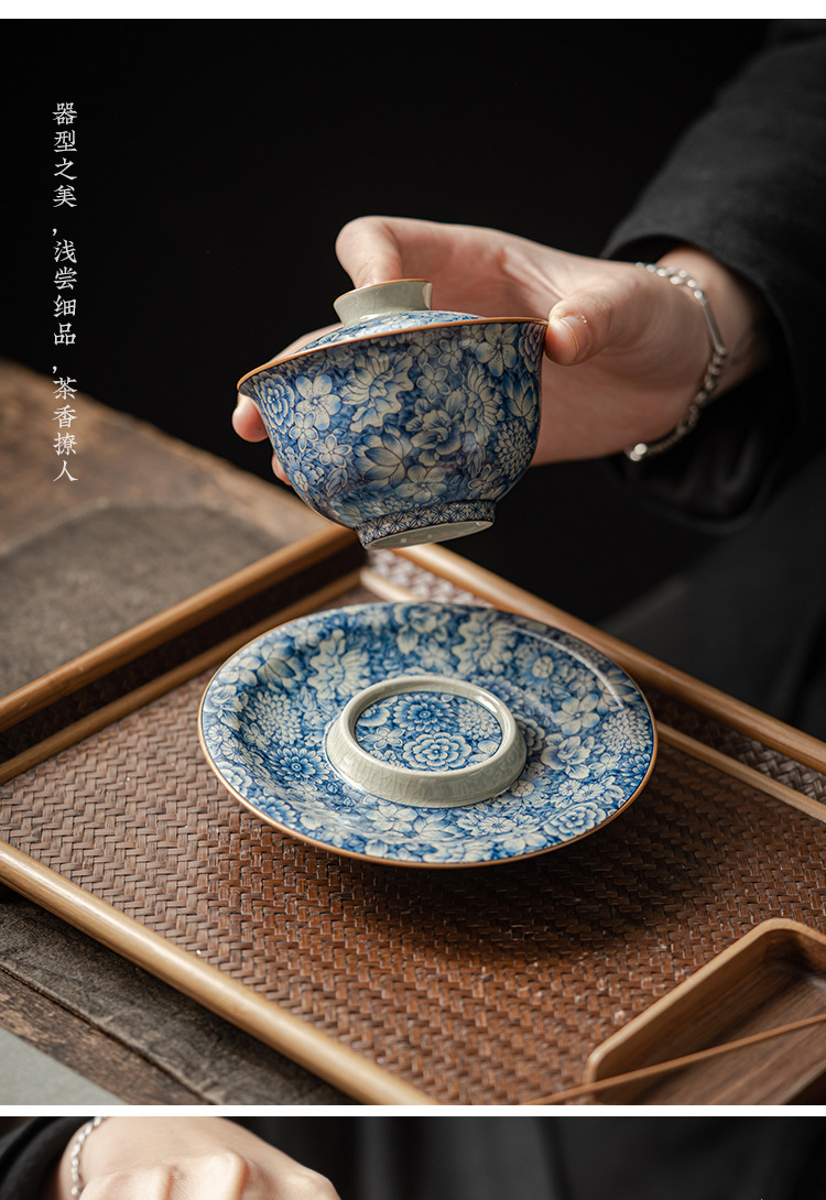 青花陶瓷三才盖碗大号壶承手抓碗日式禅意茶杯带盖复古单个泡茶碗
