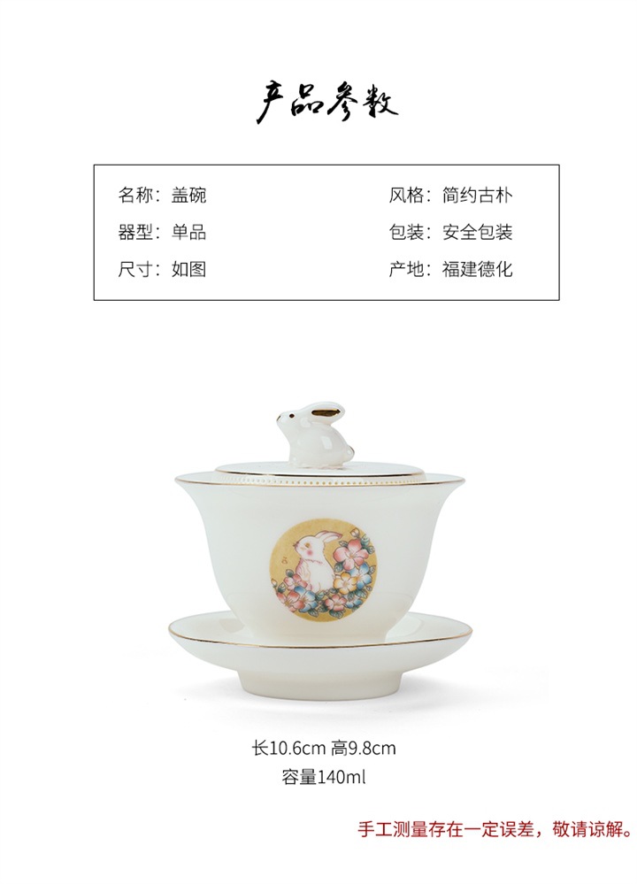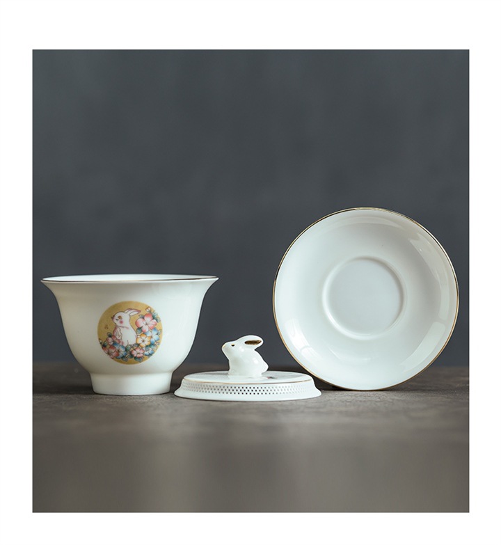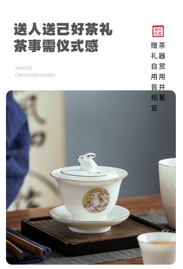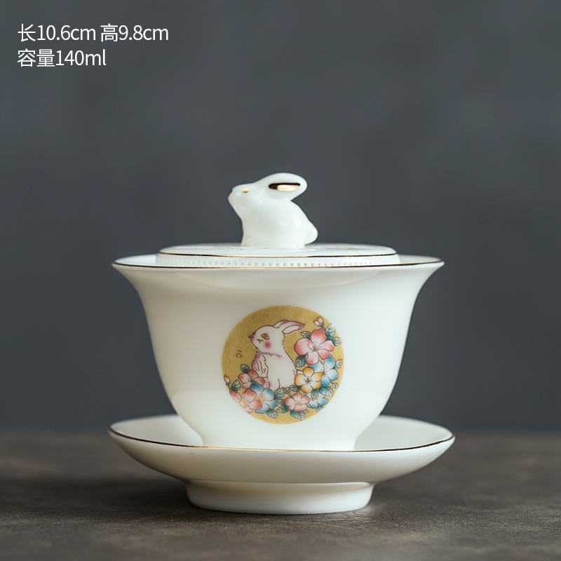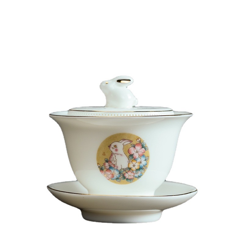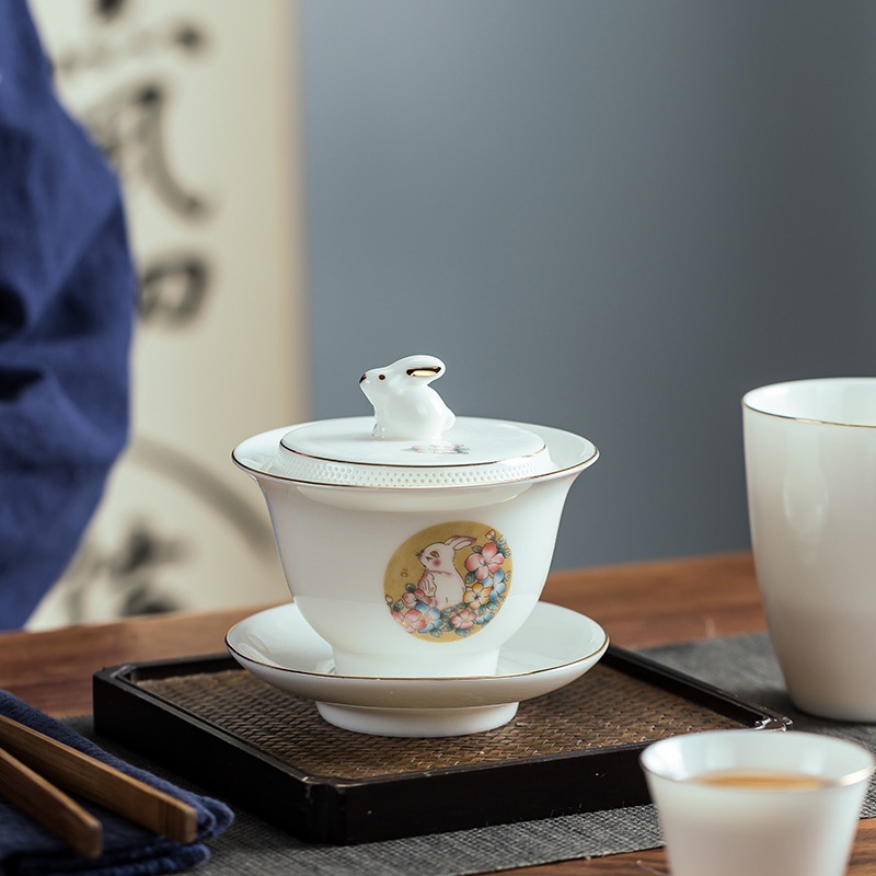 羊脂玉粉彩盖碗功夫茶具手工防烫兔子盖碗家用生肖兔子三才碗描金
