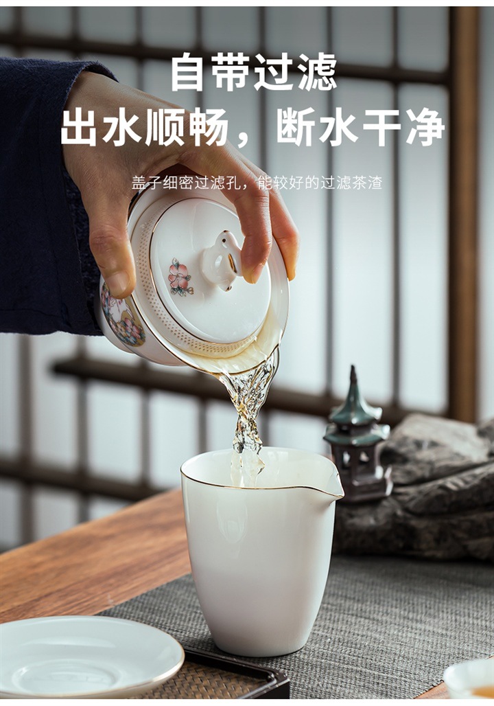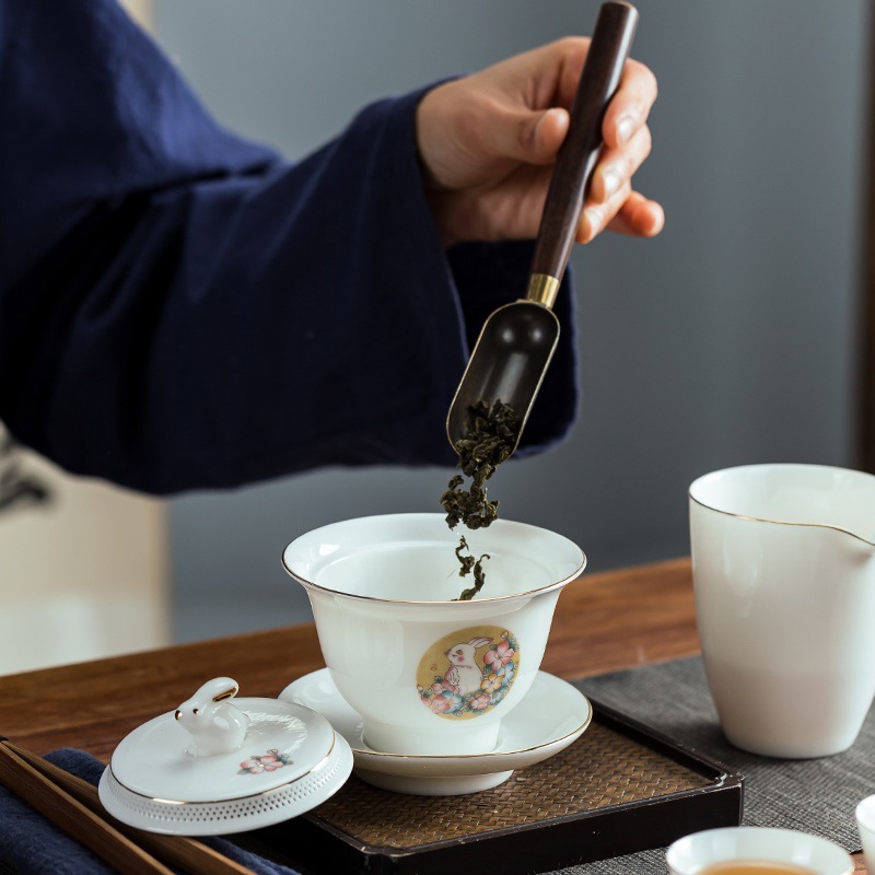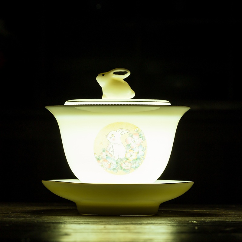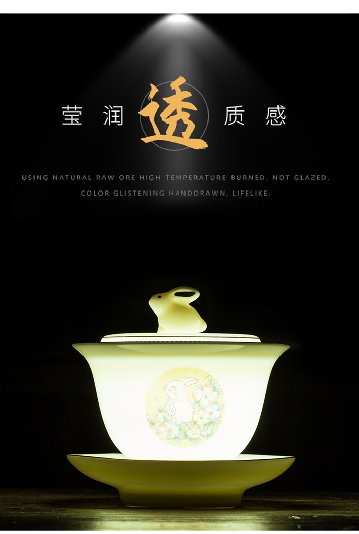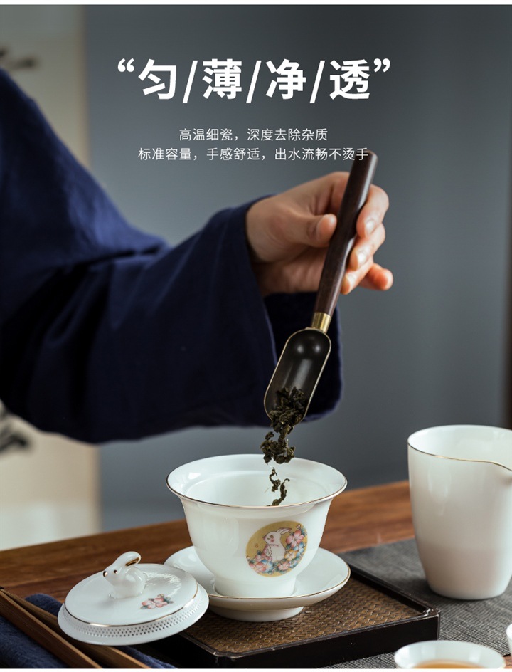 羊脂玉粉彩盖碗功夫茶具手工防烫兔子盖碗家用生肖兔子三才碗描金
