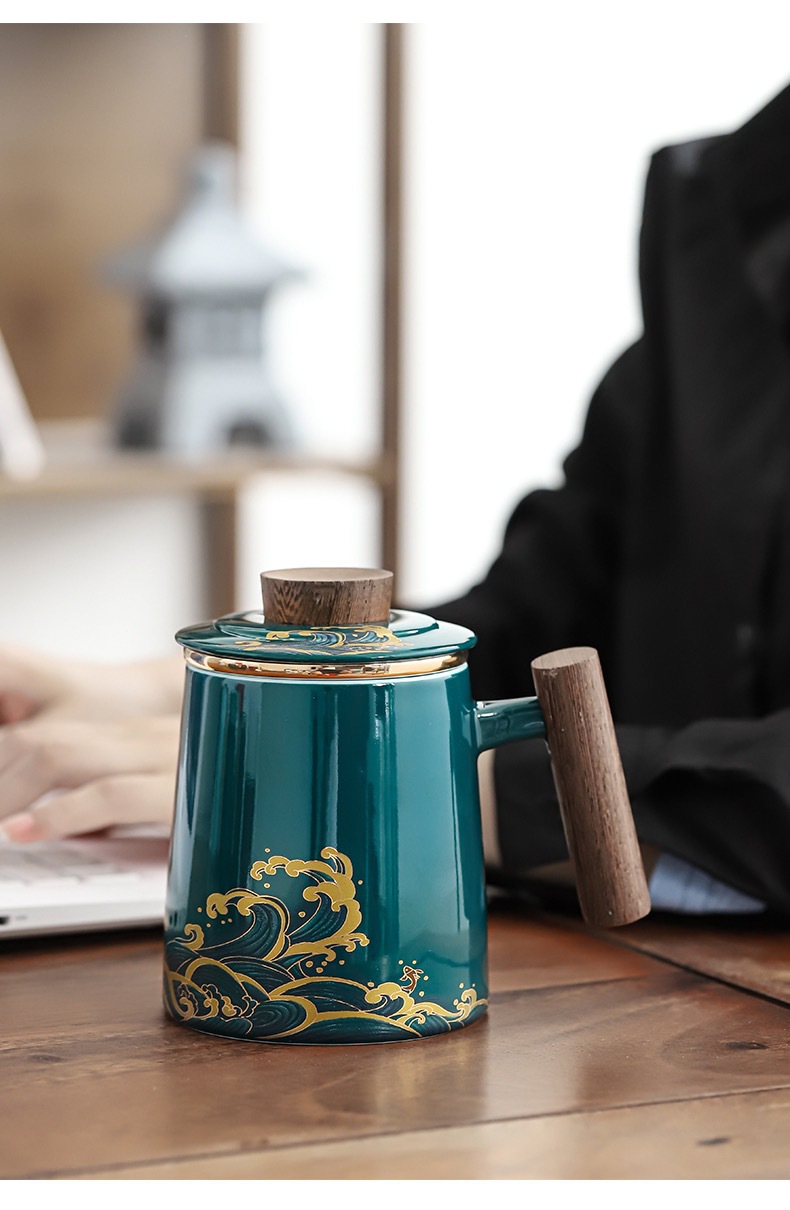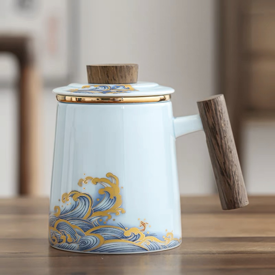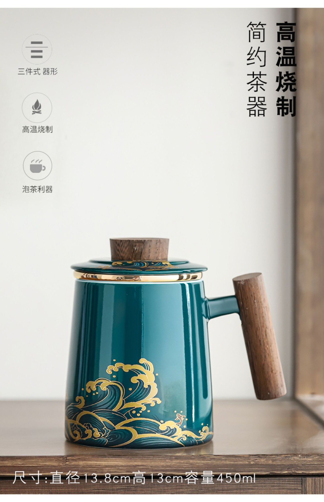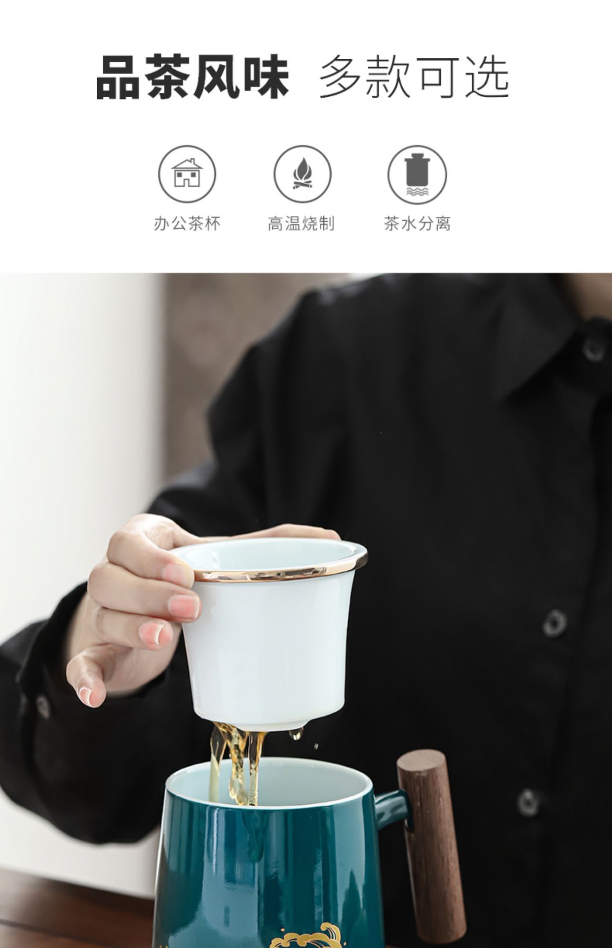 陶瓷马克杯水杯茶杯茶水分离带盖家用大容量木柄办公室个人泡茶