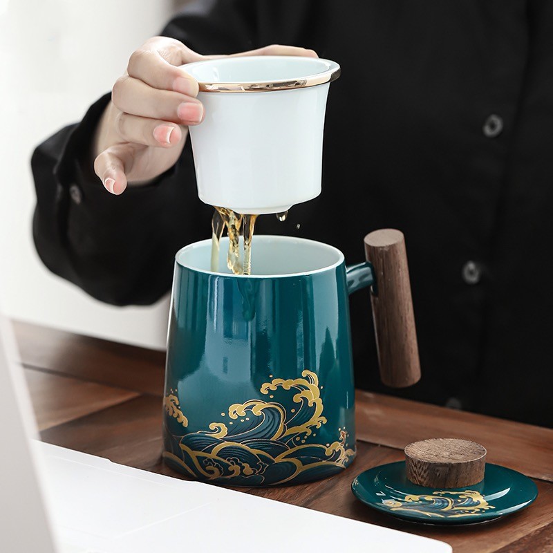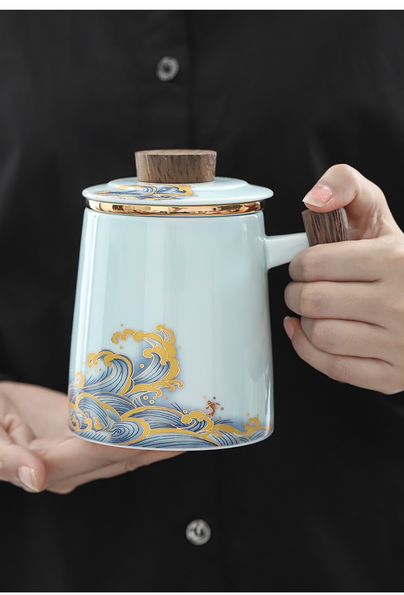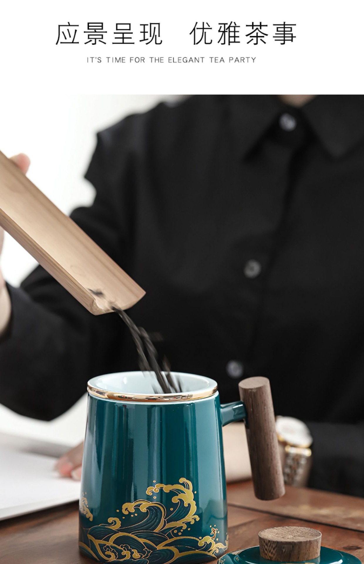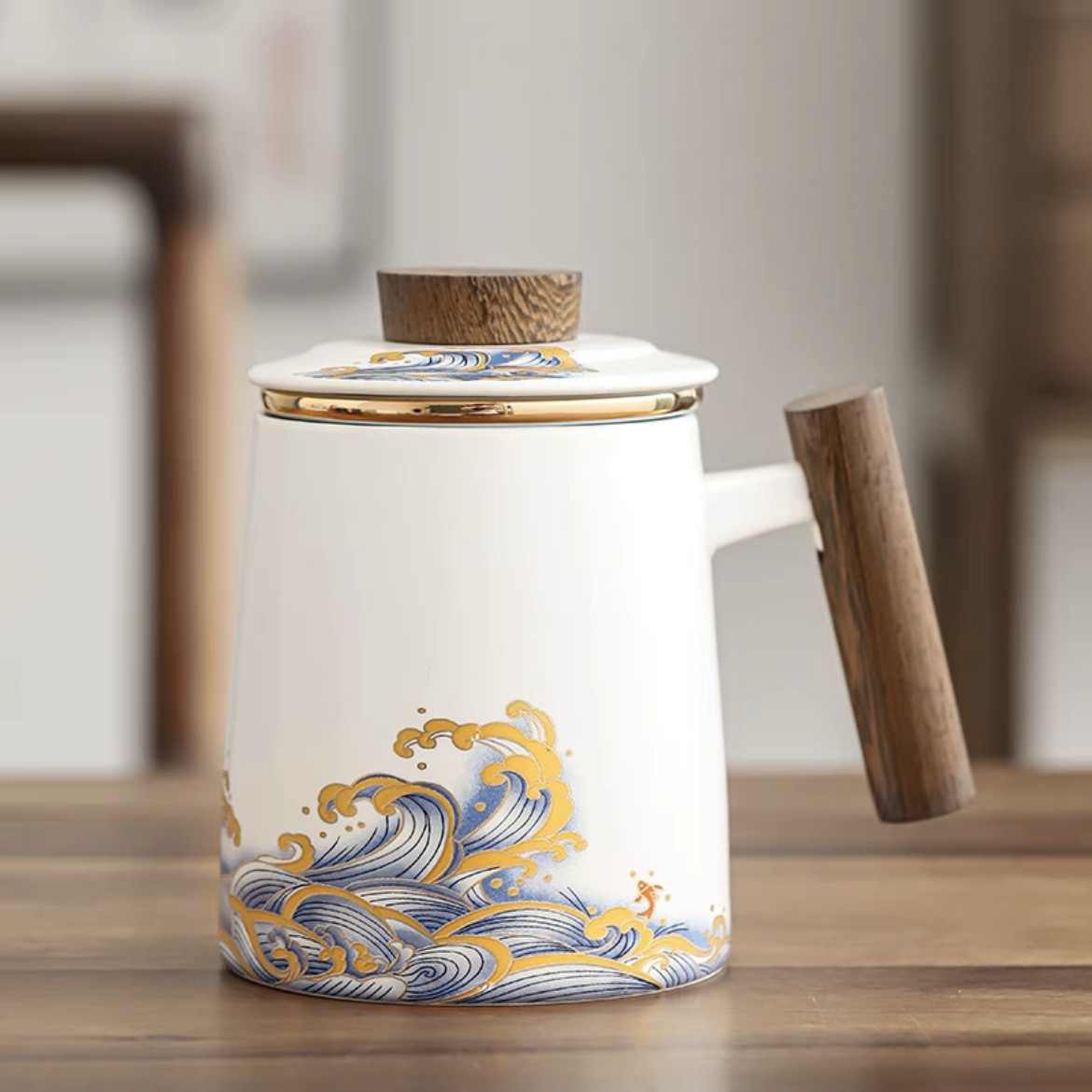 陶瓷马克杯水杯茶杯茶水分离带盖家用大容量木柄办公室个人泡茶
