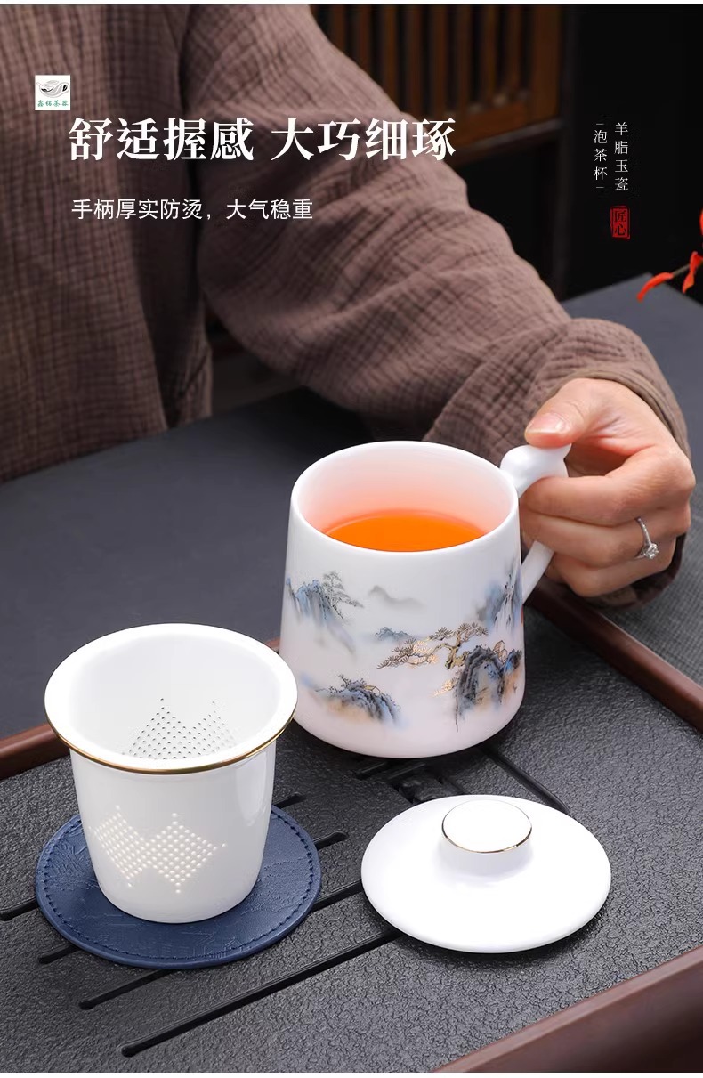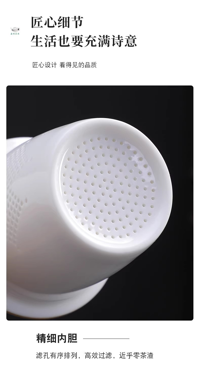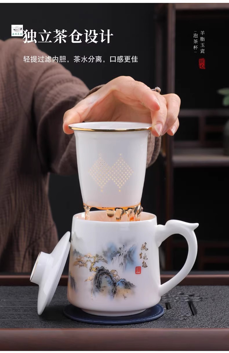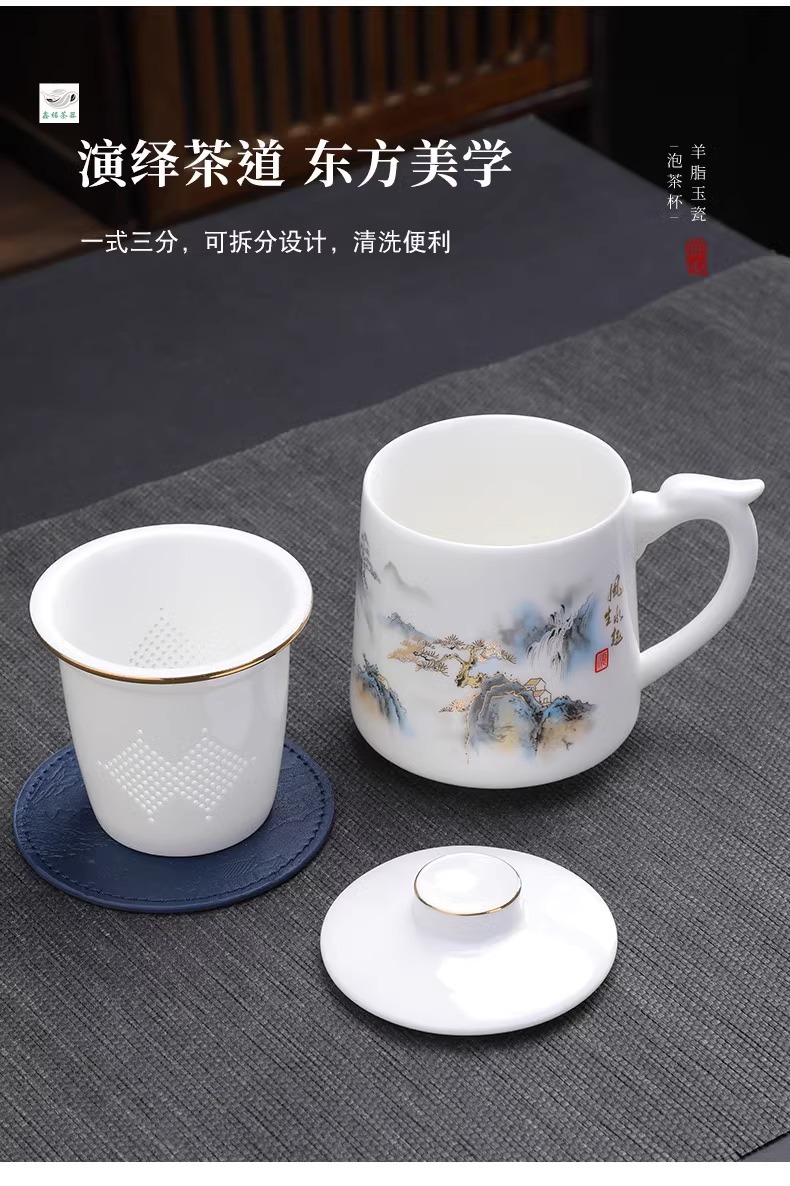 茶杯三件套陶瓷办公杯羊脂玉白瓷办公家用泡茶杯茶水分离马克杯