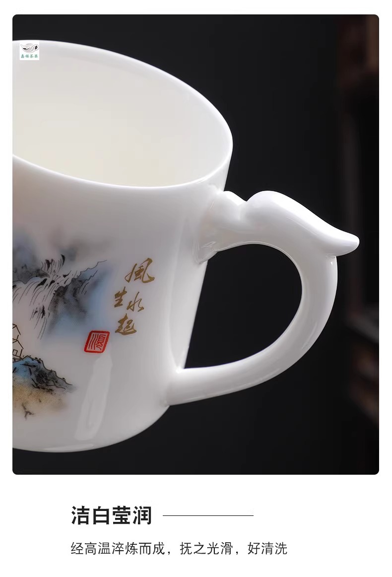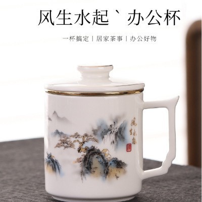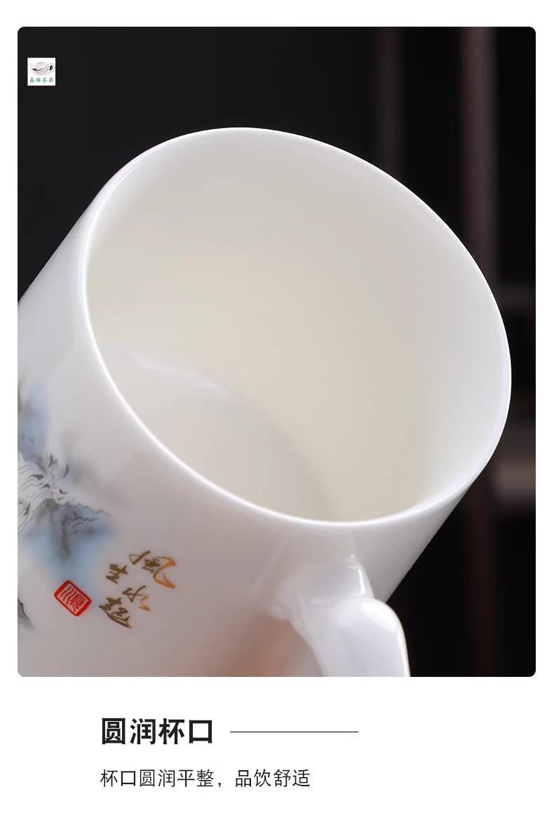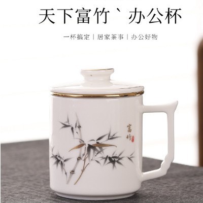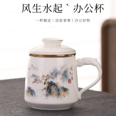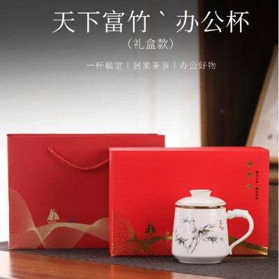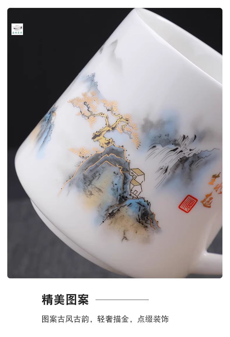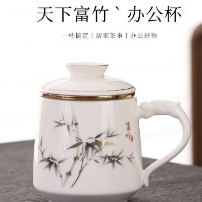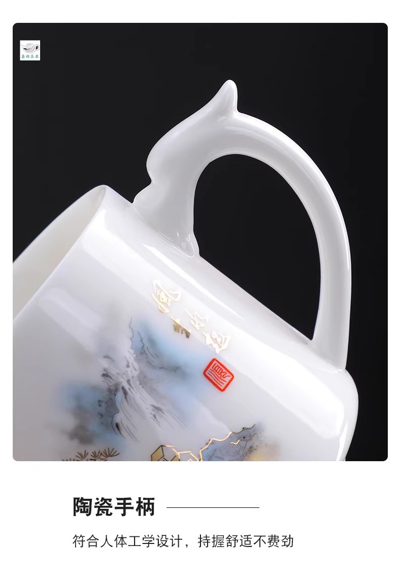 茶杯三件套陶瓷办公杯羊脂玉白瓷办公家用泡茶杯茶水分离马克杯