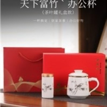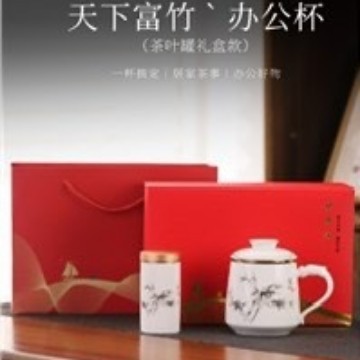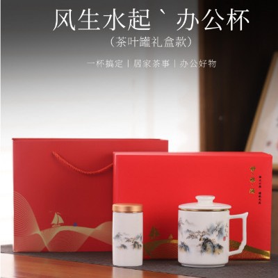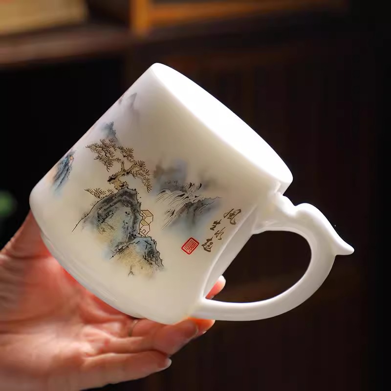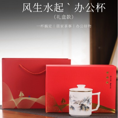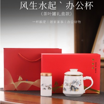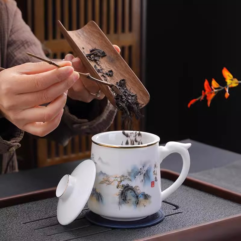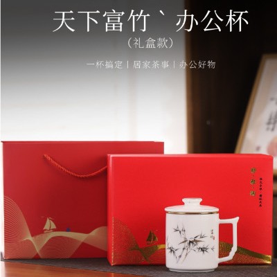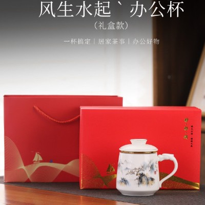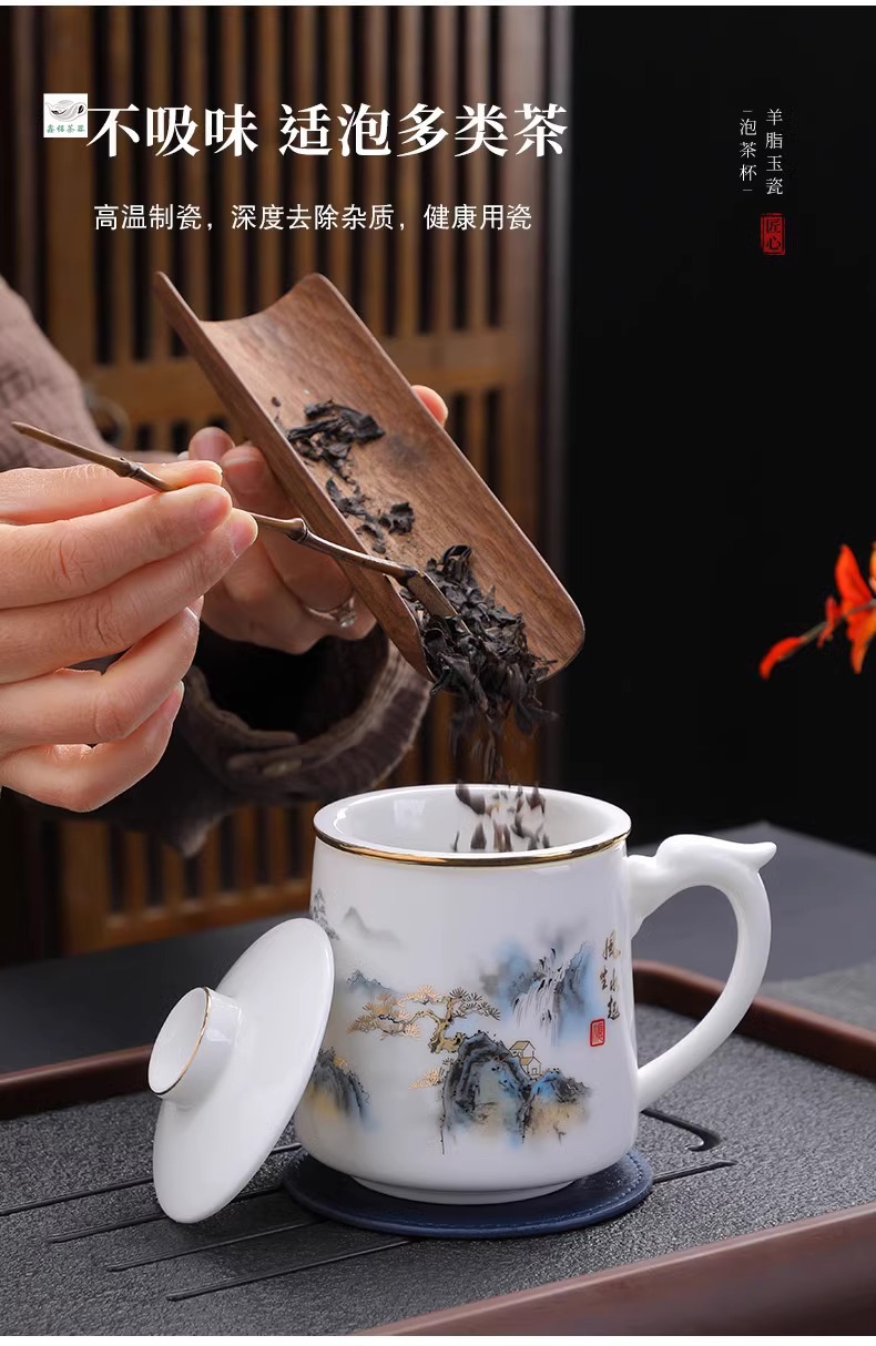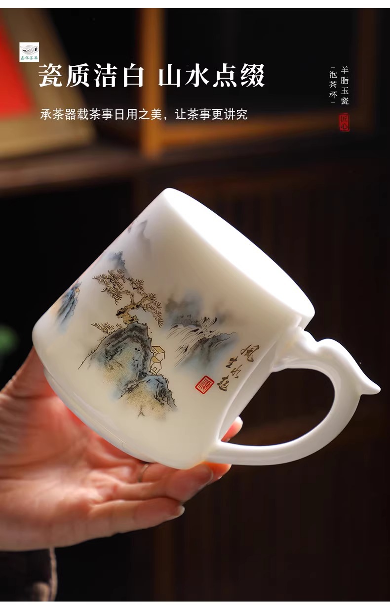 茶杯三件套陶瓷办公杯羊脂玉白瓷办公家用泡茶杯茶水分离马克杯