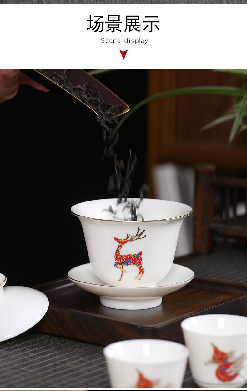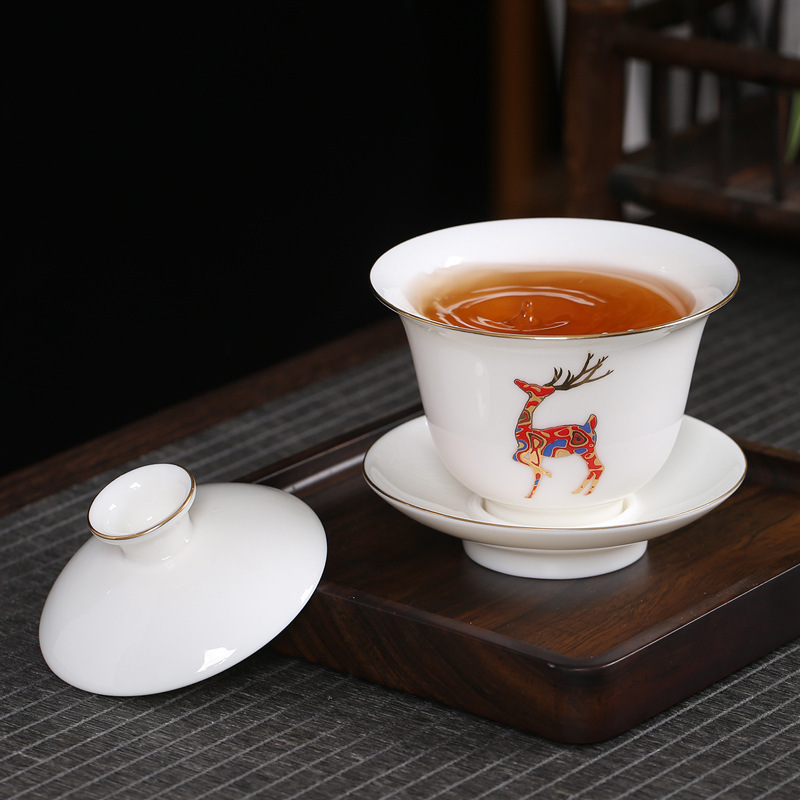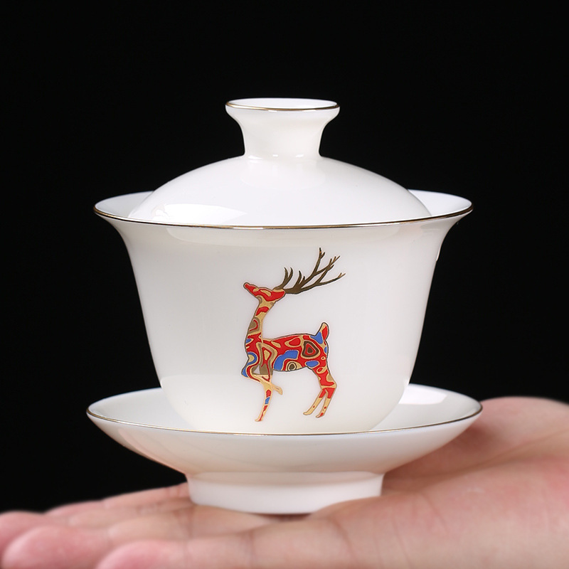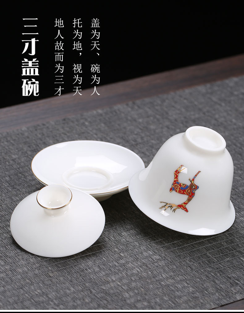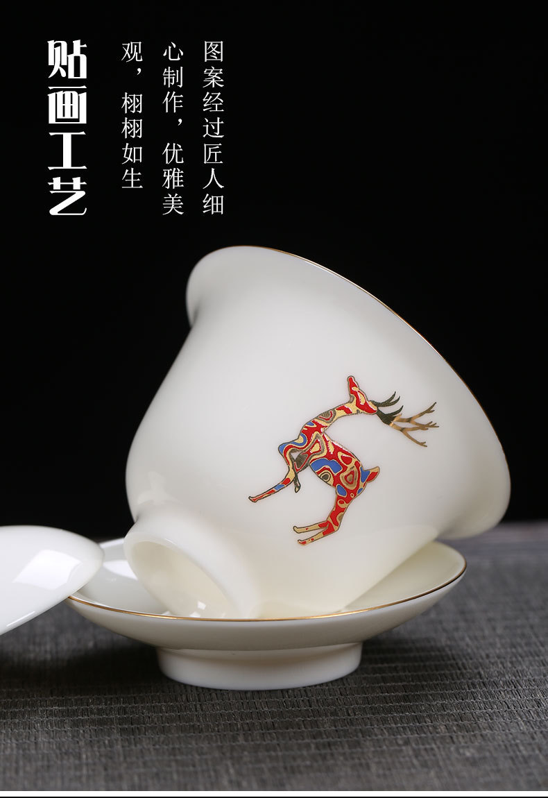 3.8寸羊脂玉白瓷盖碗手绘功夫茶具泡茶碗陶瓷三才盖碗茶杯盖杯喝