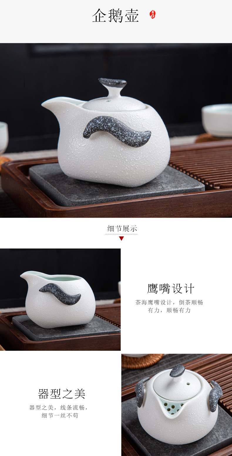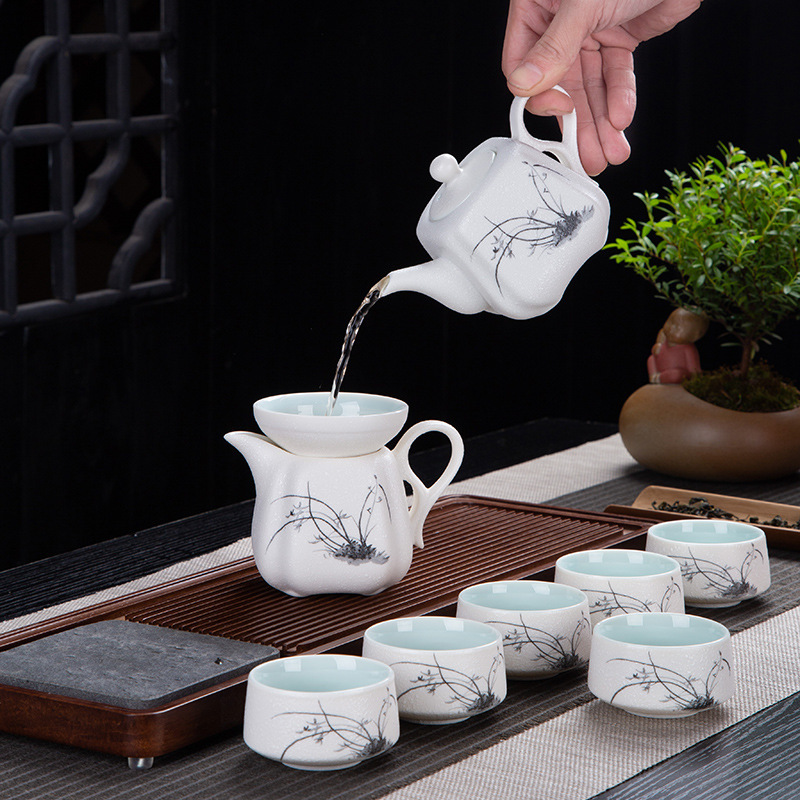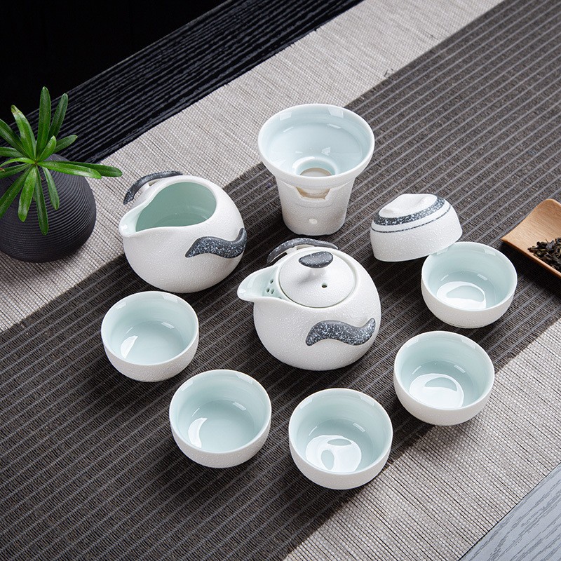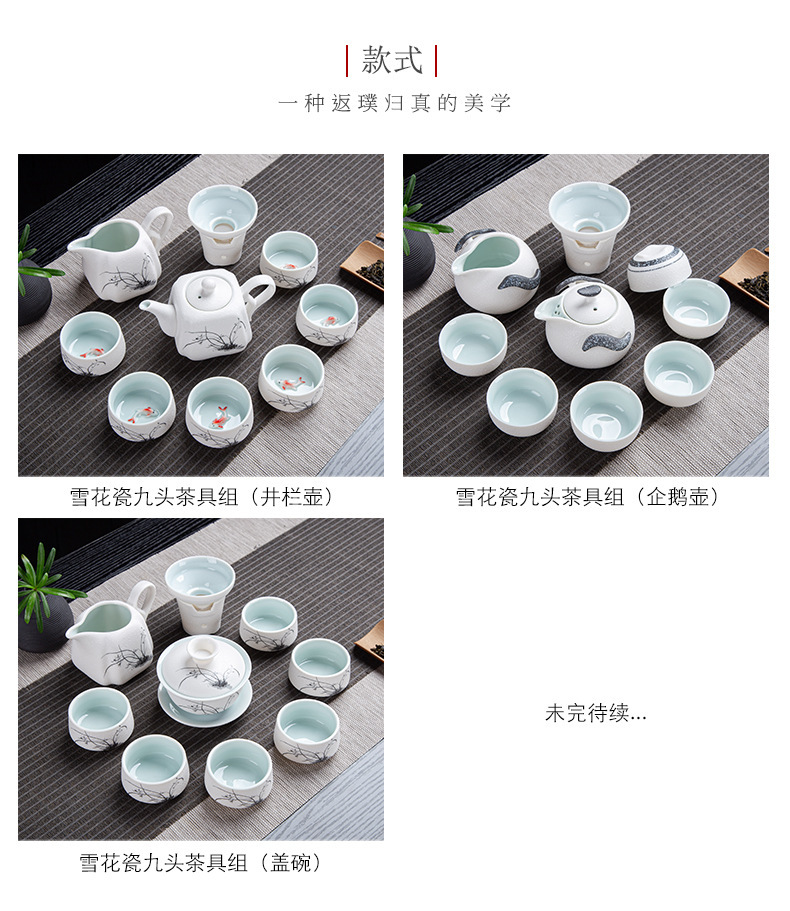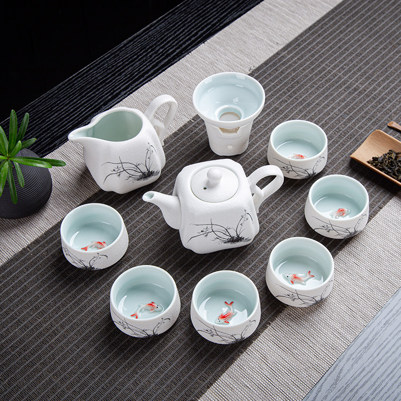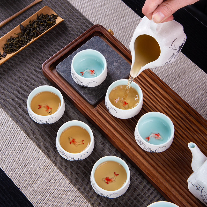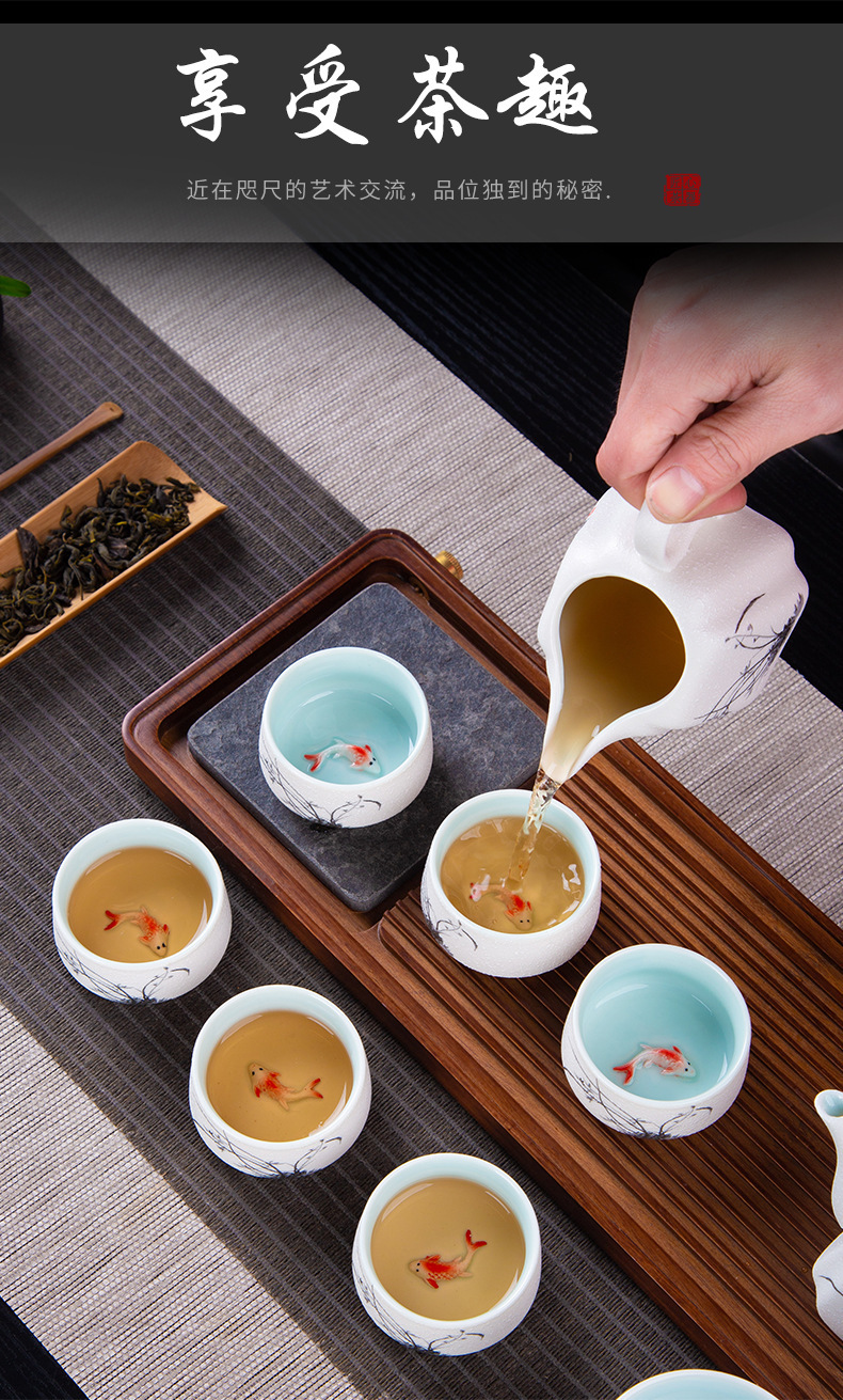 茶具套装雪花釉整套功夫茶具年年有鱼礼品办公室陶瓷家用泡茶壶