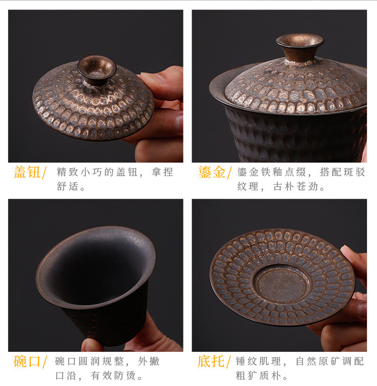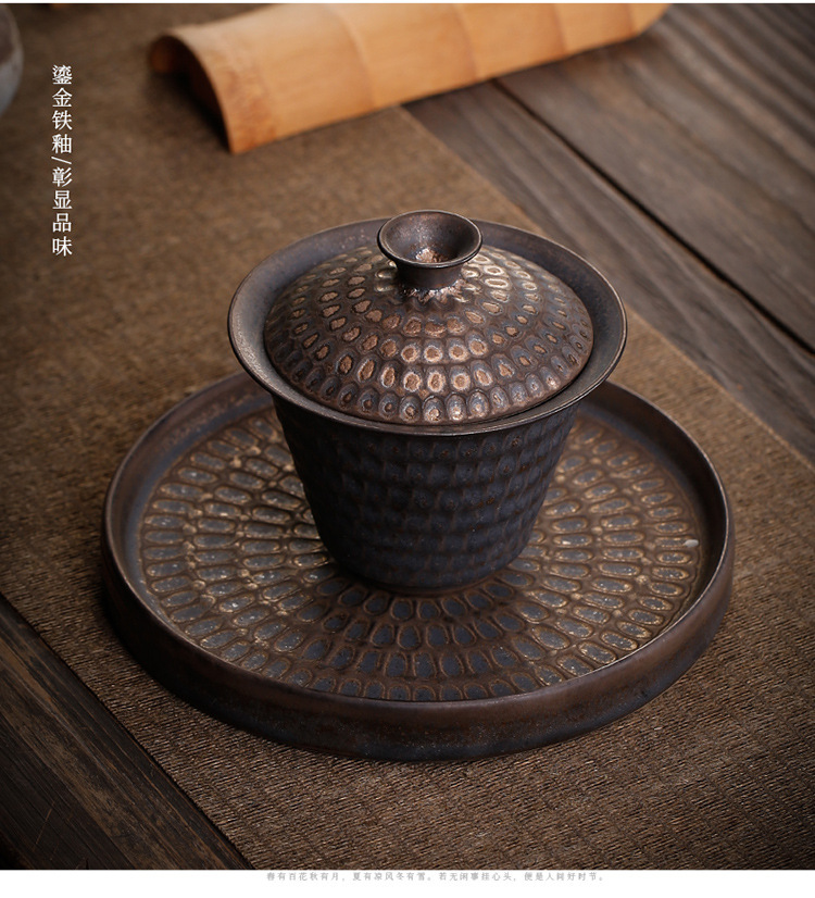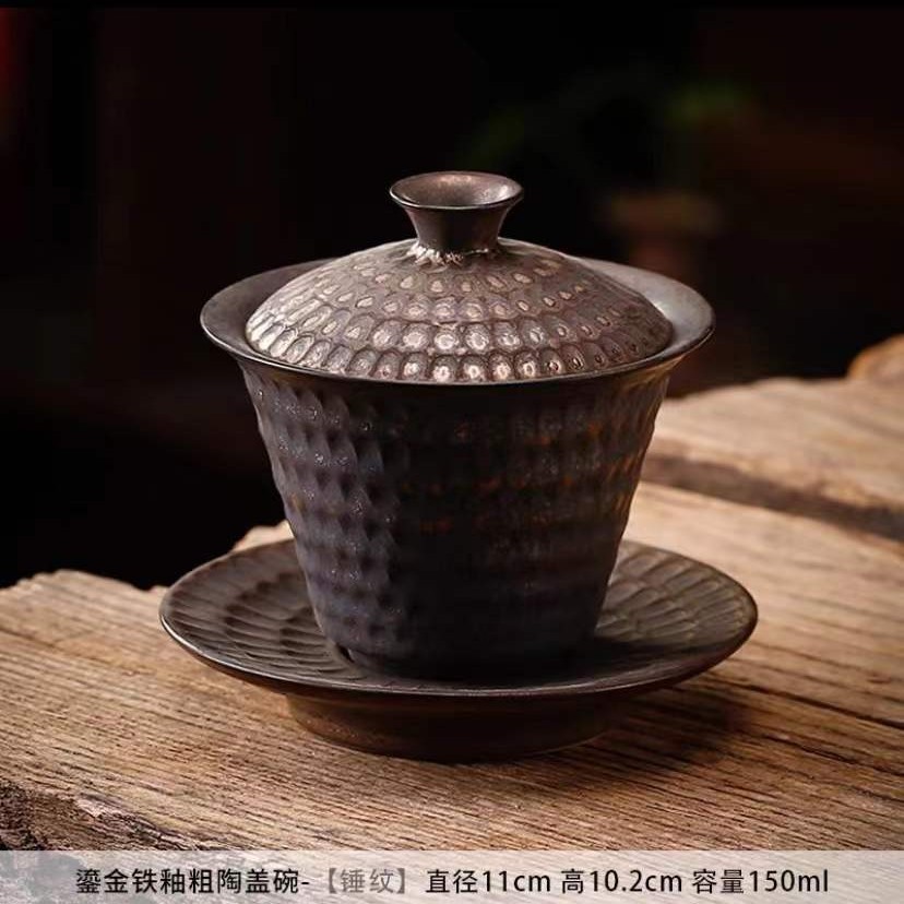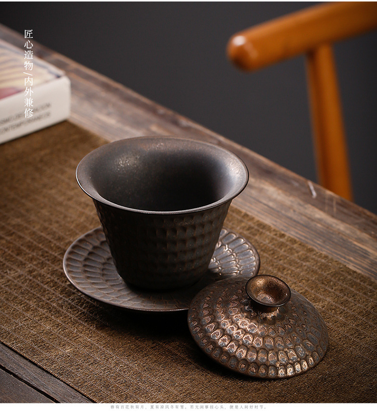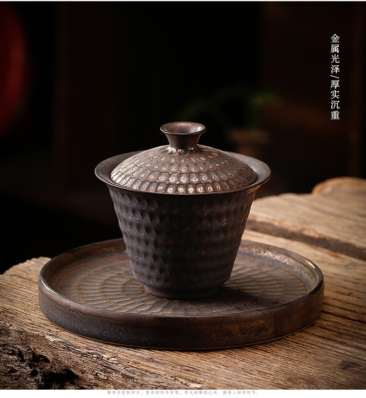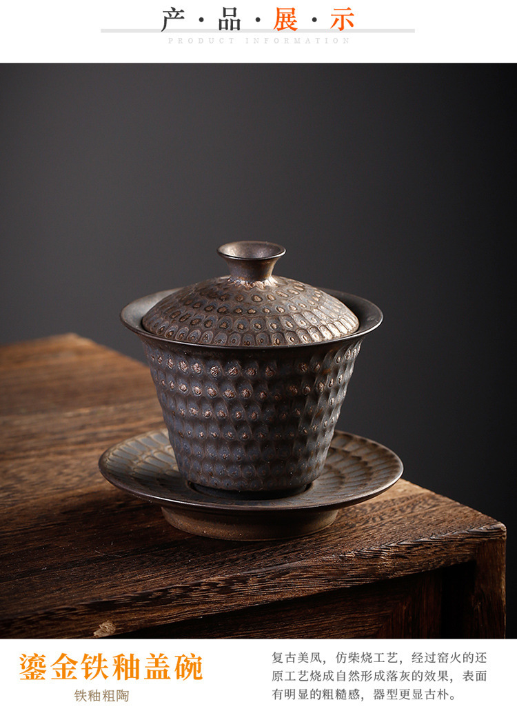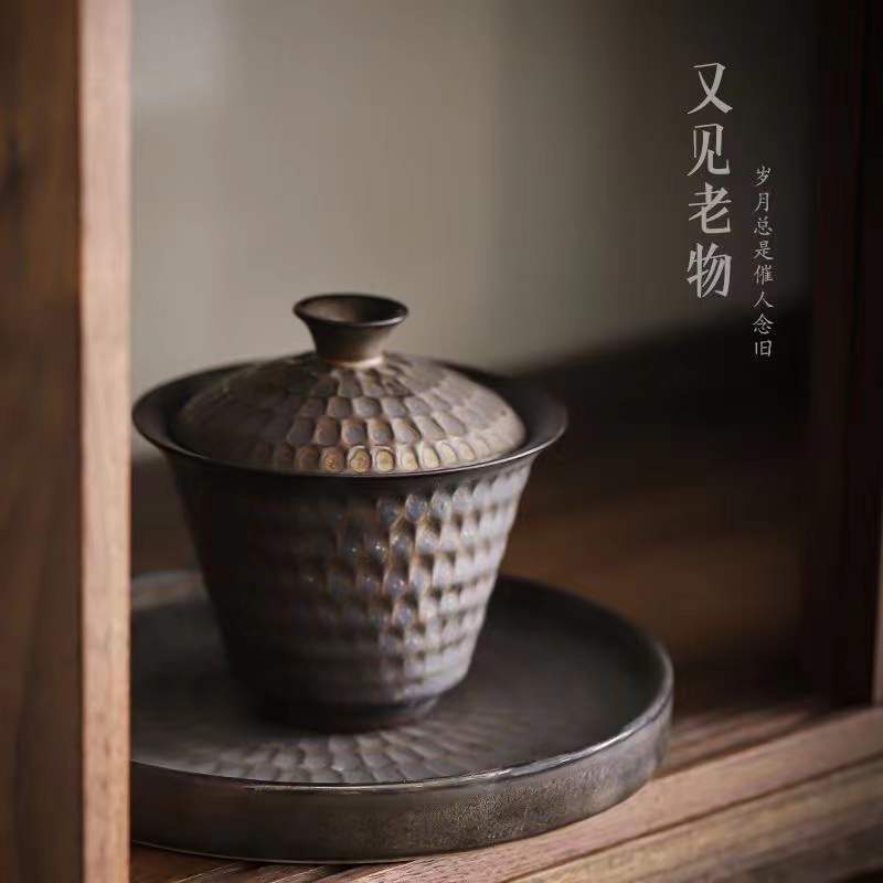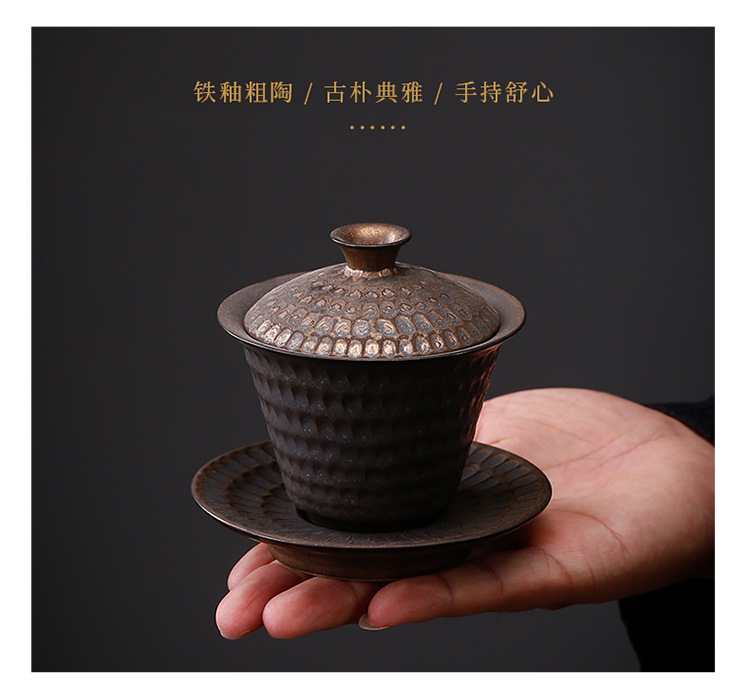 仿古三才盖碗茶杯单个功夫茶具铁锈釉中式家用泡茶碗不烫手冲茶器