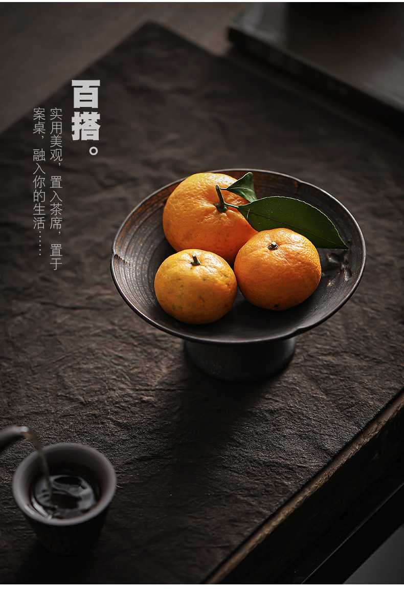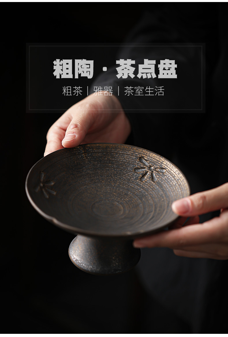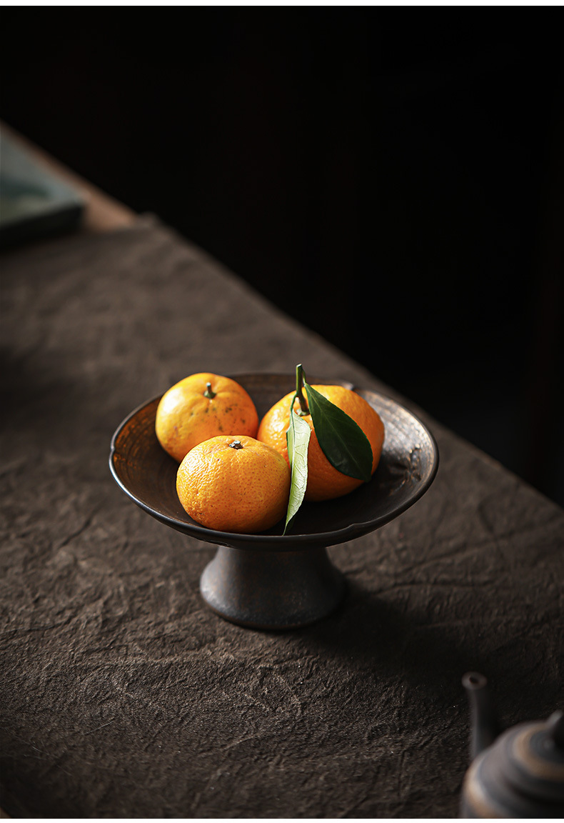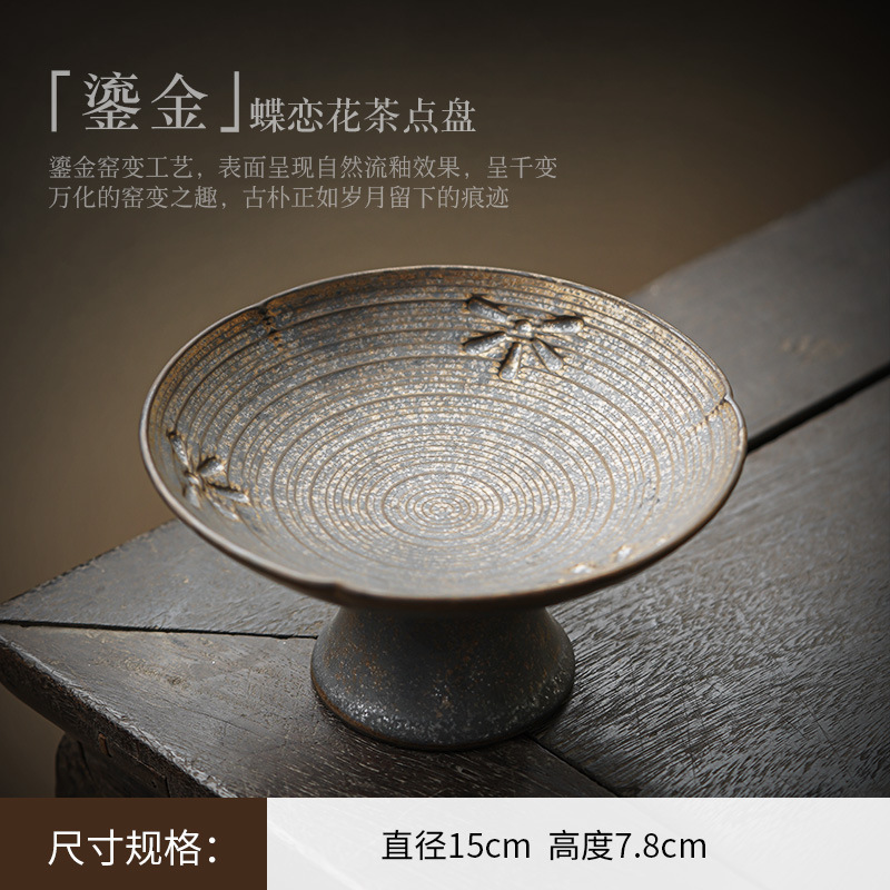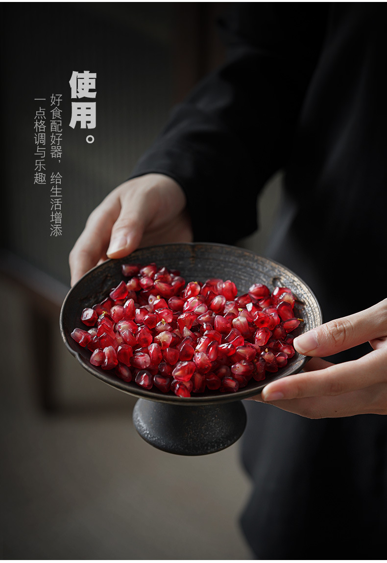 粗陶高脚水果盘复古鎏金釉盘子家用干果碟酒店餐厅蛋糕托盘花纹