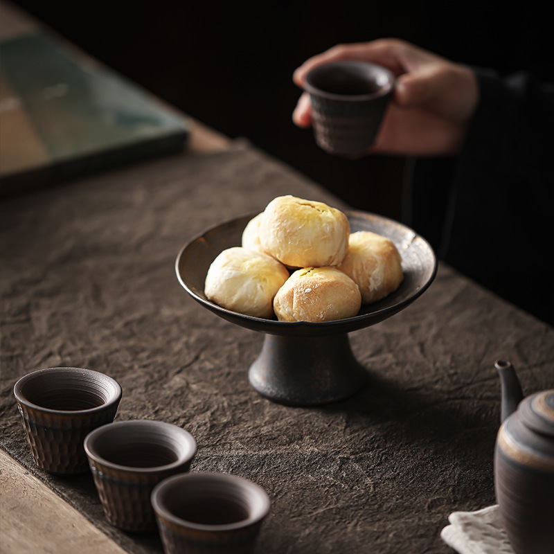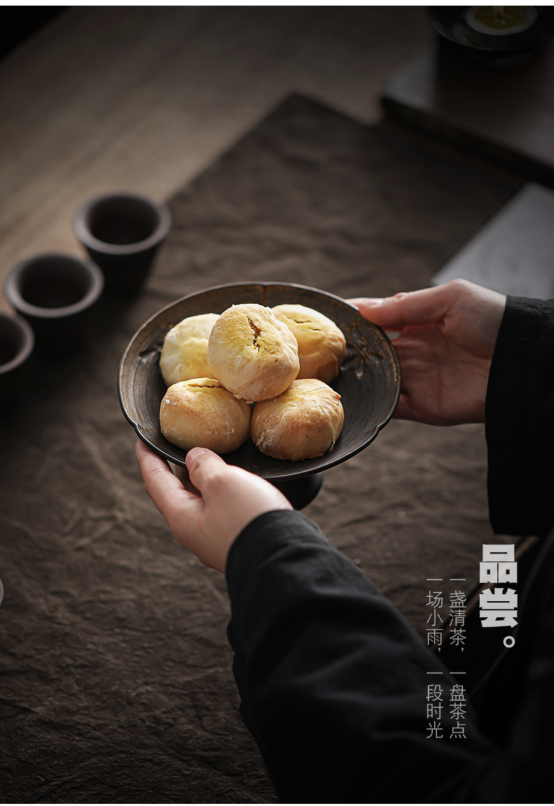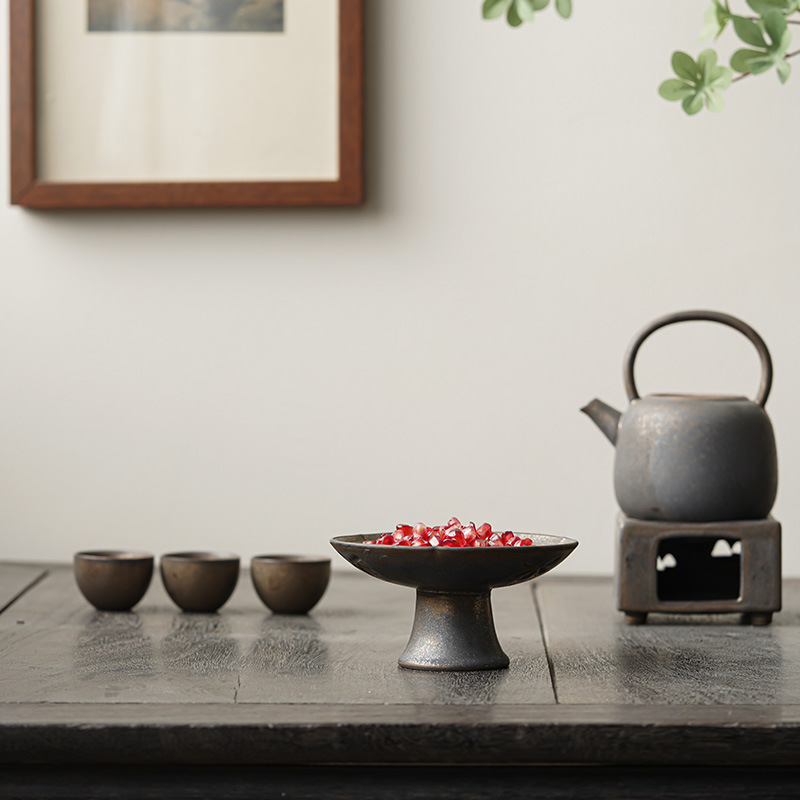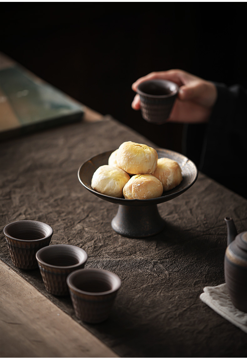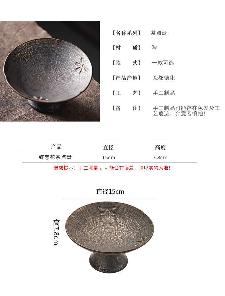 粗陶高脚水果盘复古鎏金釉盘子家用干果碟酒店餐厅蛋糕托盘花纹