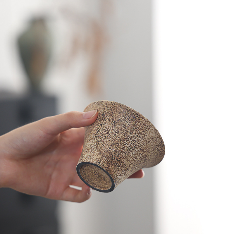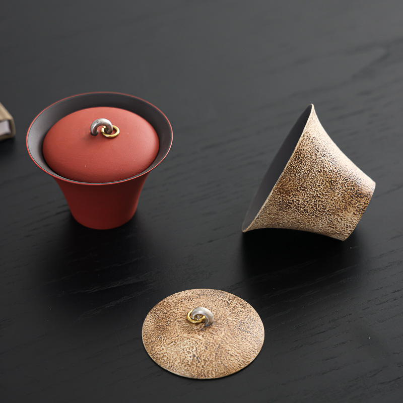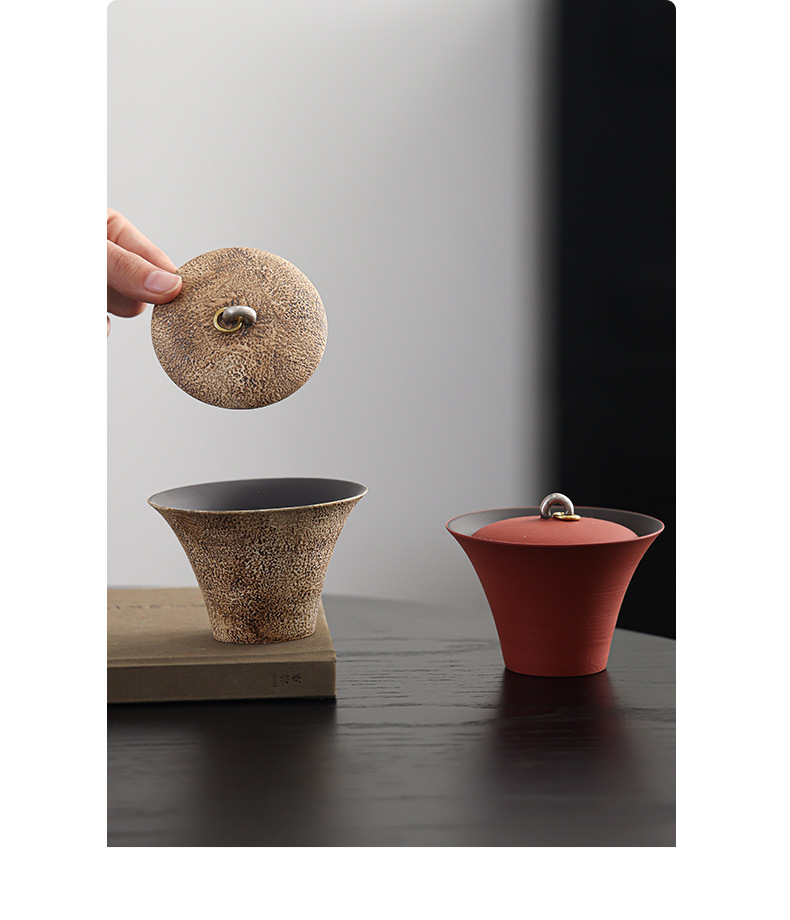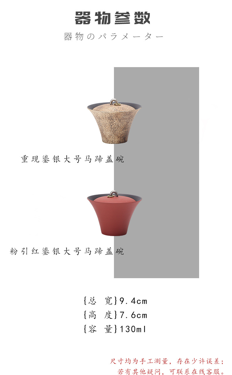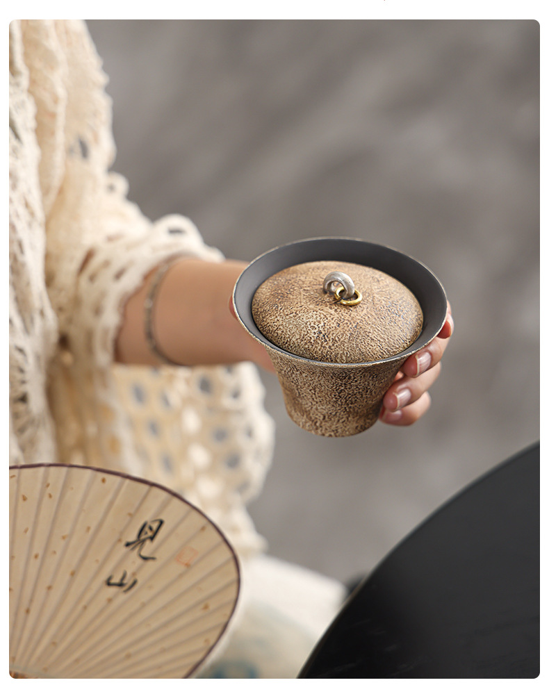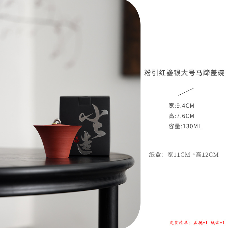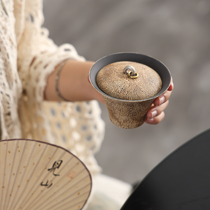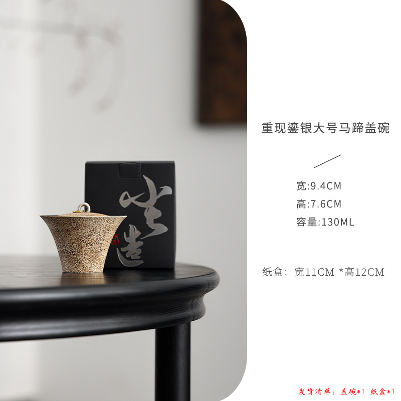 陶瓷手工重现做旧粉引马蹄盖碗轻奢高温落灰功夫茶具鎏银茶碗高端