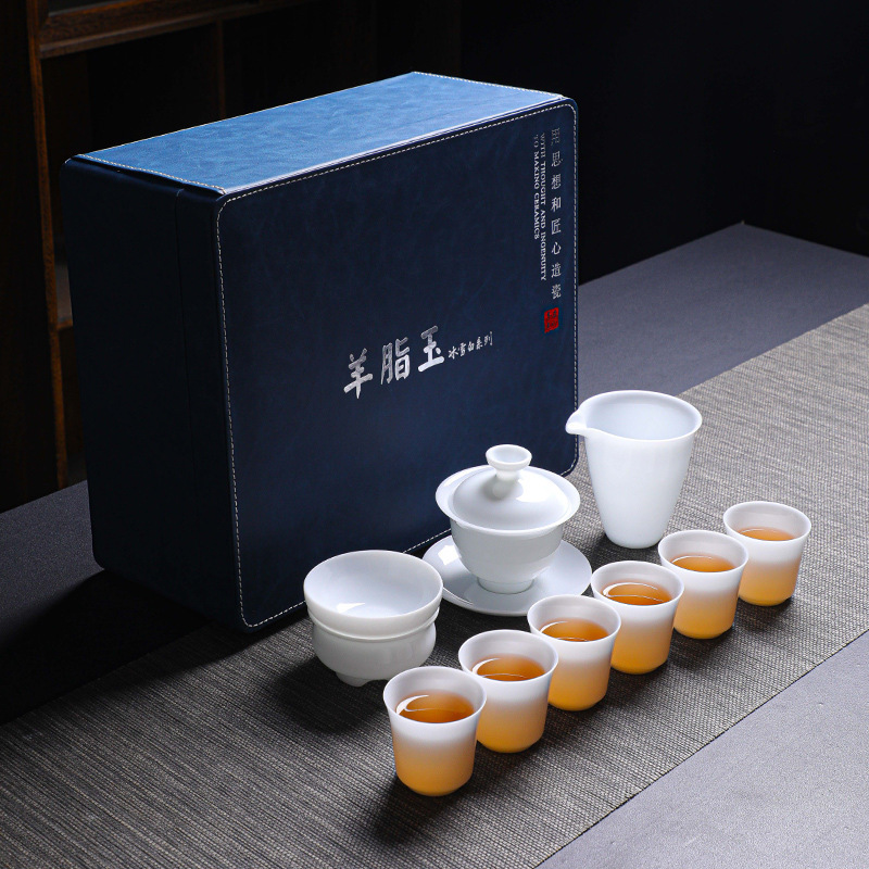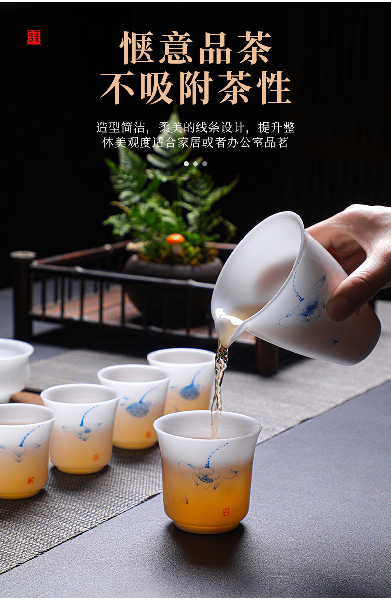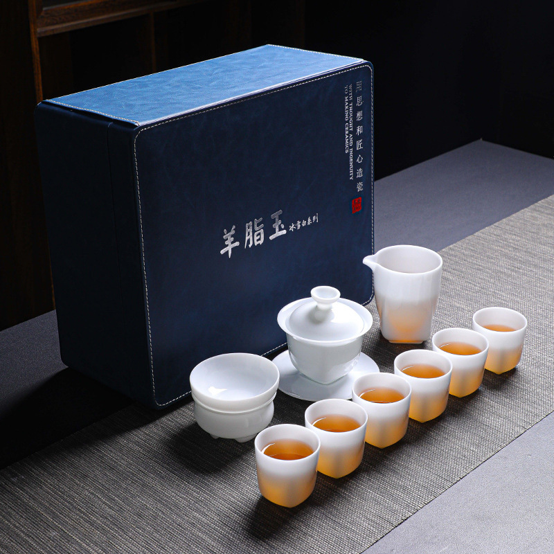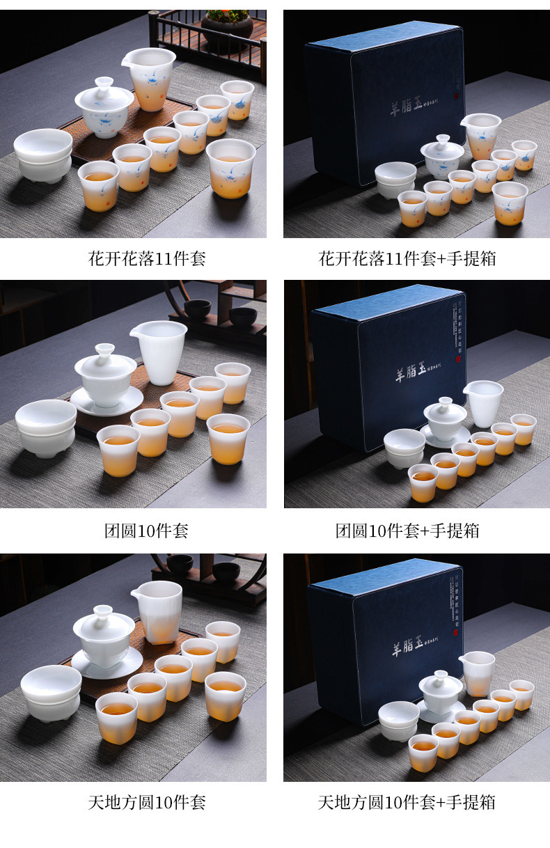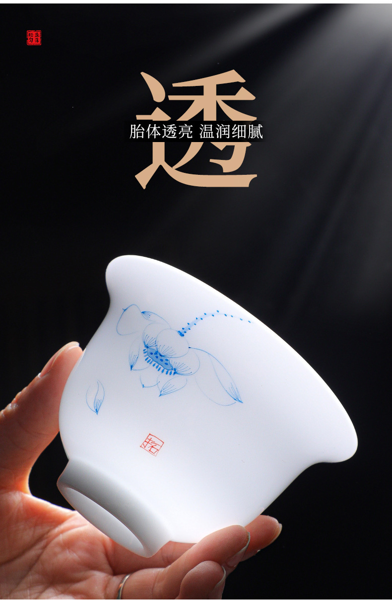 手绘莲花冰种玉功夫茶具套装高档轻奢羊脂玉白瓷盖碗企业商务送礼