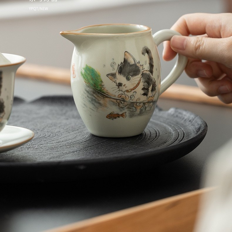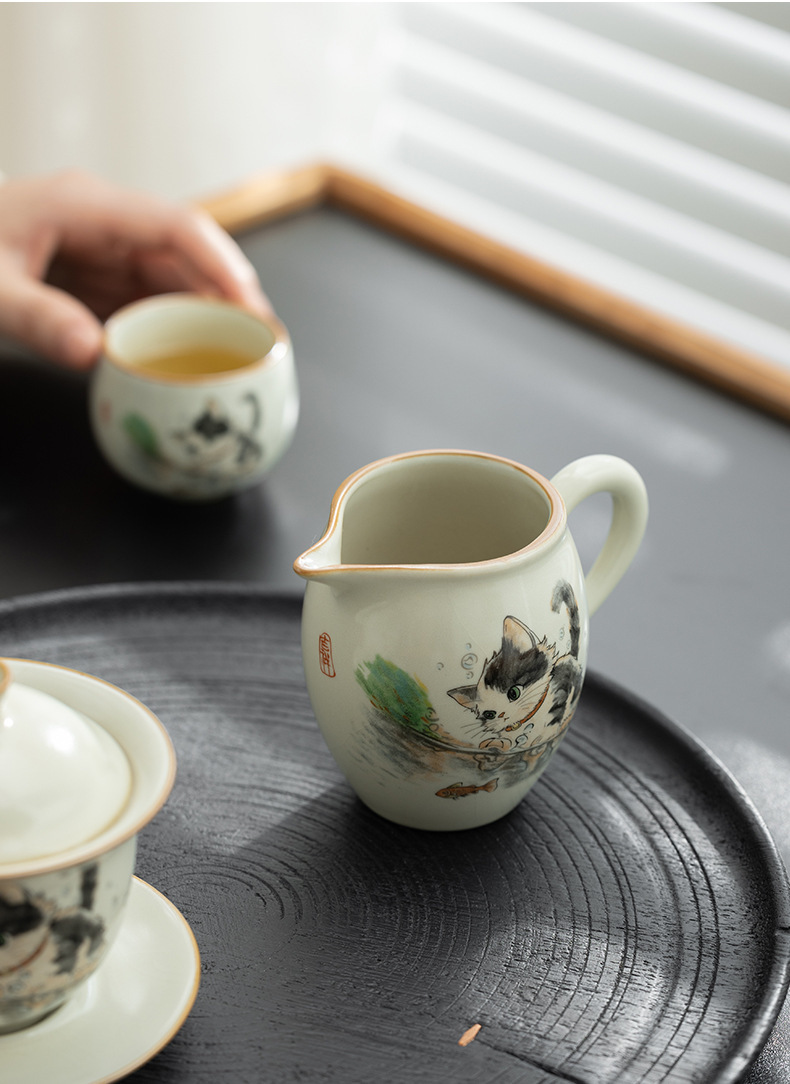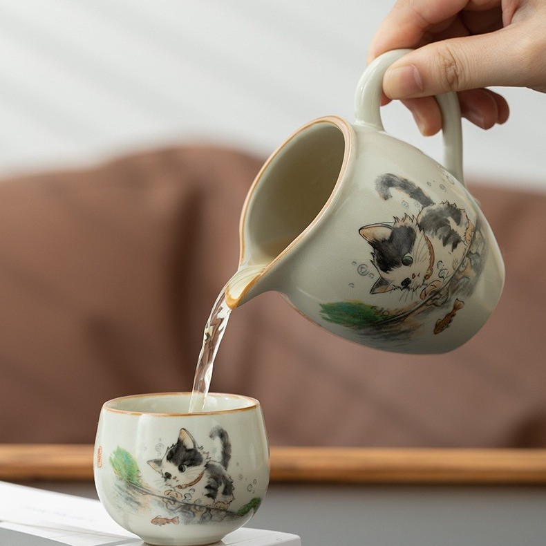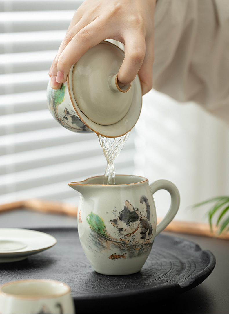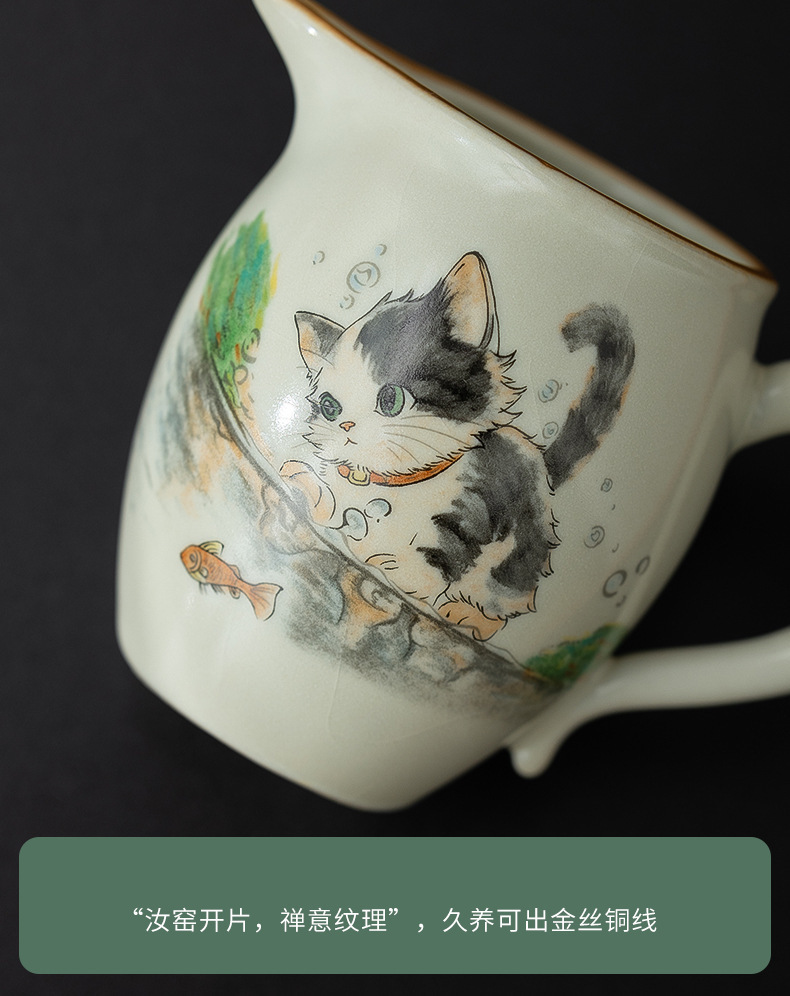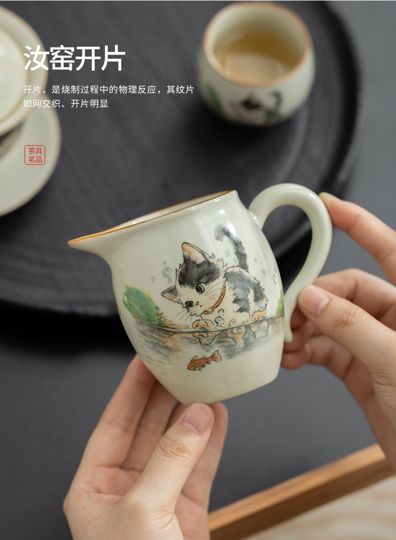 汝窑萌猫三才盖碗高档单个茶杯带盖防烫陶瓷茶具泡茶碗可印制LOGO