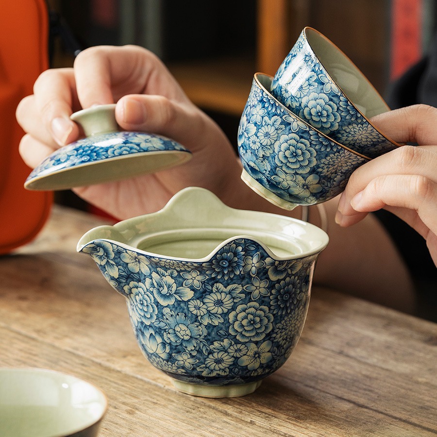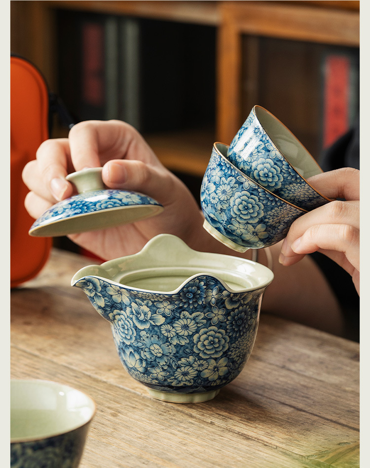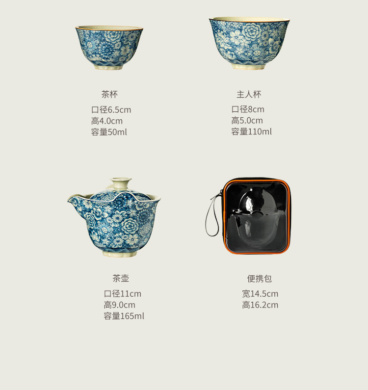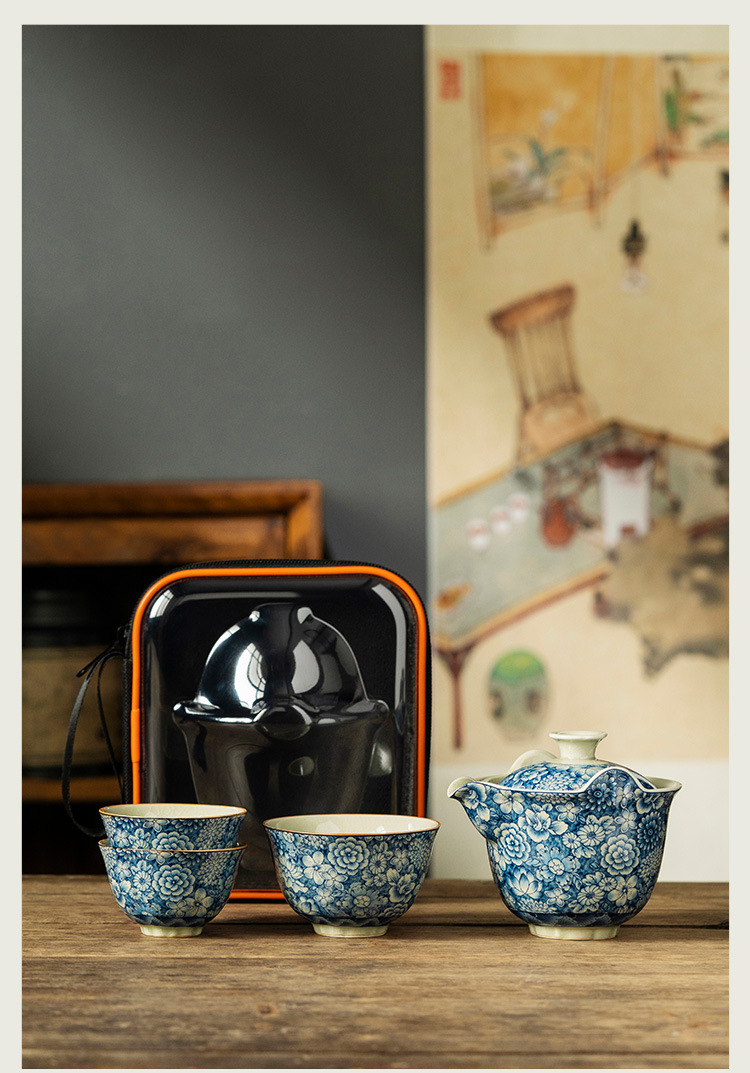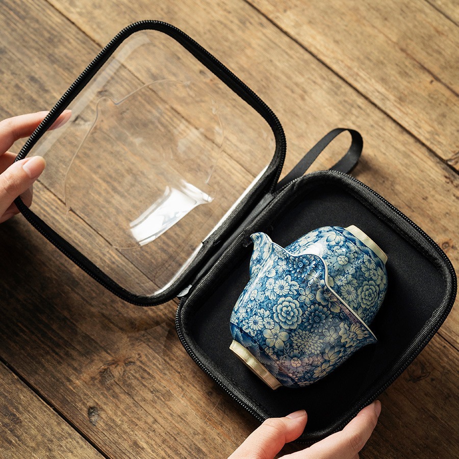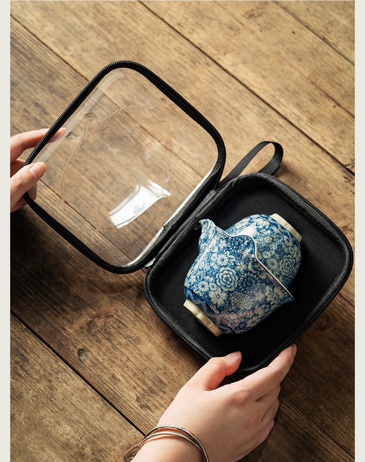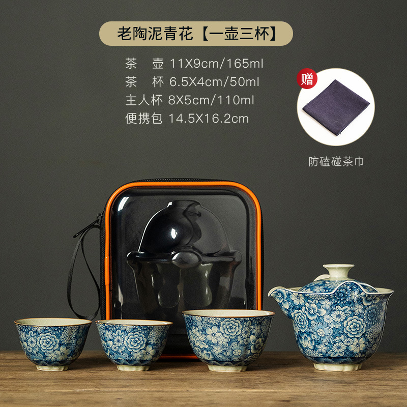 老陶泥青花旅行茶具套装便携式快客杯随身包一壶二杯伴手礼定 制